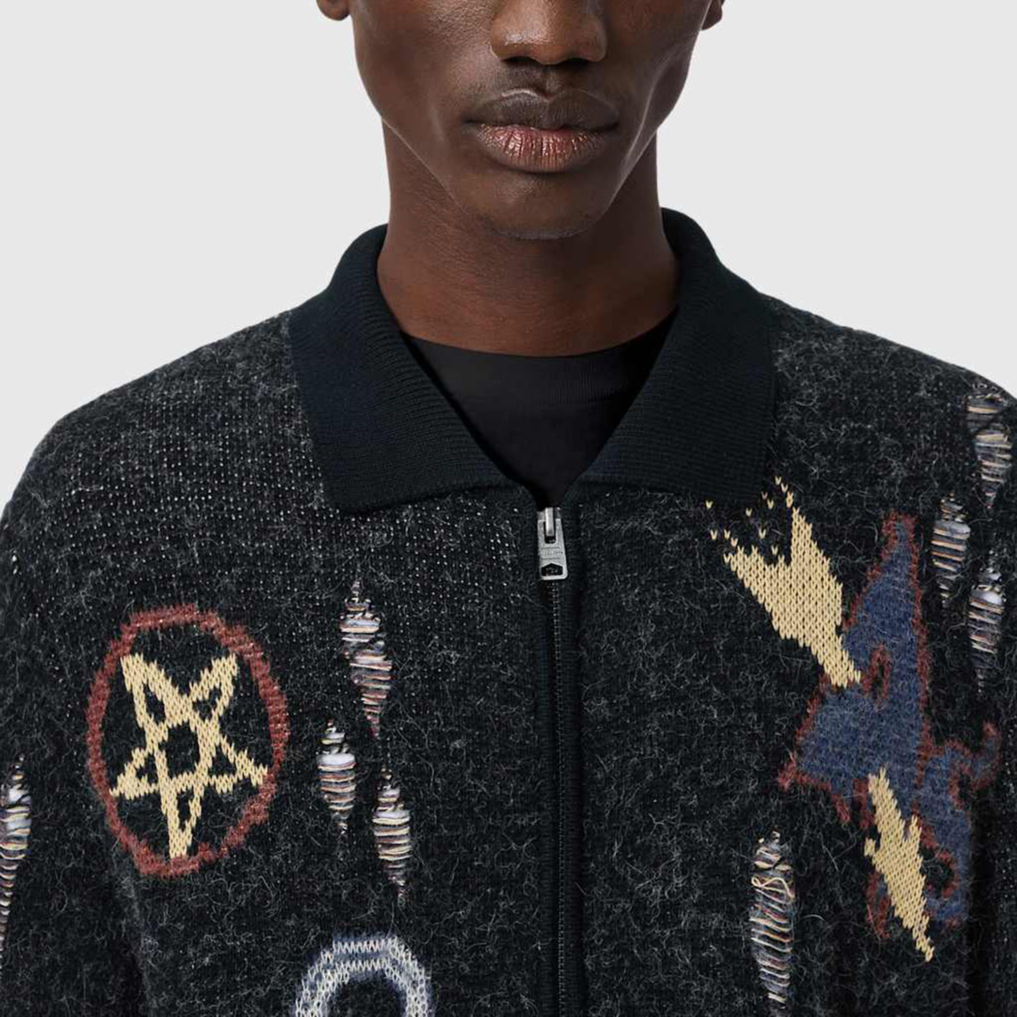 - All-over graphic design jacquard, ladders and damages details, flat polo collar, zip-up fastening