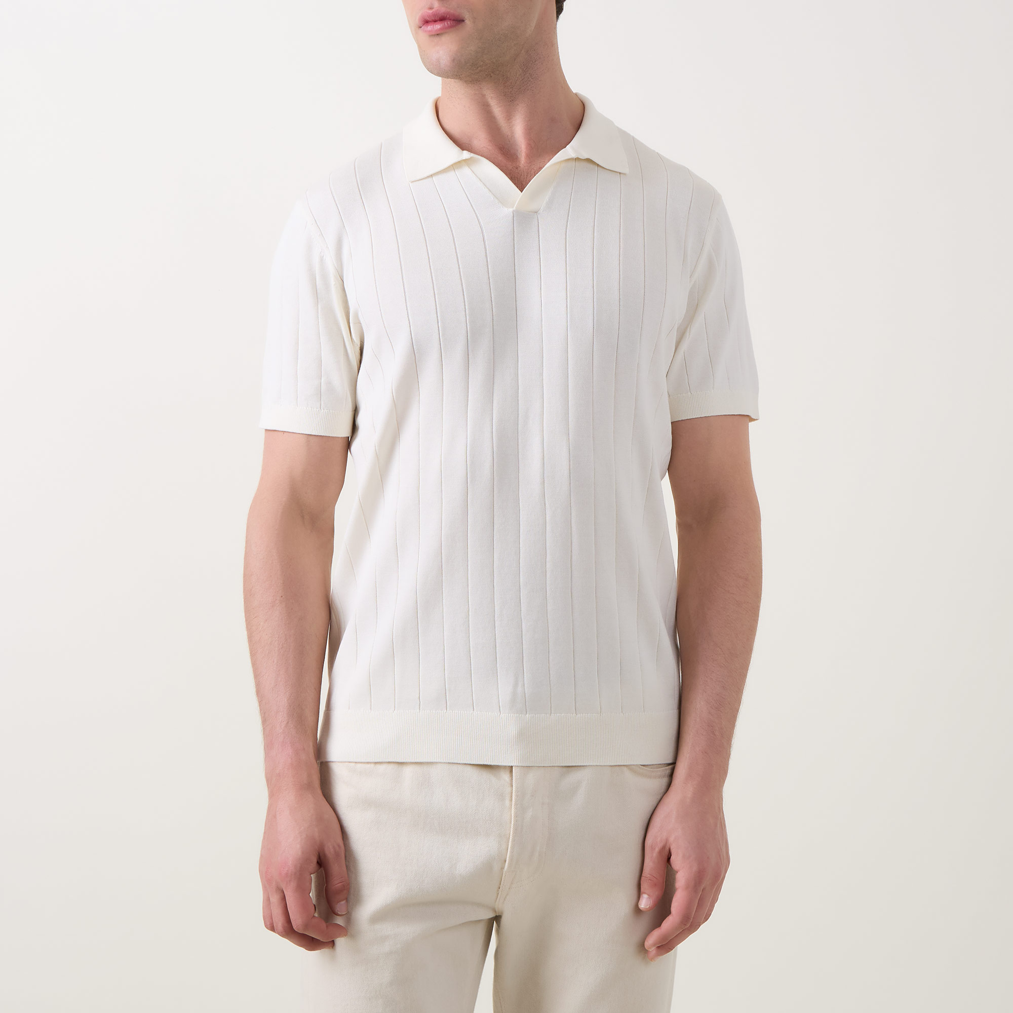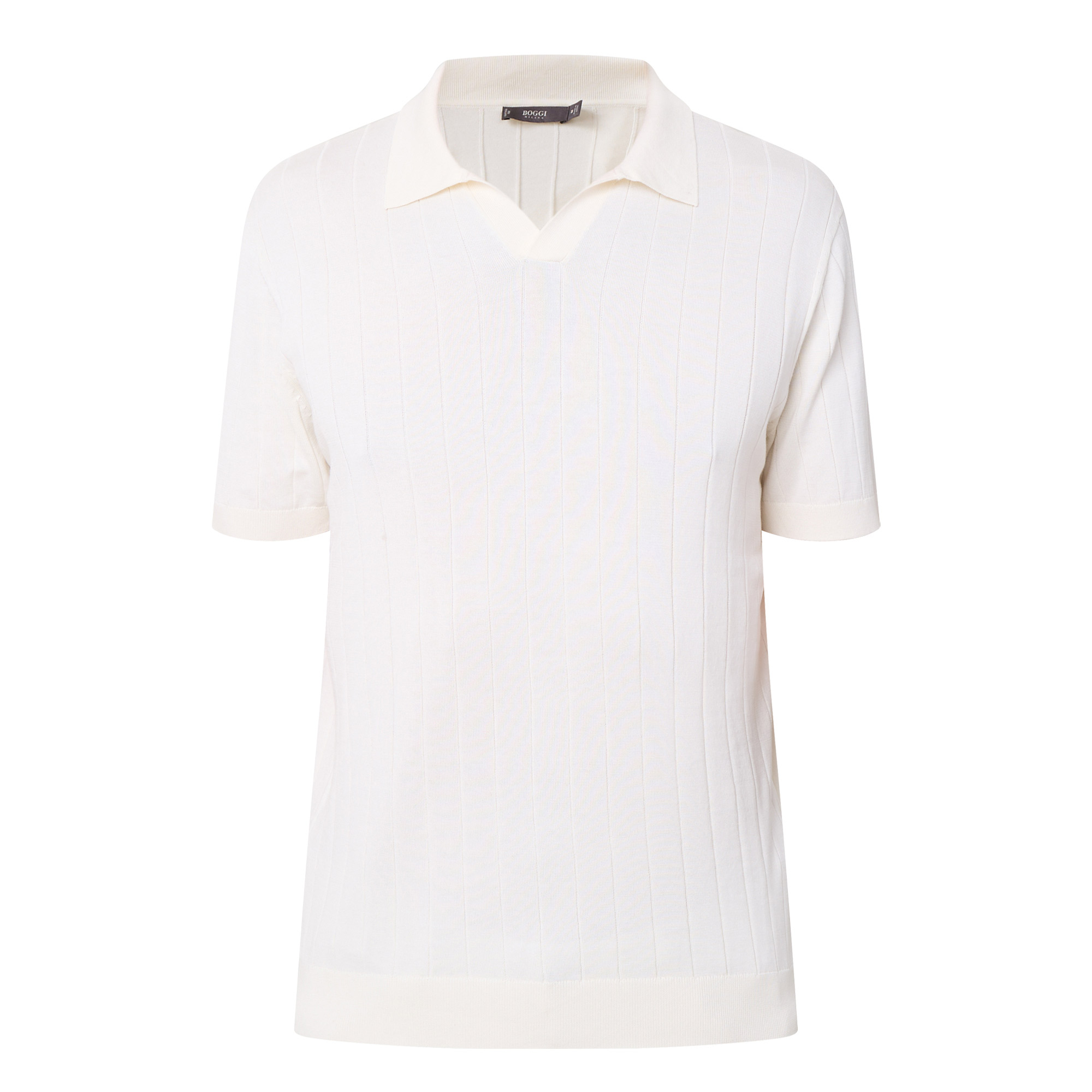 - Polo collar, V-neckline, short sleeves, straight hem, ribbed trims, ribbed construction, soft finish
