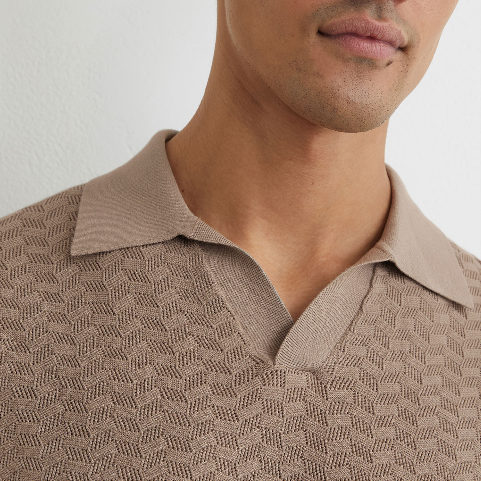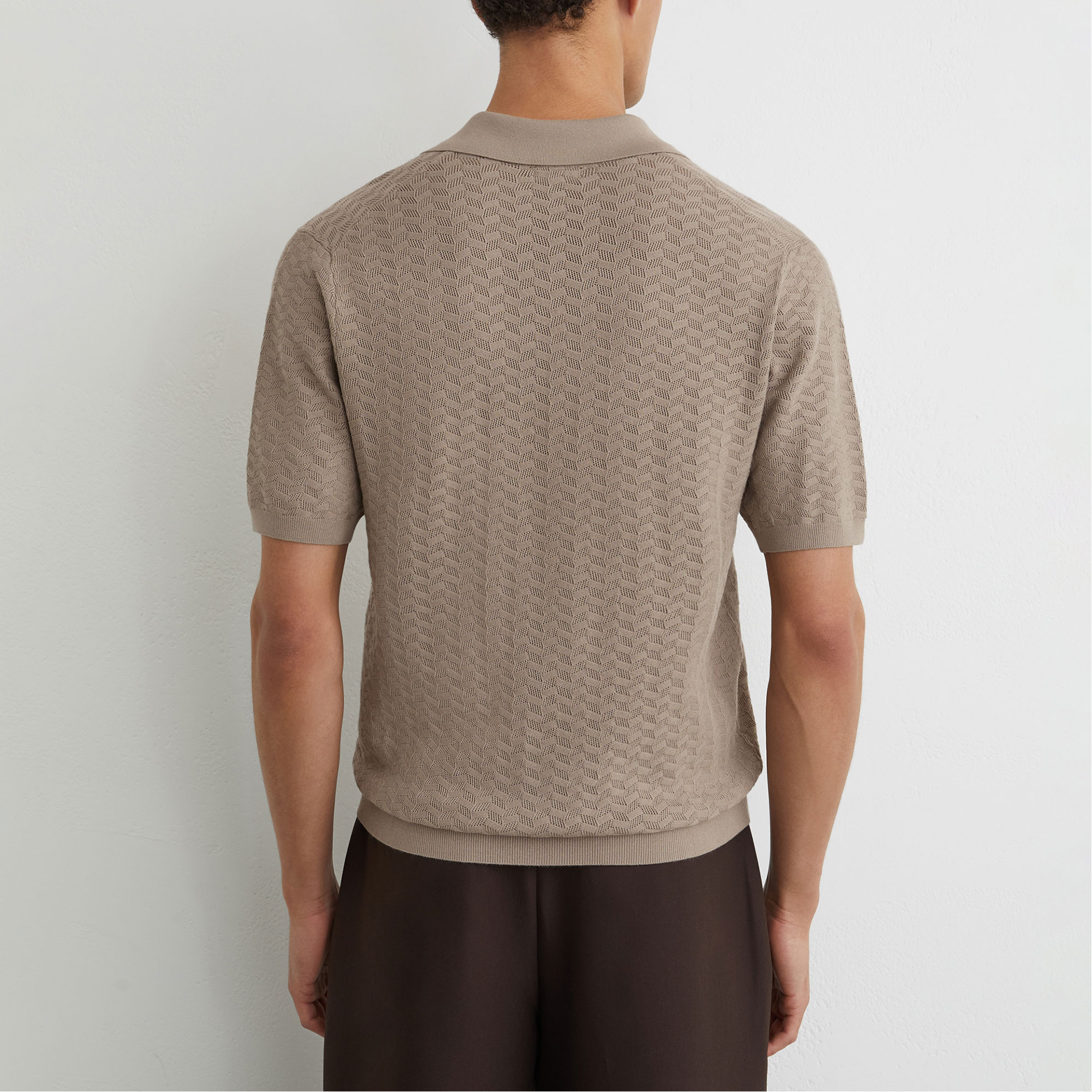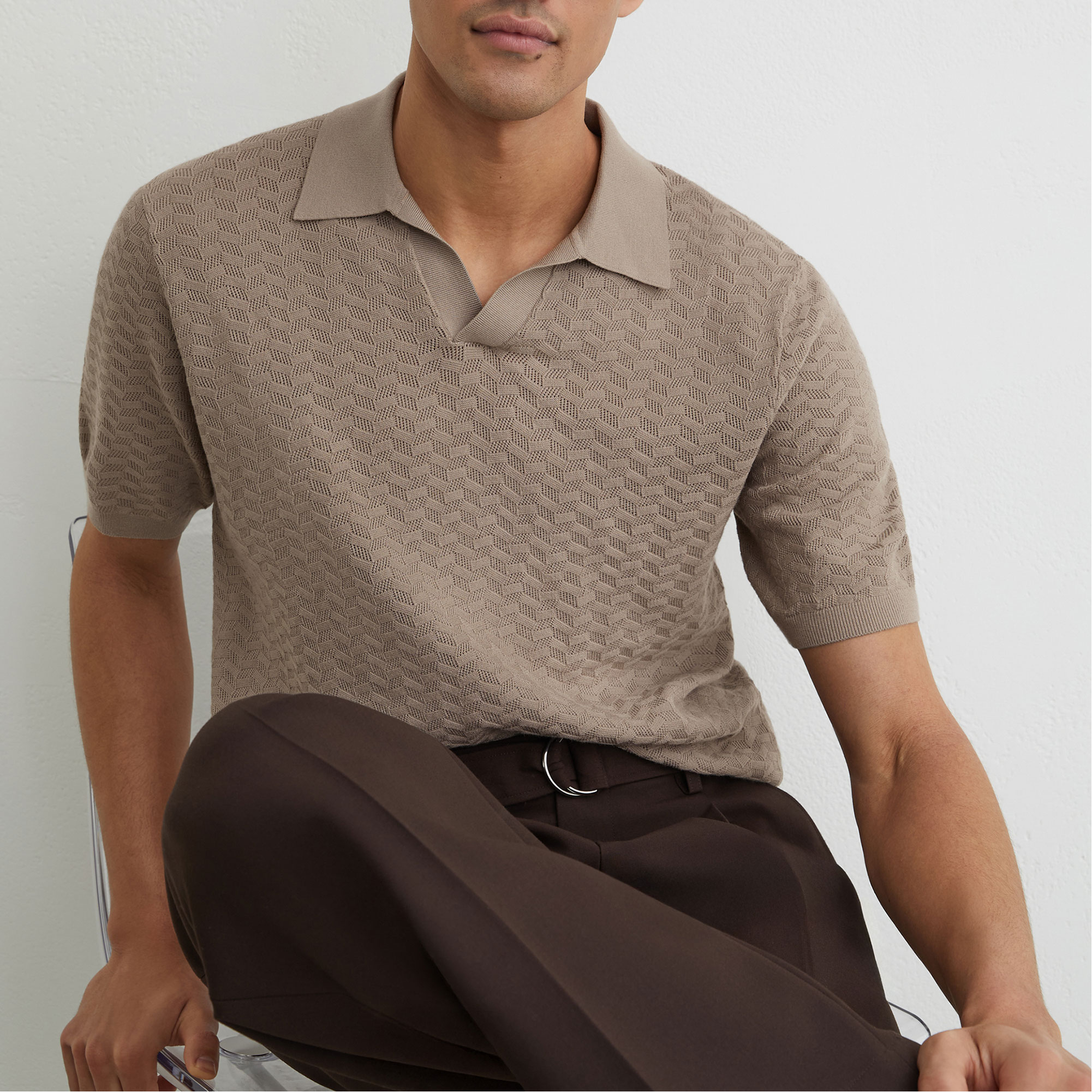 - Open polo collar, short sleeves, ribbed hem and cuffs, textured geometric knit