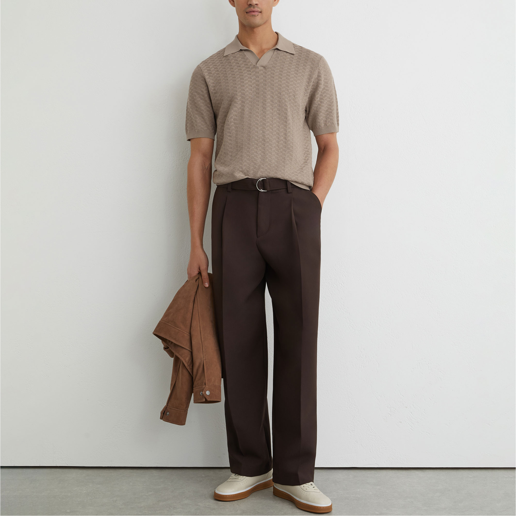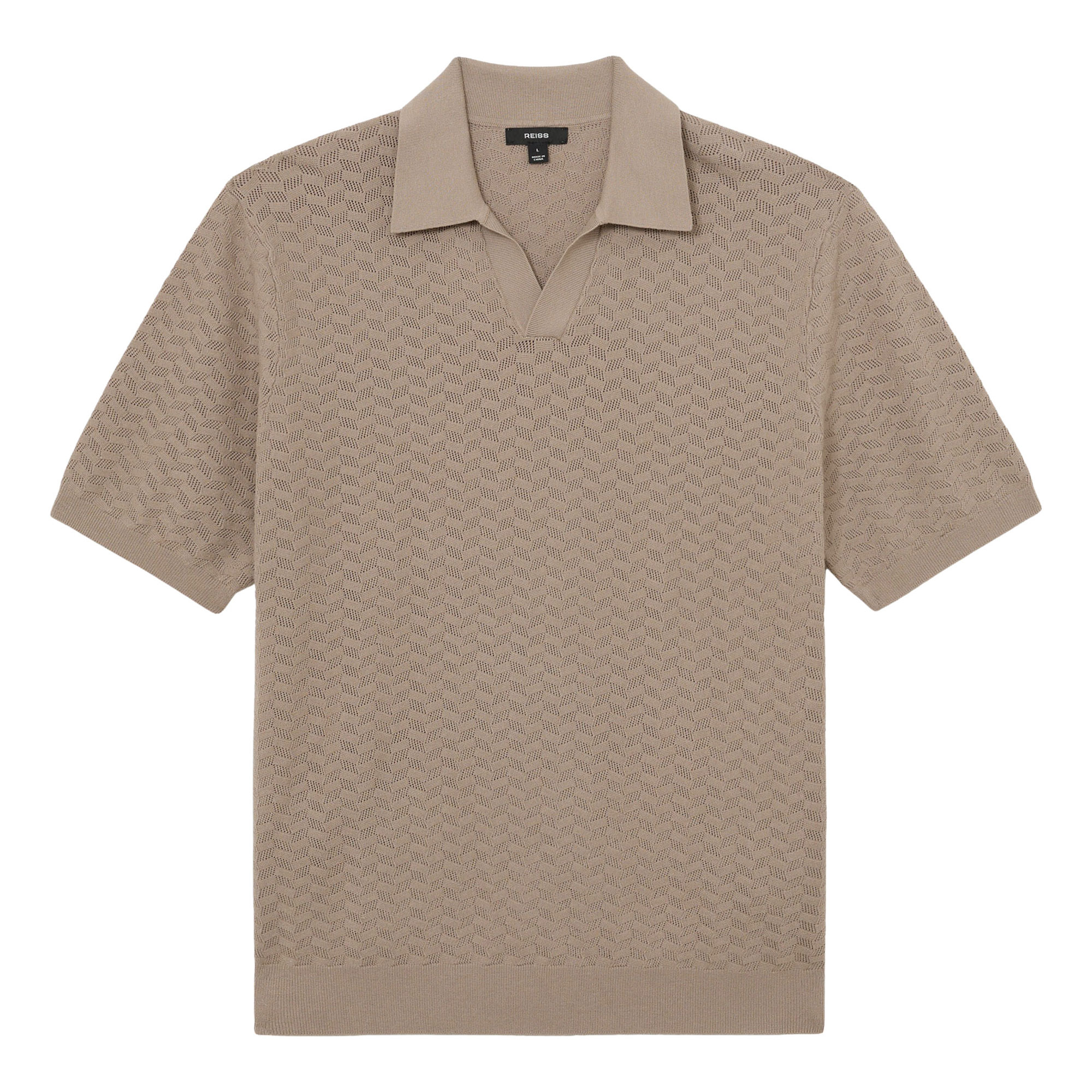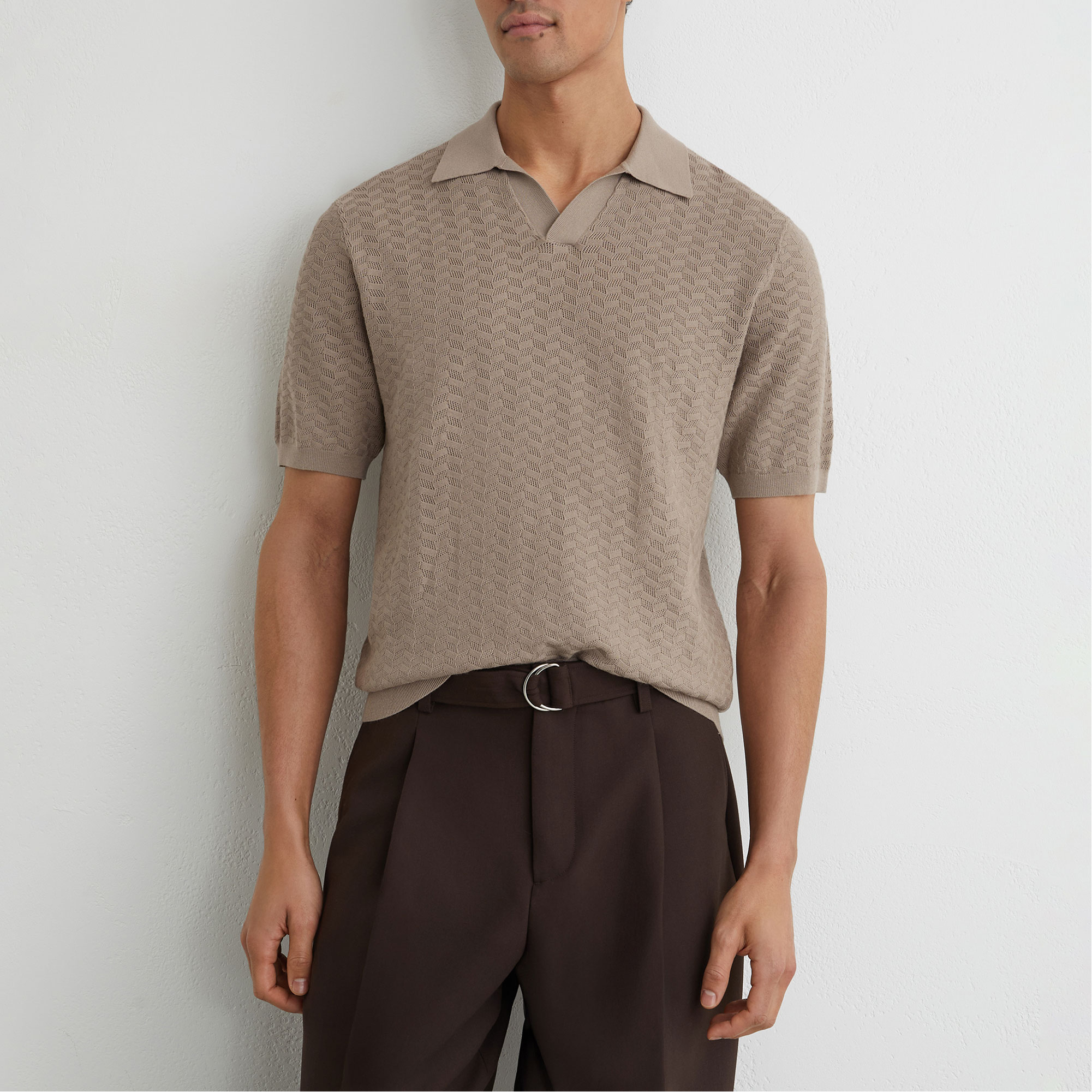 - Open polo collar, short sleeves, ribbed hem and cuffs, textured geometric knit