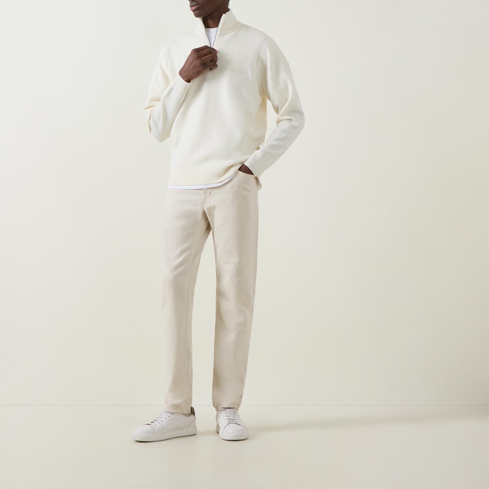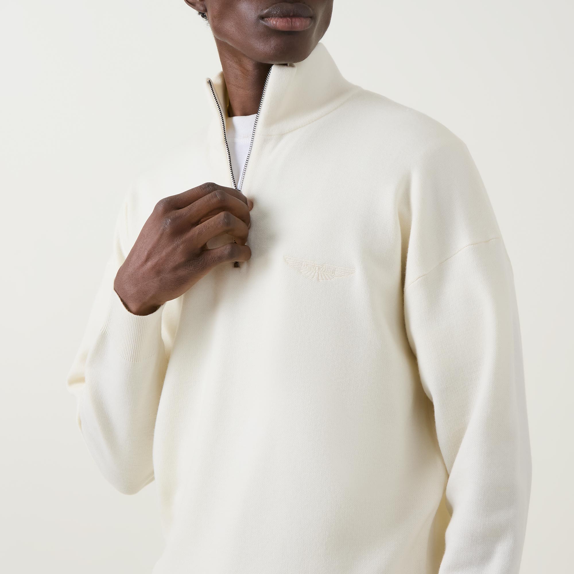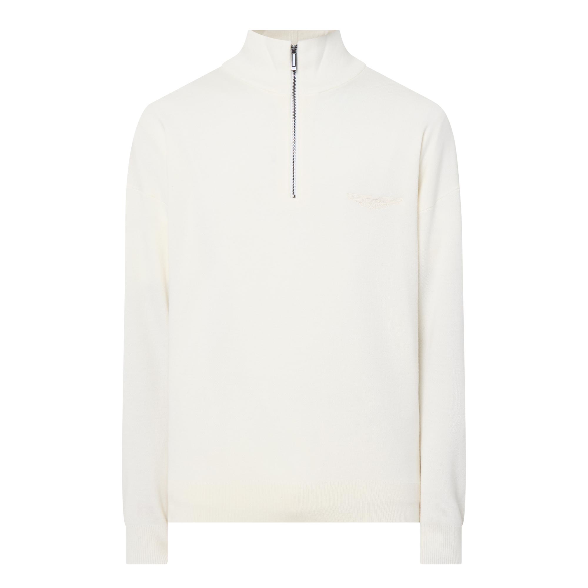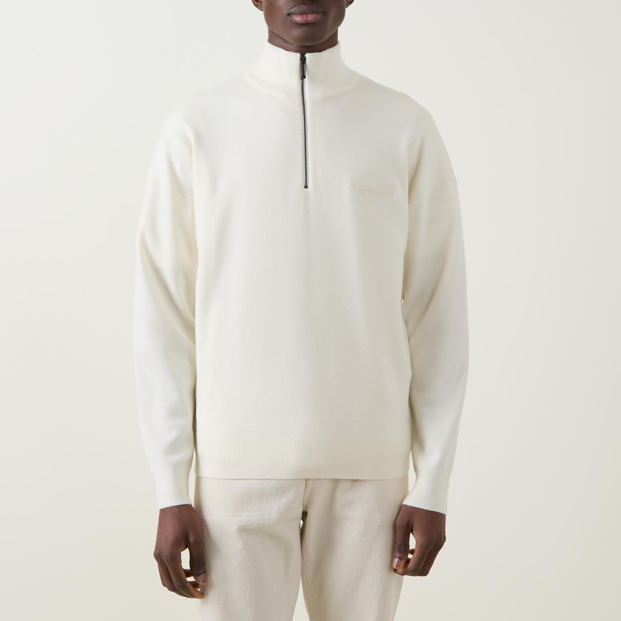 • Funnel neck, half zip fastening, dropped shoulders, long sleeves, straight hem, ribbed trims, tonal logo embroidery on the chest, knit construction