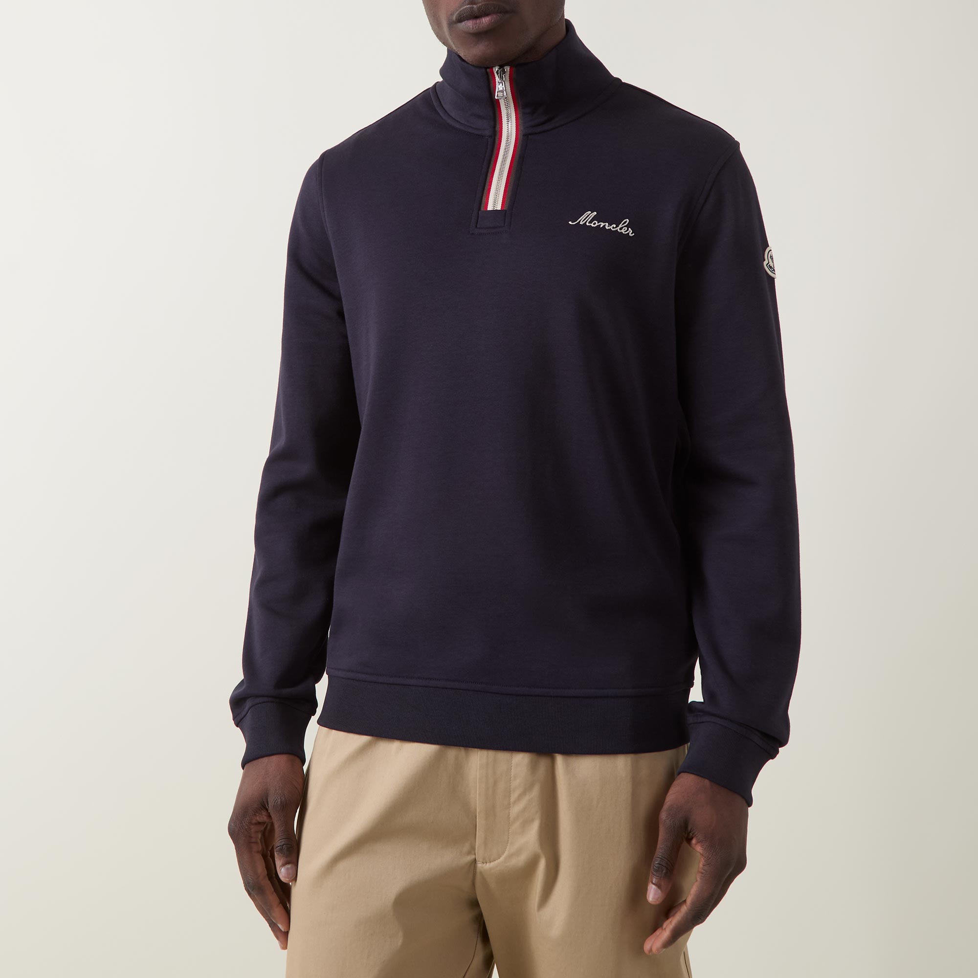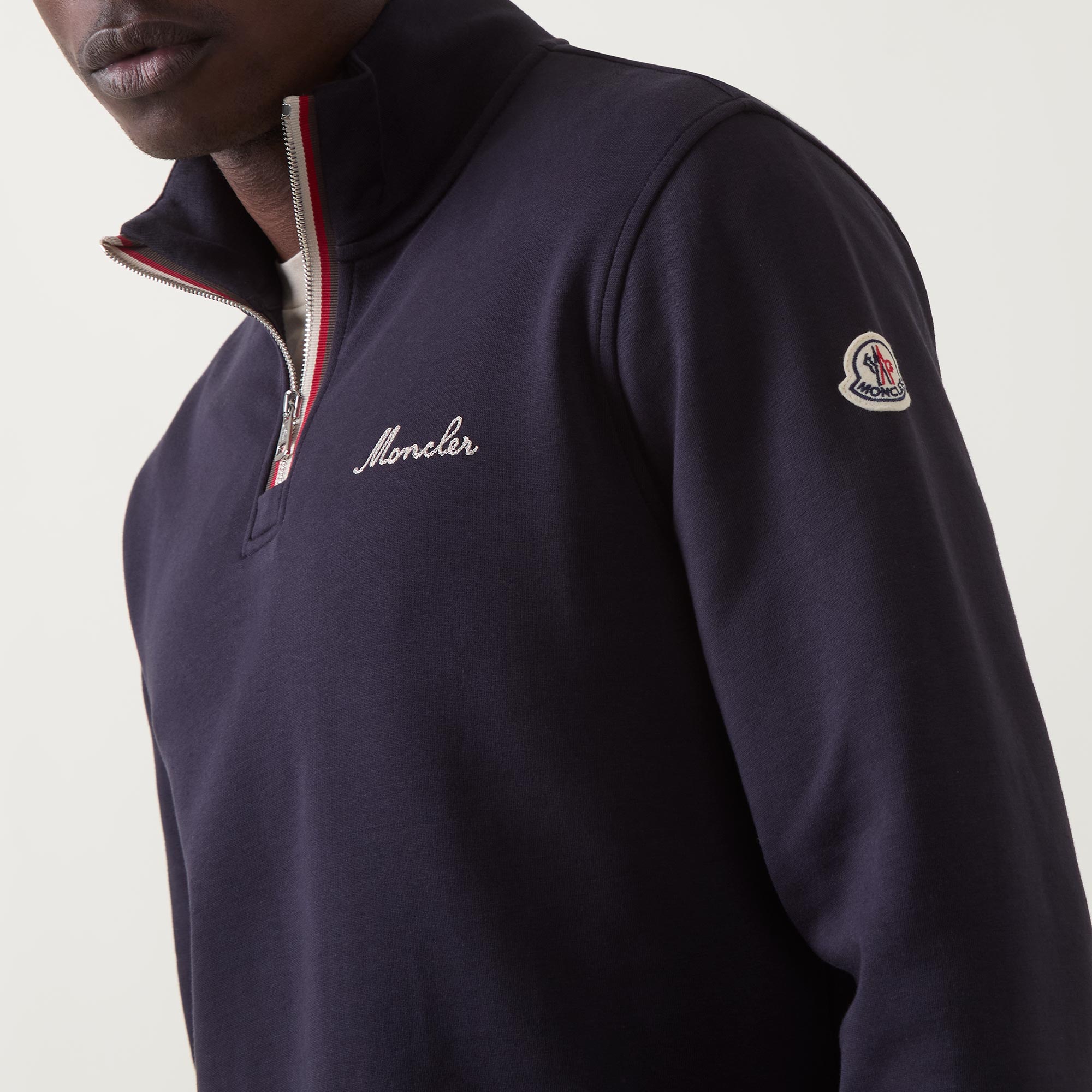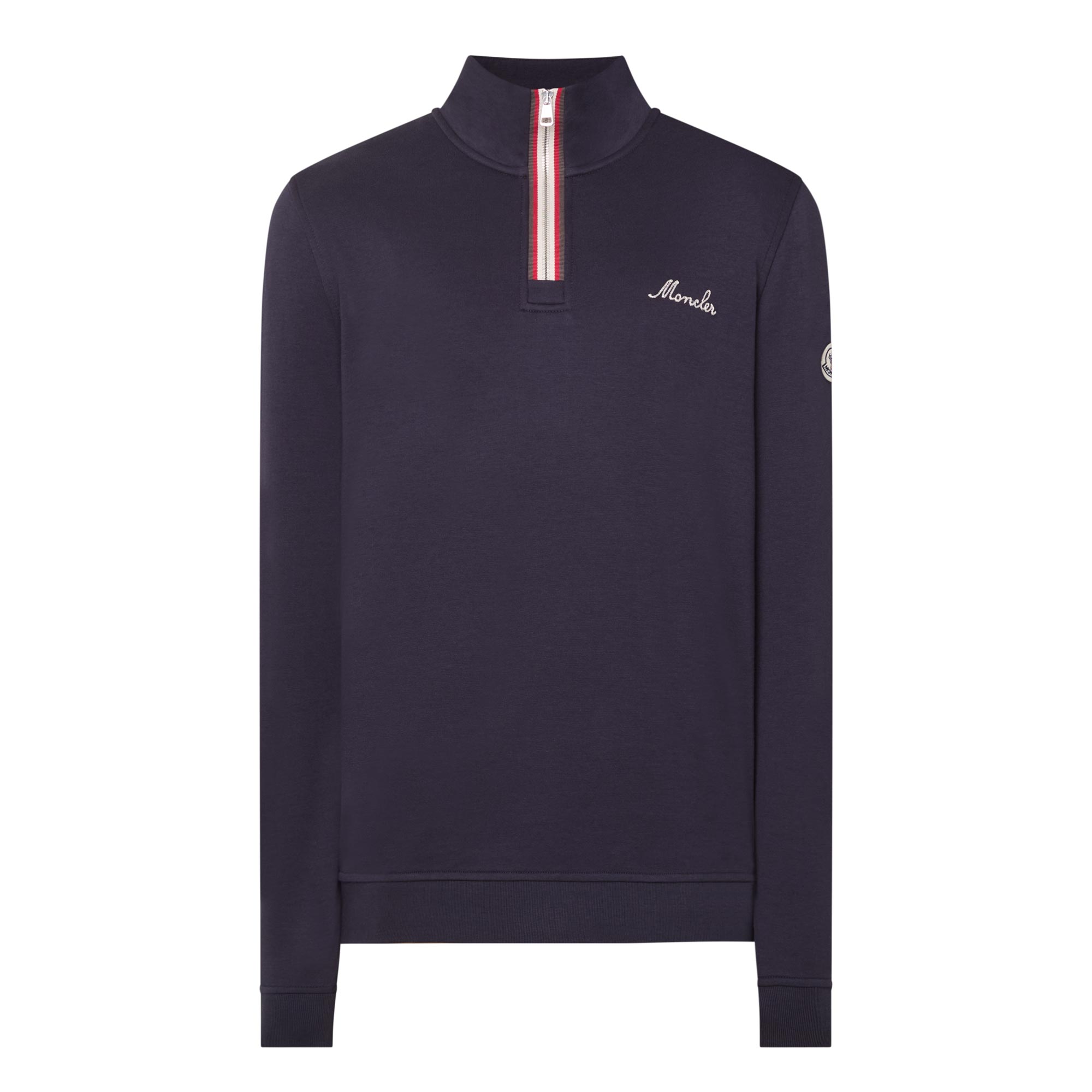 - High neckline, half-zip fastening, long sleeves, ribbed trims, embroidered logo details, badge at sleeve, tricolour trim detailing