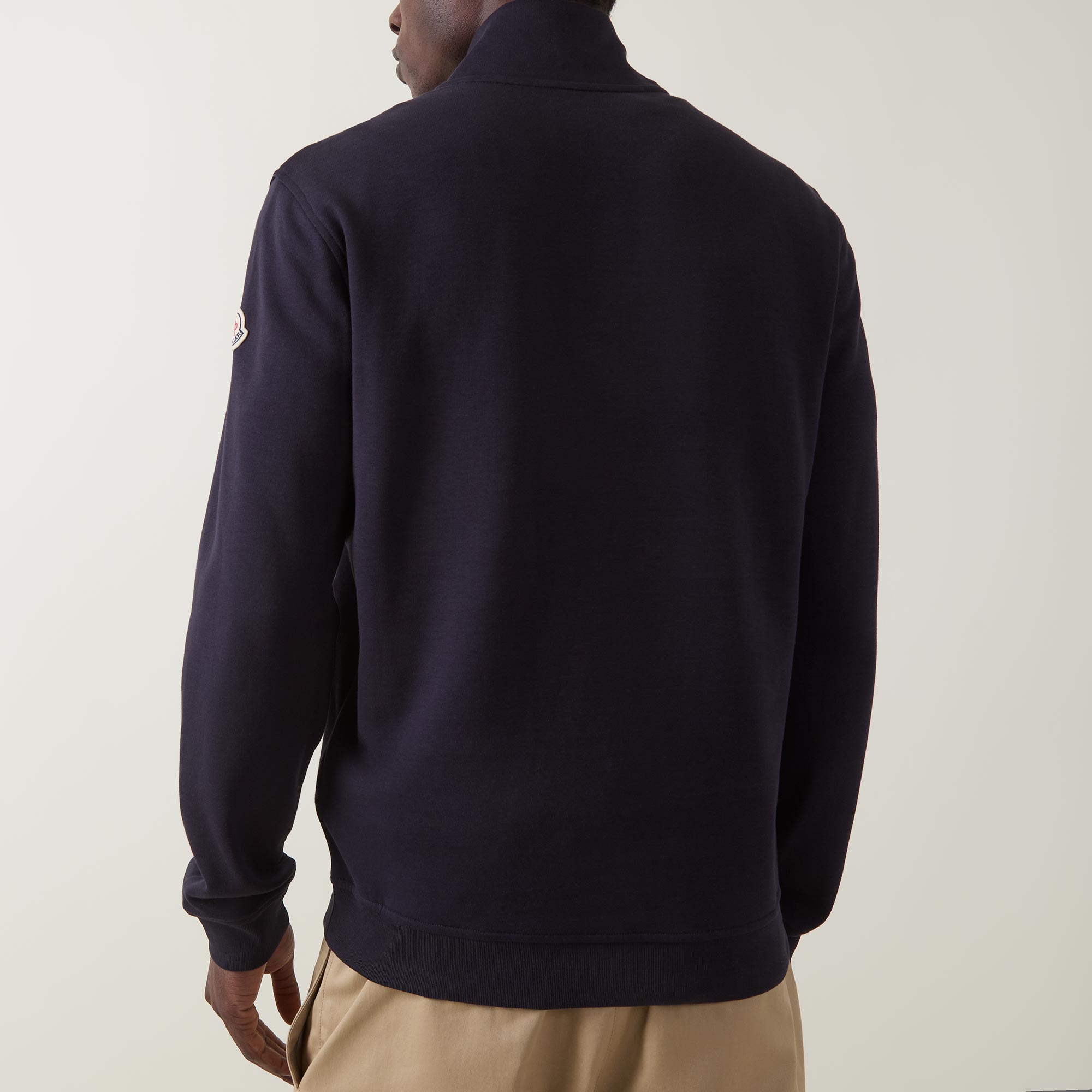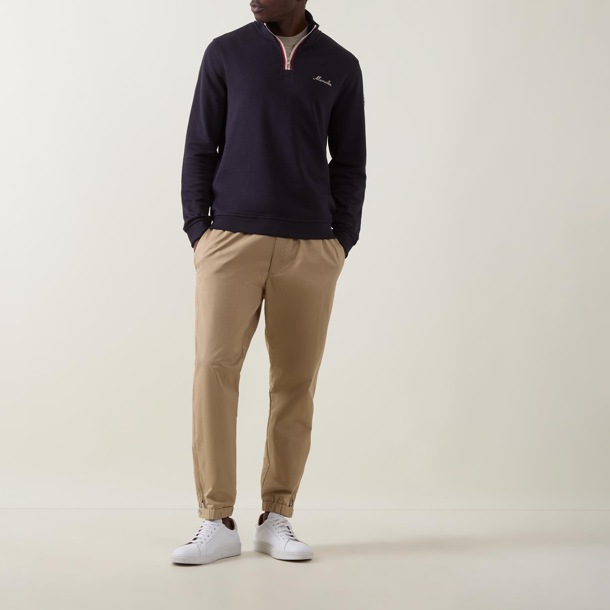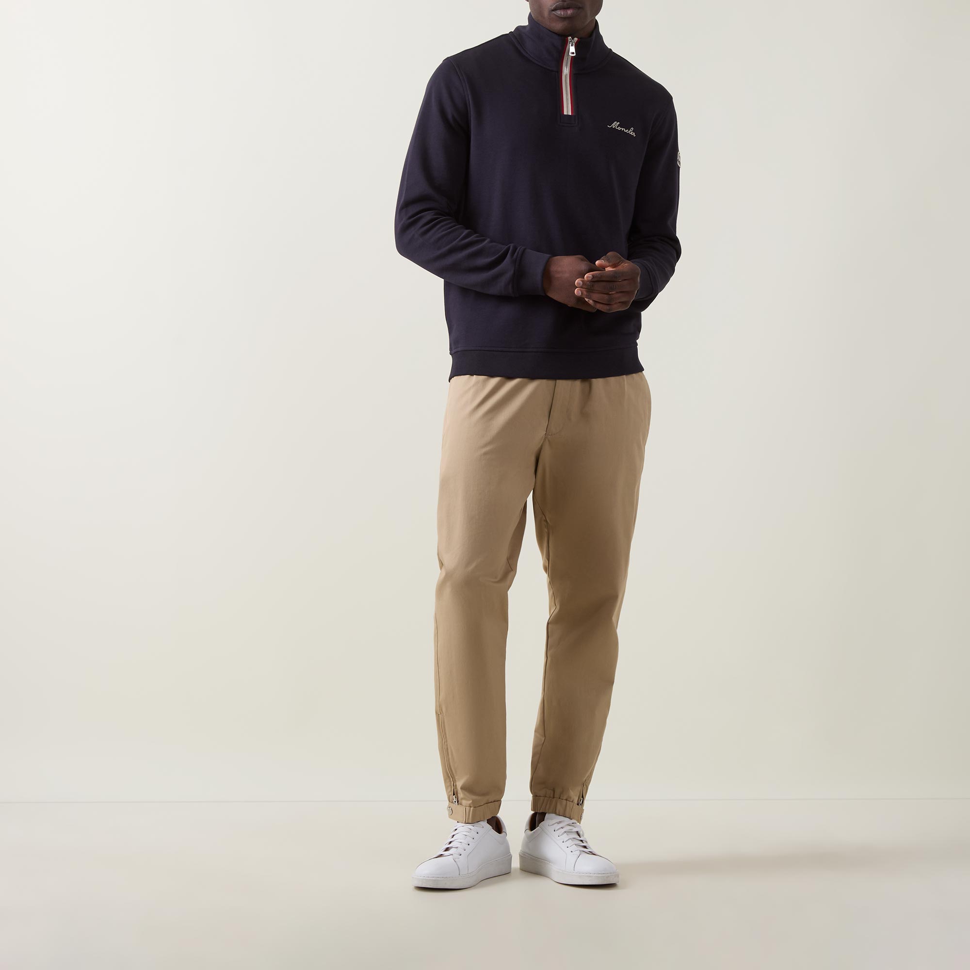 - High neckline, half-zip fastening, long sleeves, ribbed trims, embroidered logo details, badge at sleeve, tricolour trim detailing