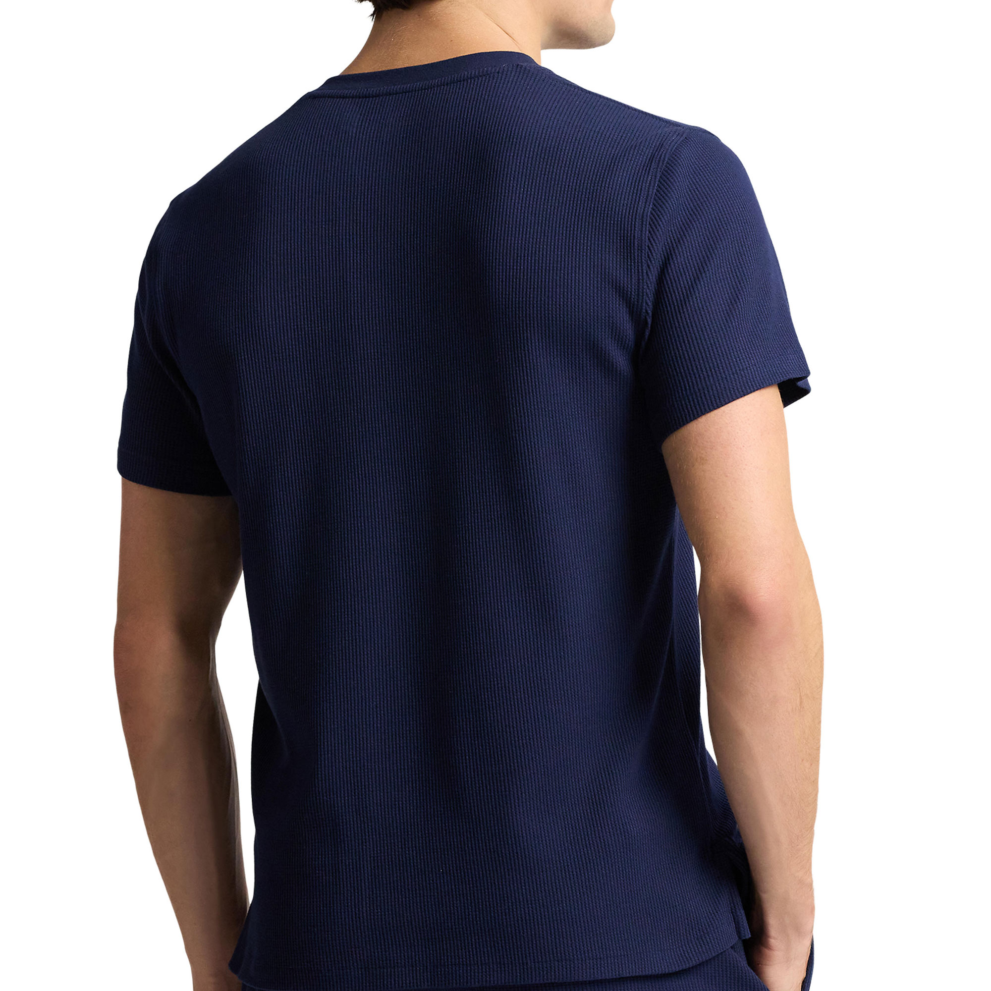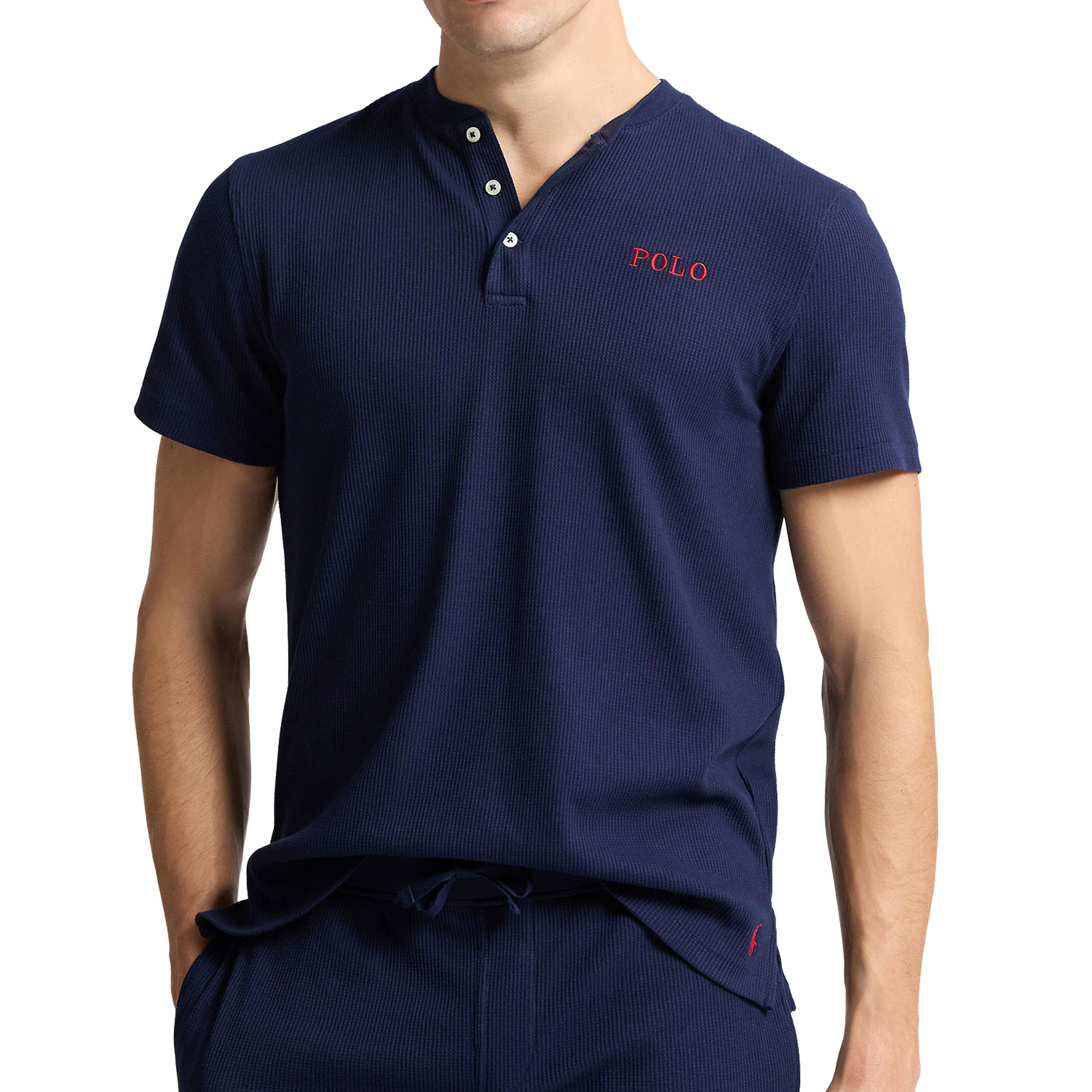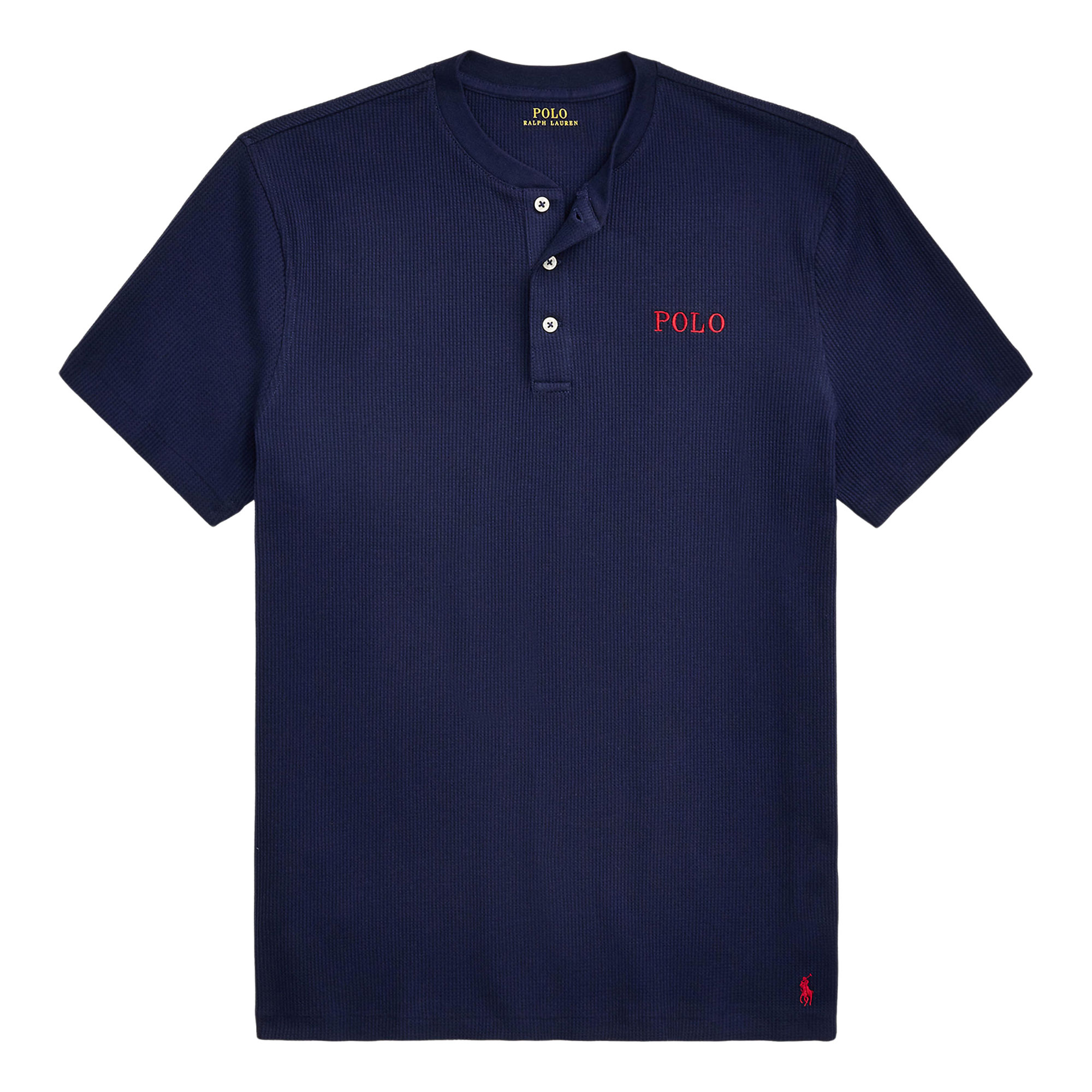 - Henley neckline, sleep style, waffle-knit design, soft feel, embroidered text logo detail, signature embroidered Pony logo detail, ribbed trims, three-button placket, short sleeves, even vented hem