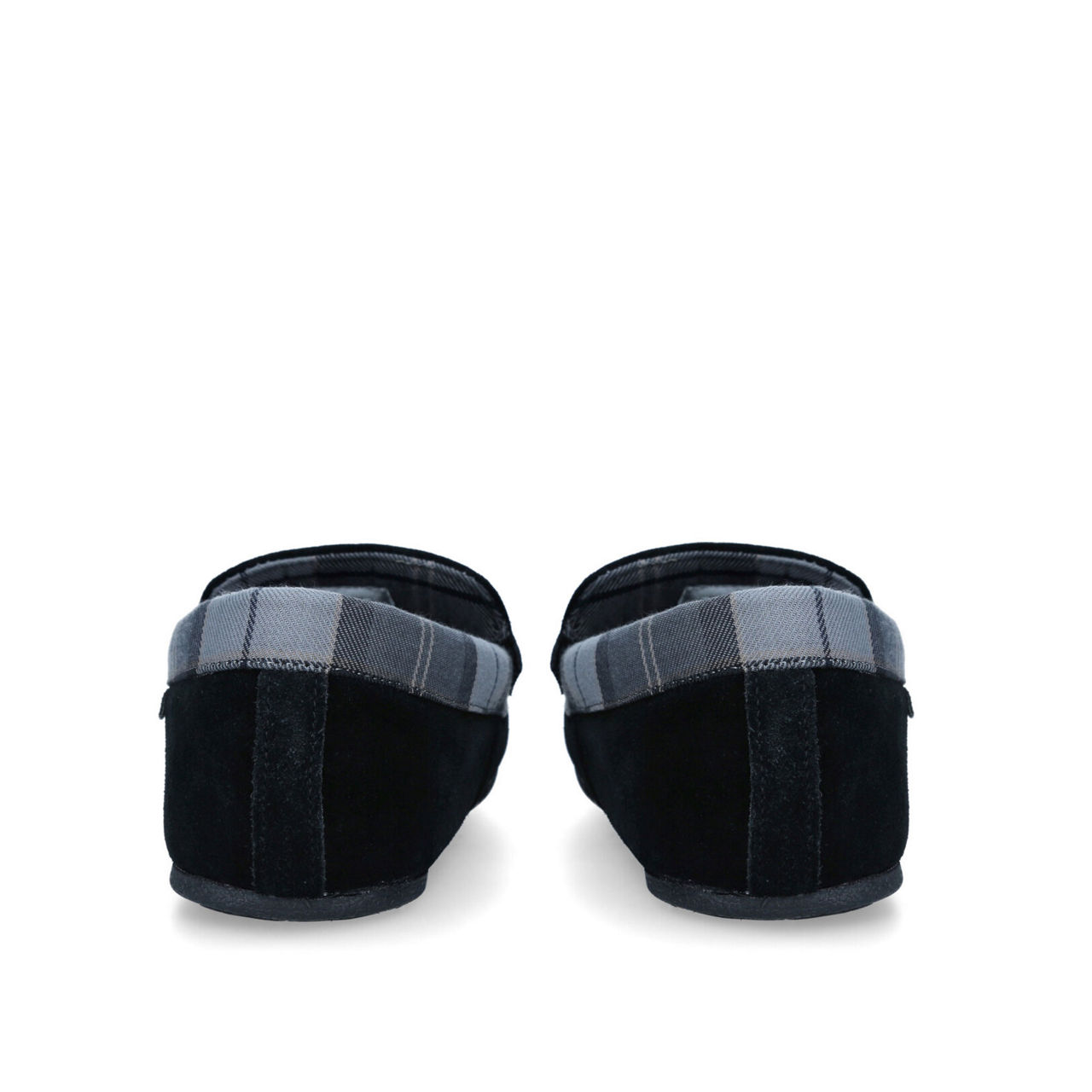- Square toe, stitched detailing, loafer-style slipper, check trim.
