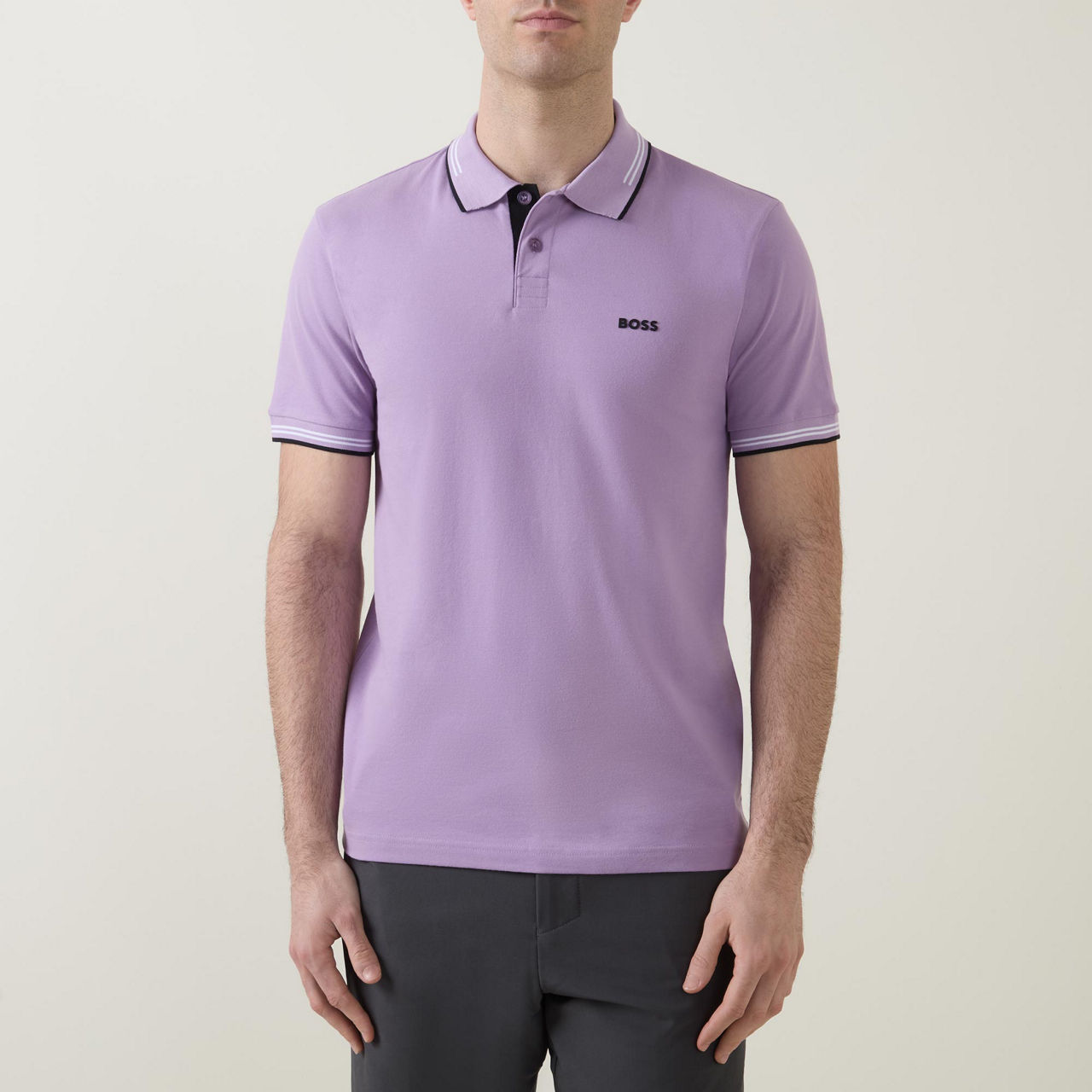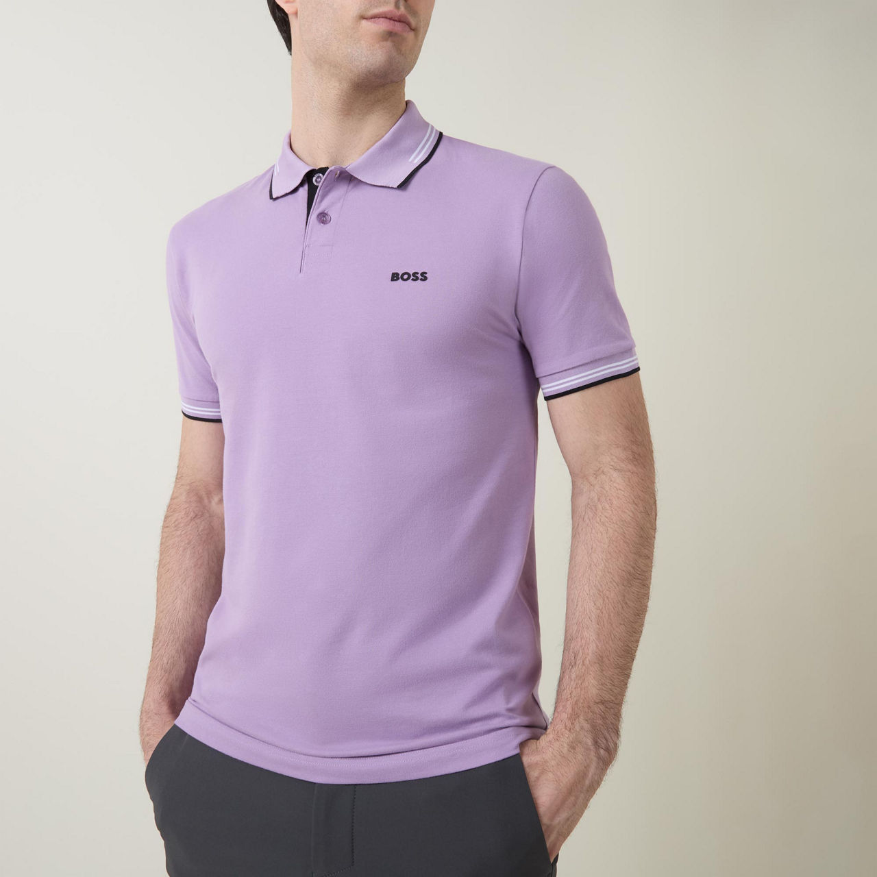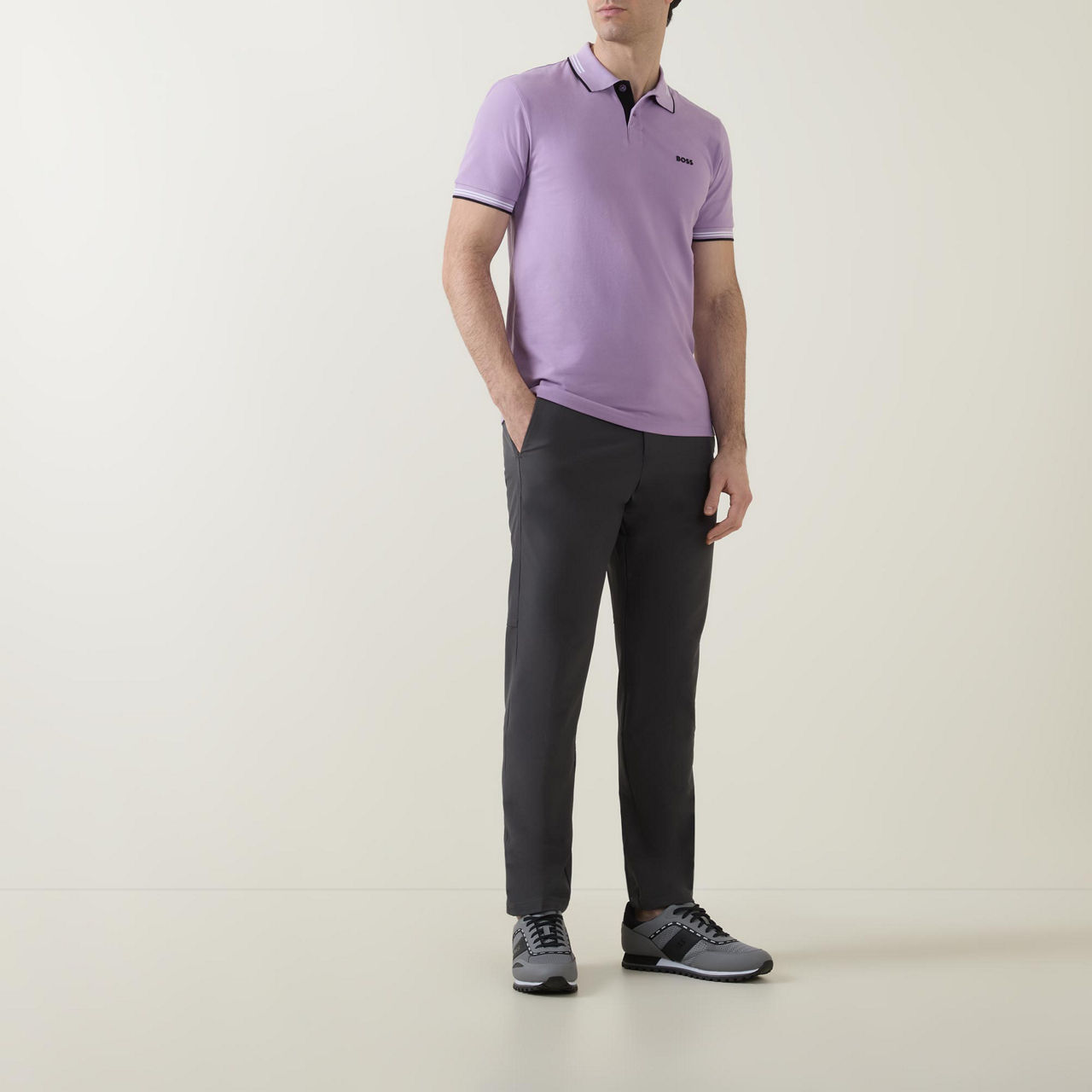 • Tipped collar, short sleeves, straight hemline, logo detail, button fastenings