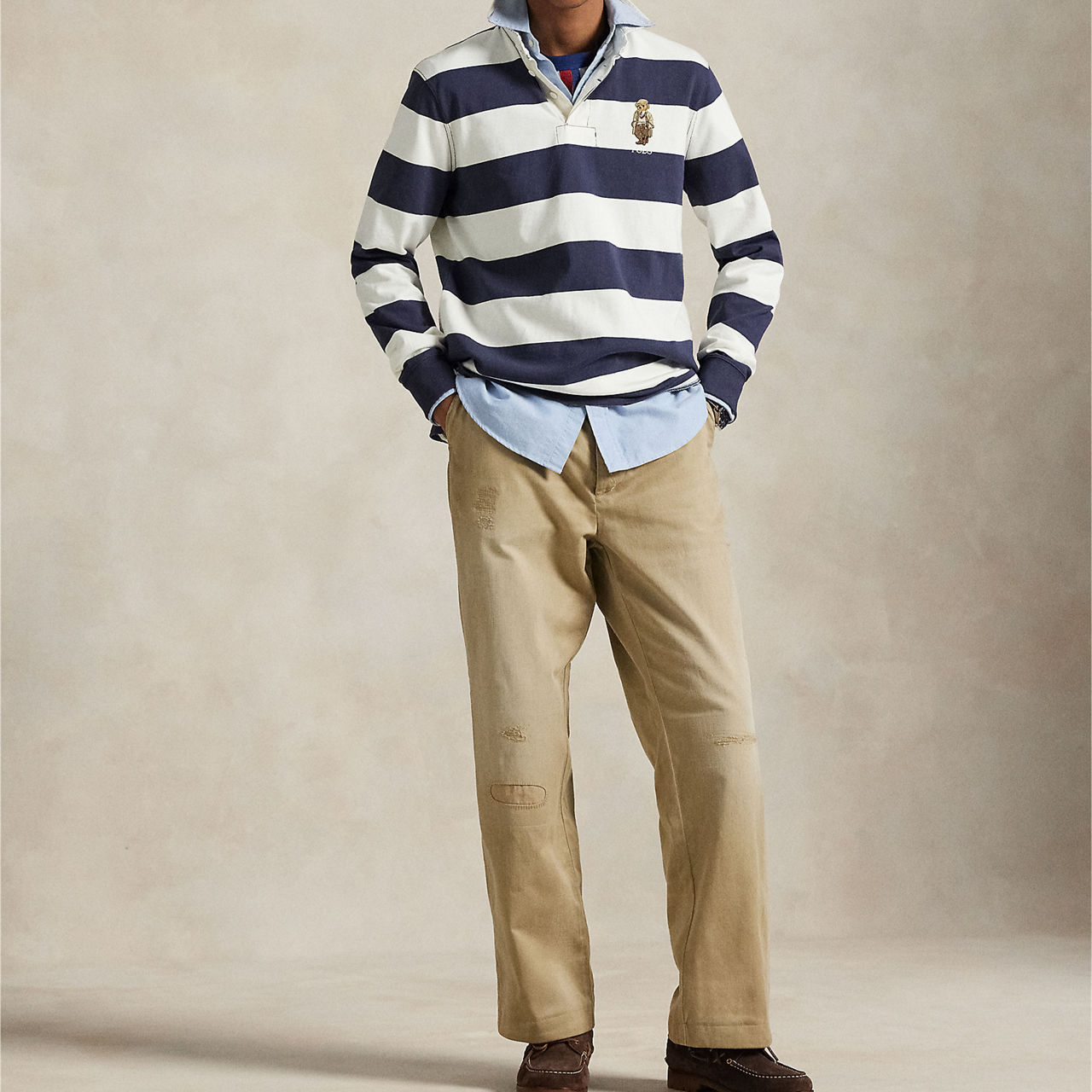 - Twill rugby collar, oxford undercollar, three-button placket, rubber buttons, long sleeves with ribbed cuffs, Polo Bear and script logo embroidered at the left chest, even vented hem
