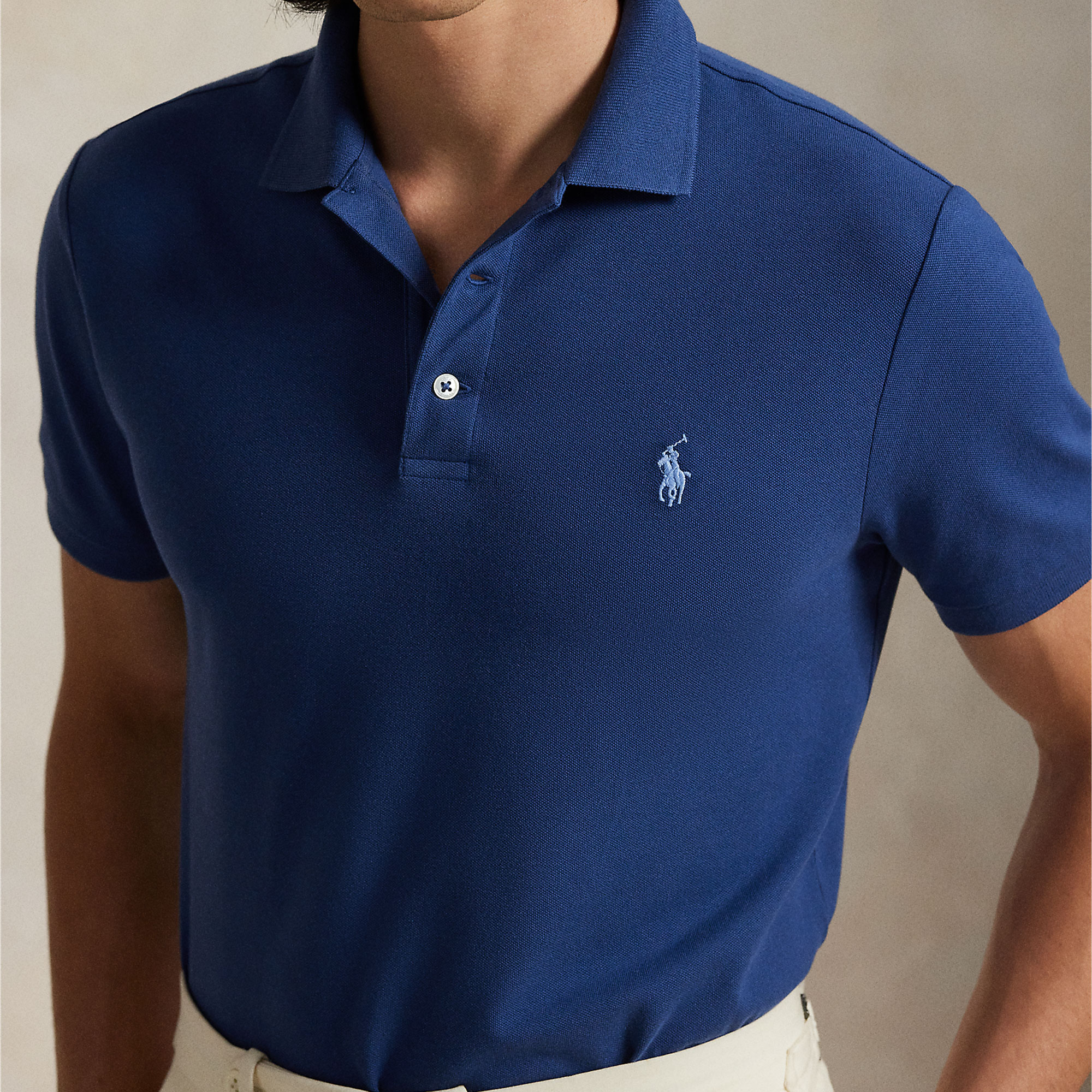 - Classic polo shirt, stretch for ease of movement, genuine mother-of-pearl buttons, short sleeves, logo detail