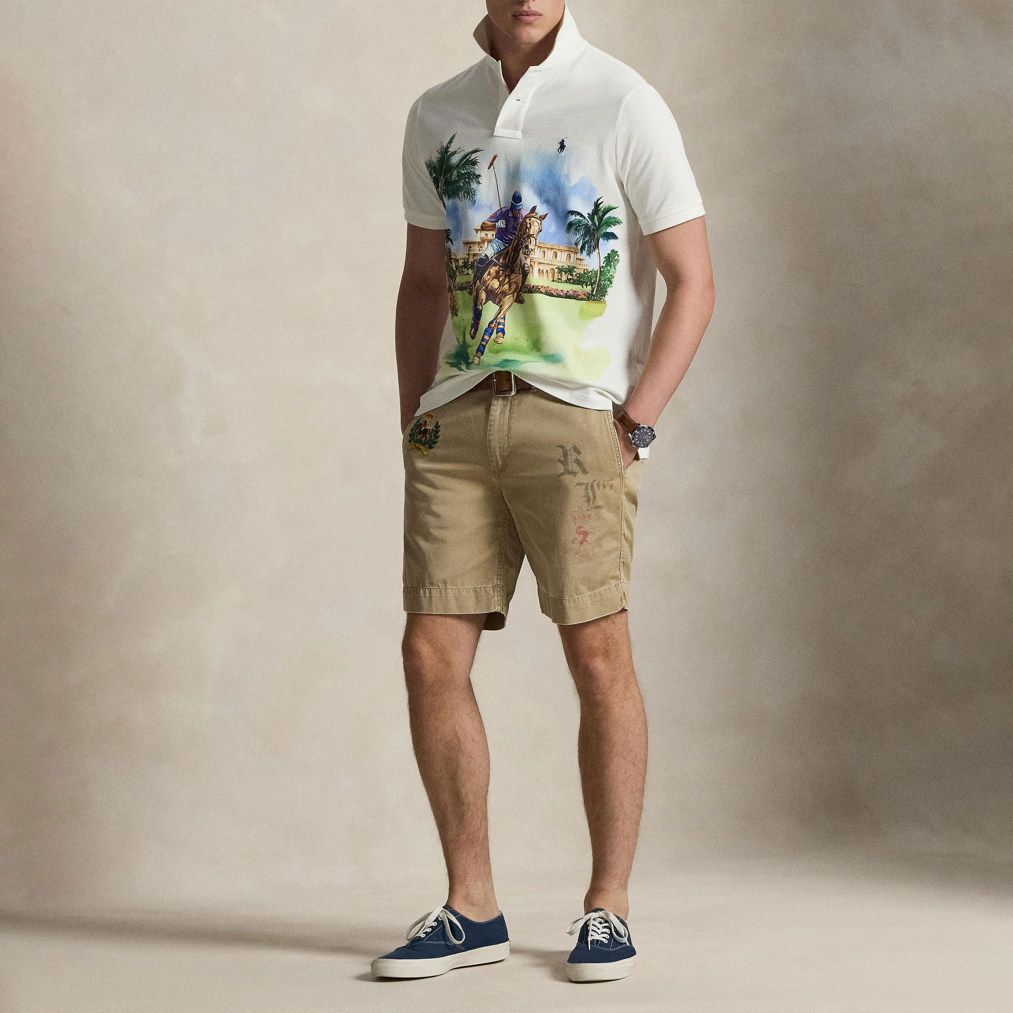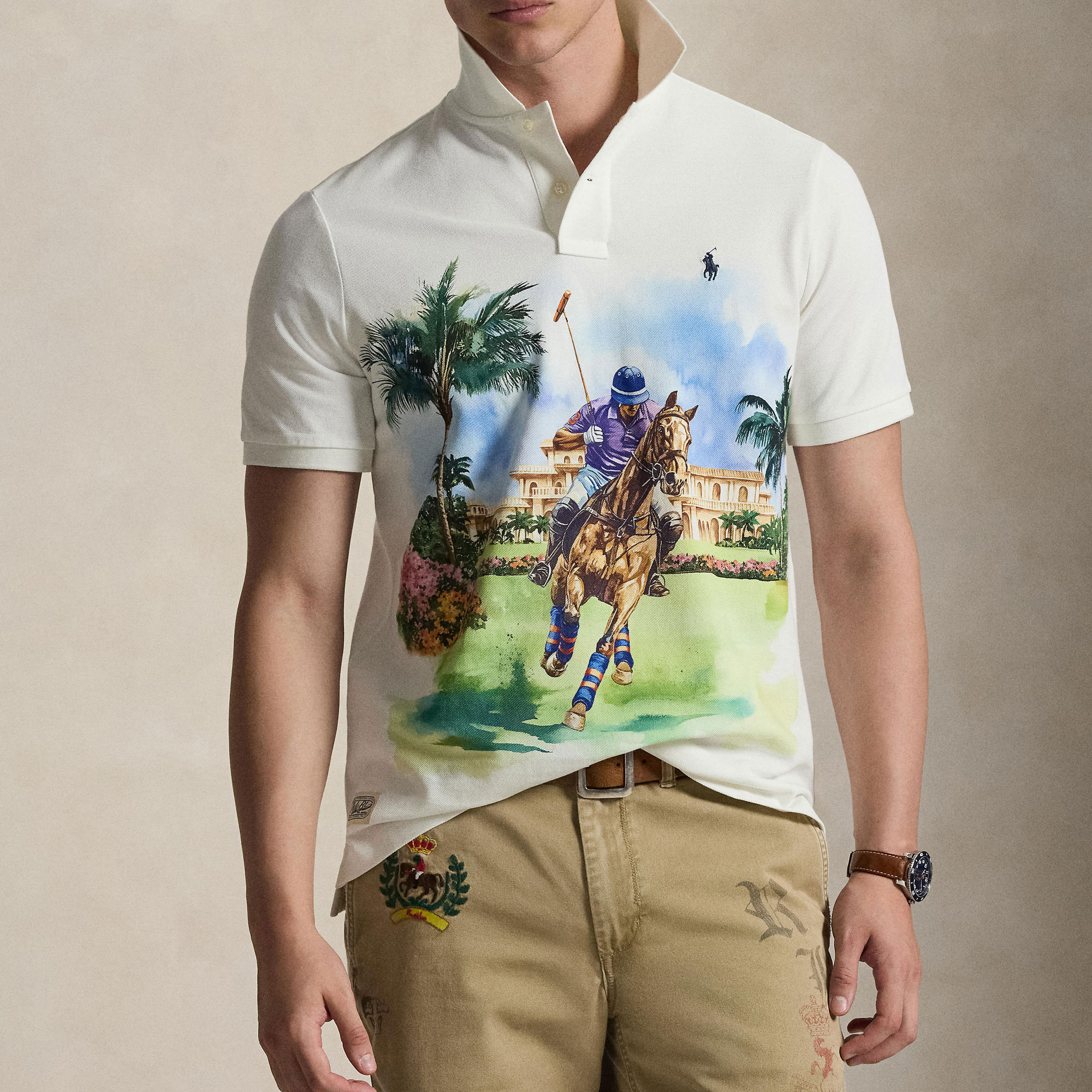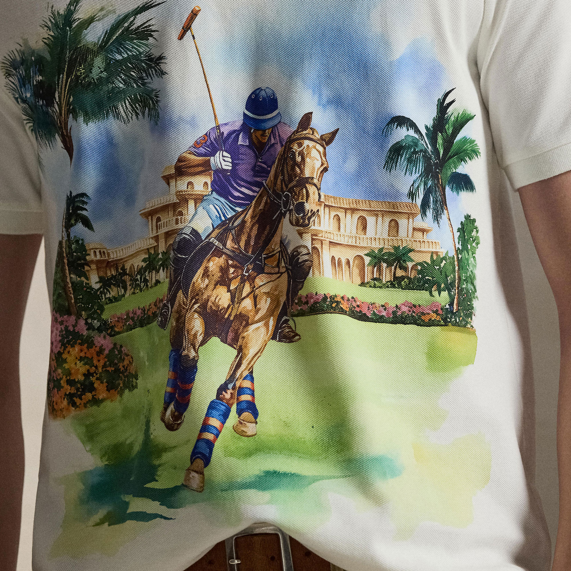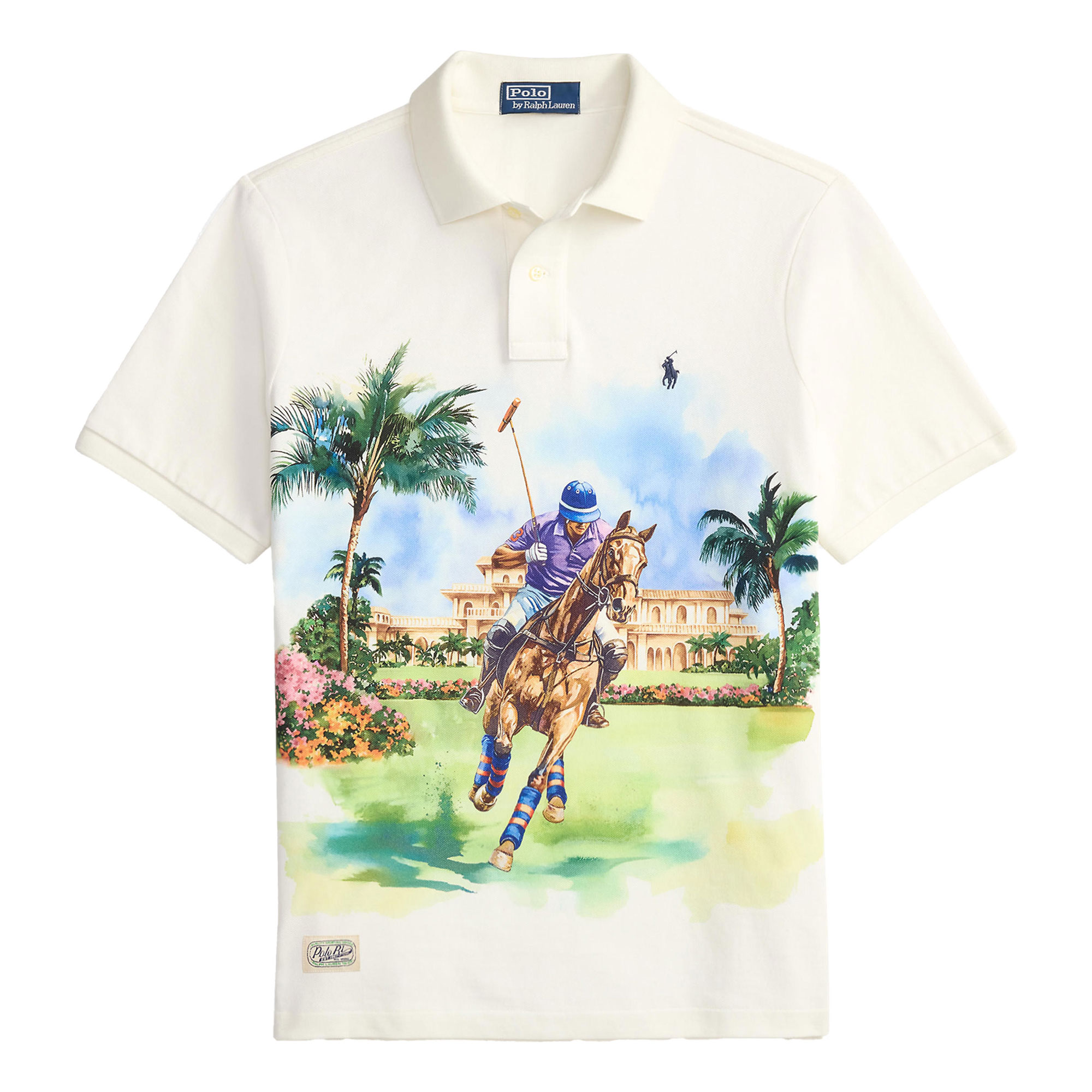 - Mesh fabric, Polo player graphic print, ribbed Polo collar, two-button placket, short sleeves, ribbed armbands, tennis tail, logo label, signature embroidered Pony logo