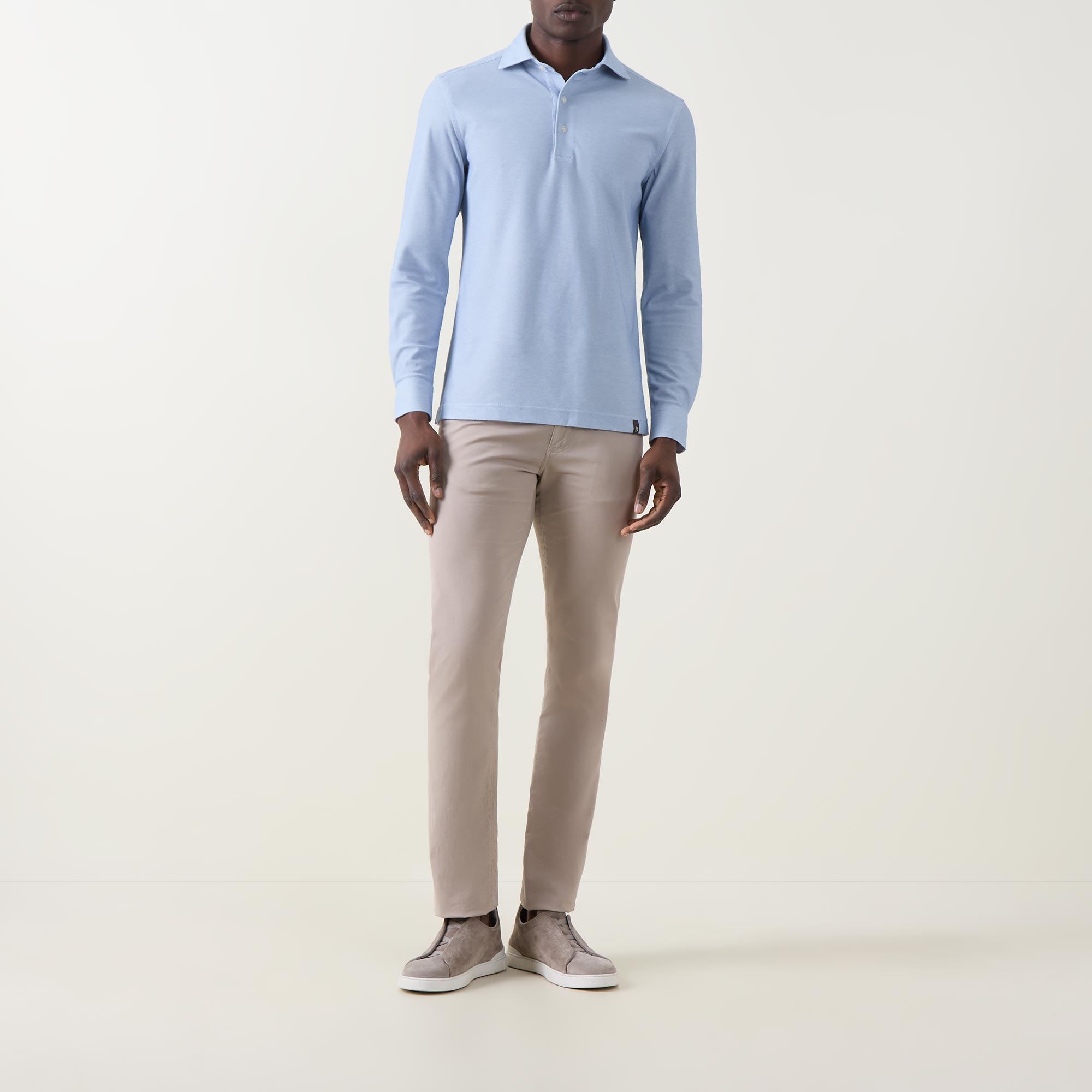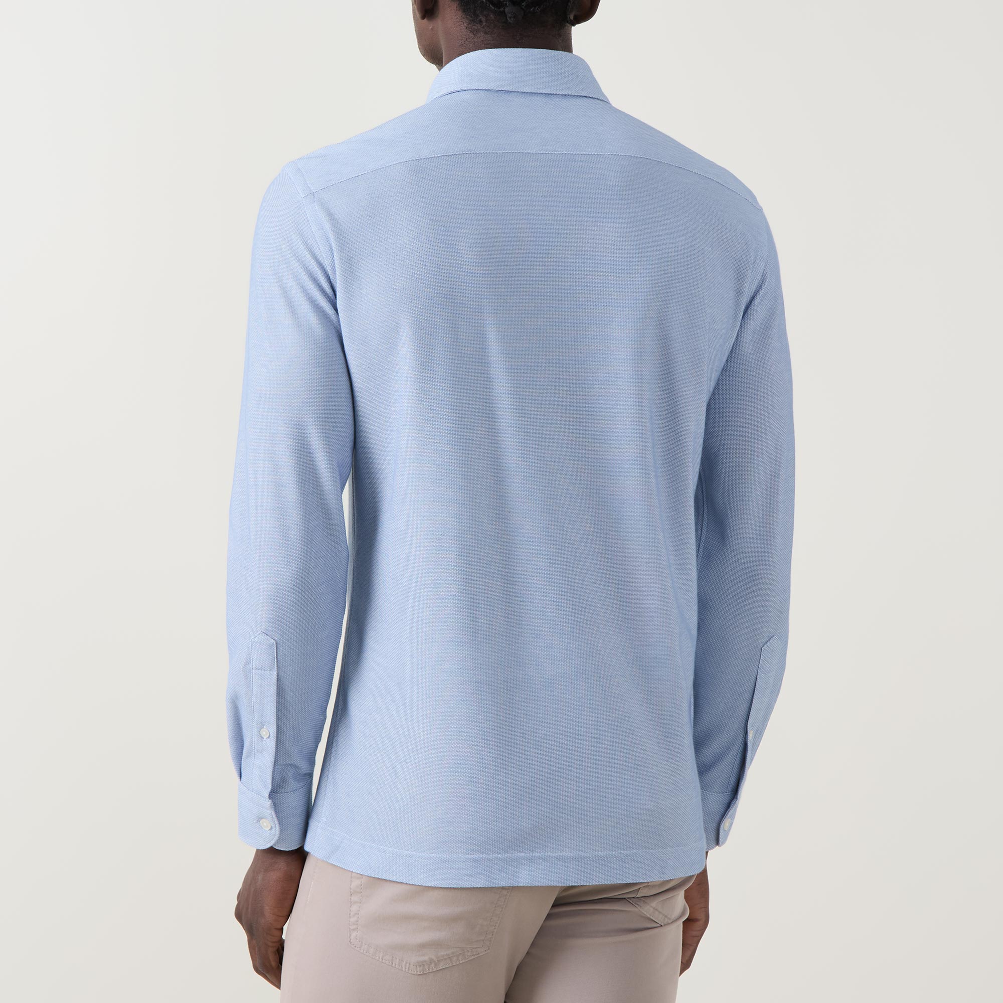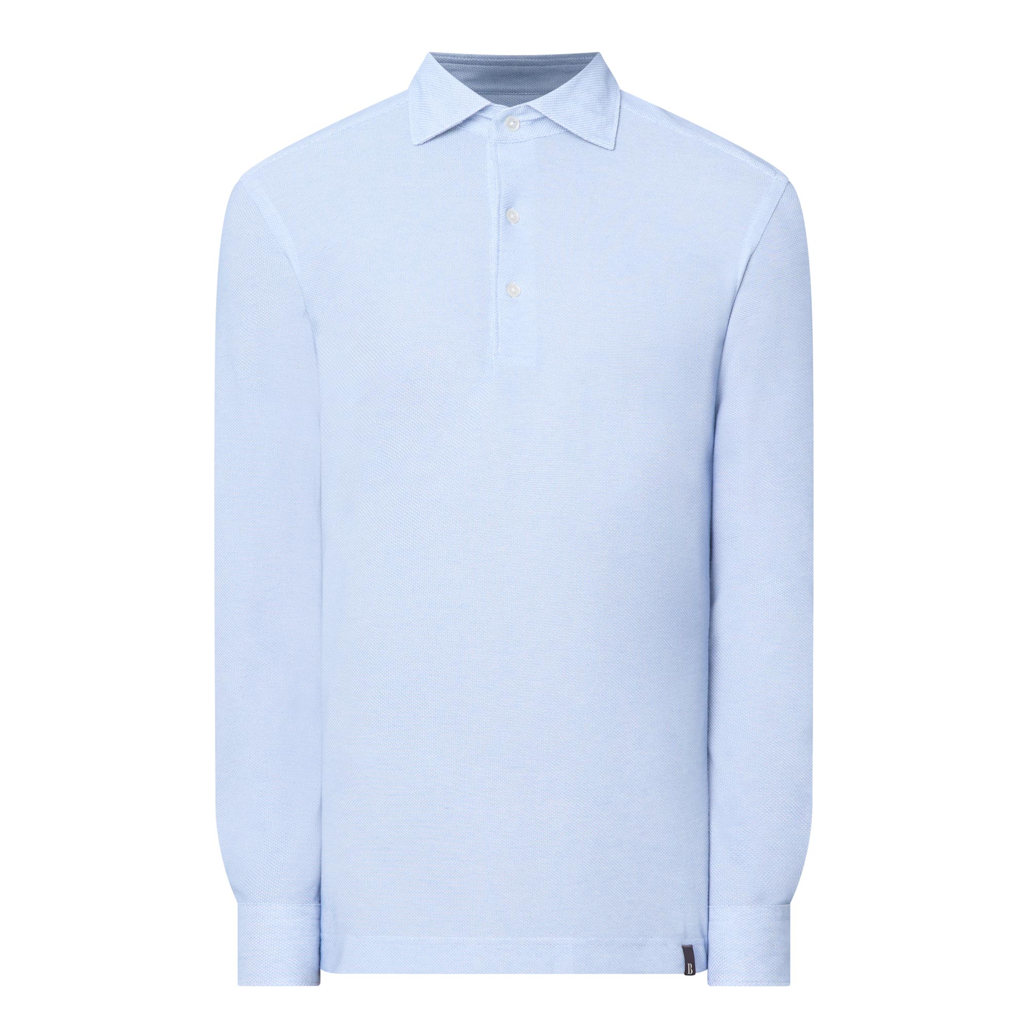 • Flat collar, button fastening, long sleeves, ribbed cuffs, straight hemline, logo badge, crease resistant finish