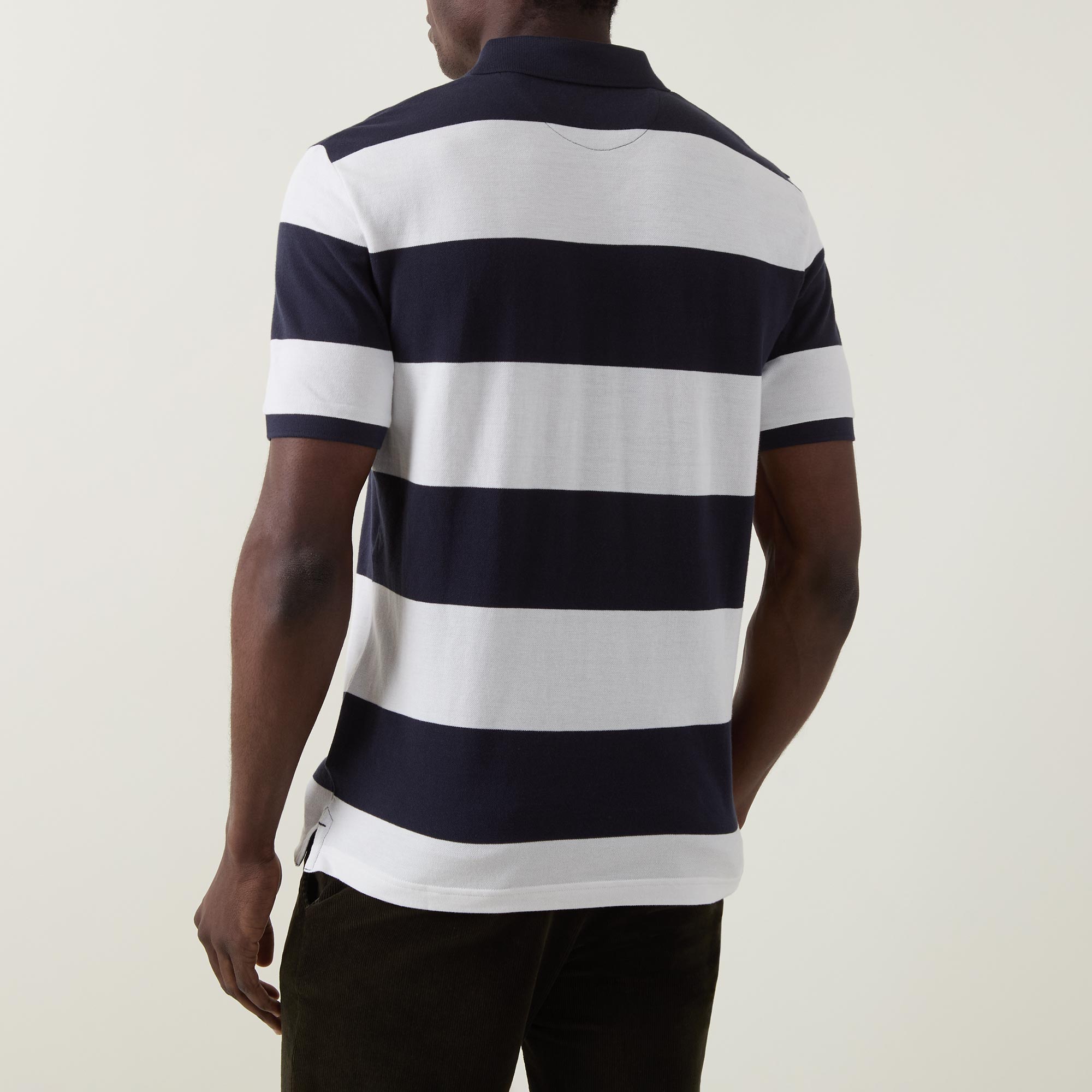 - Polo collar, short sleeves, straight hemline, button fastenings, logo detail, striped