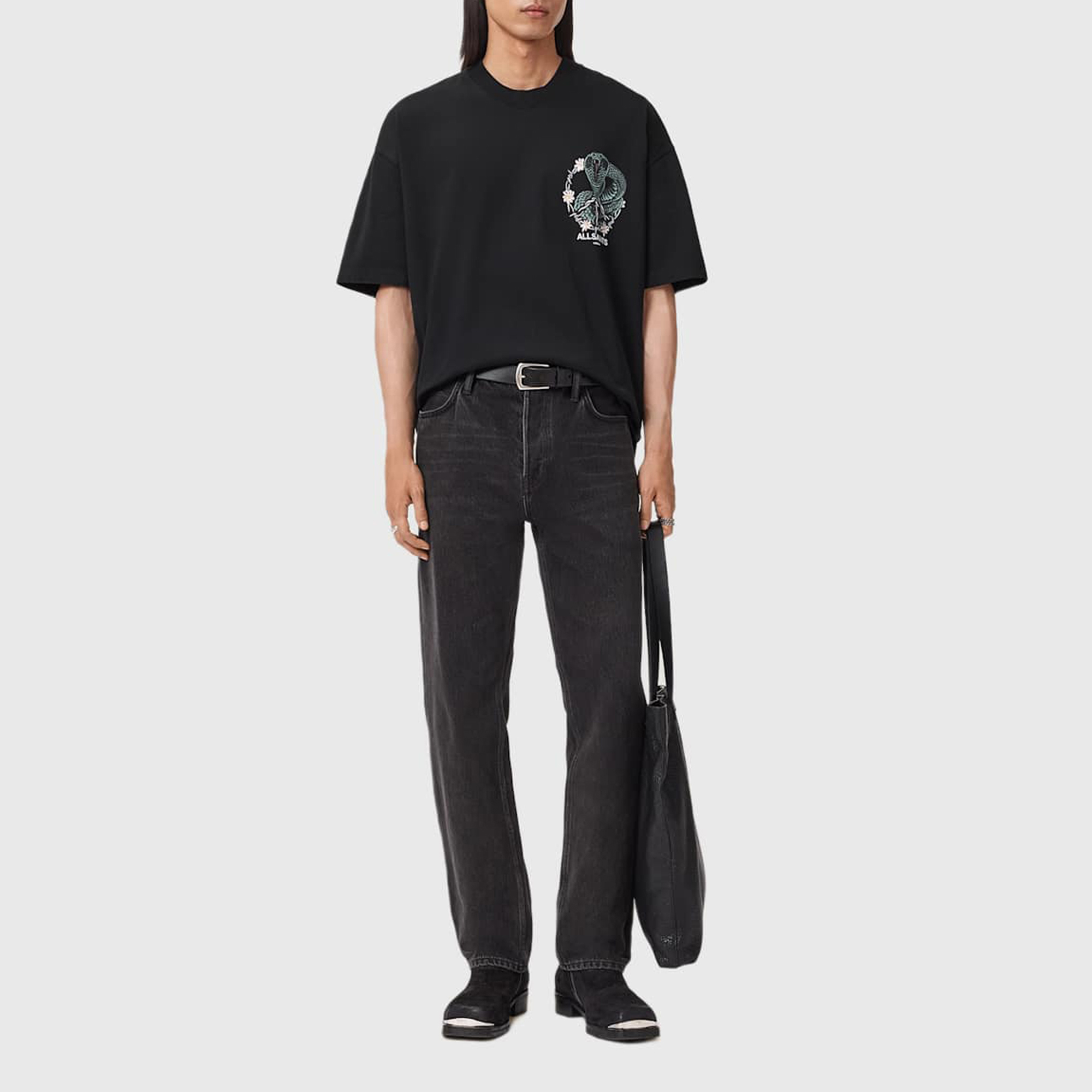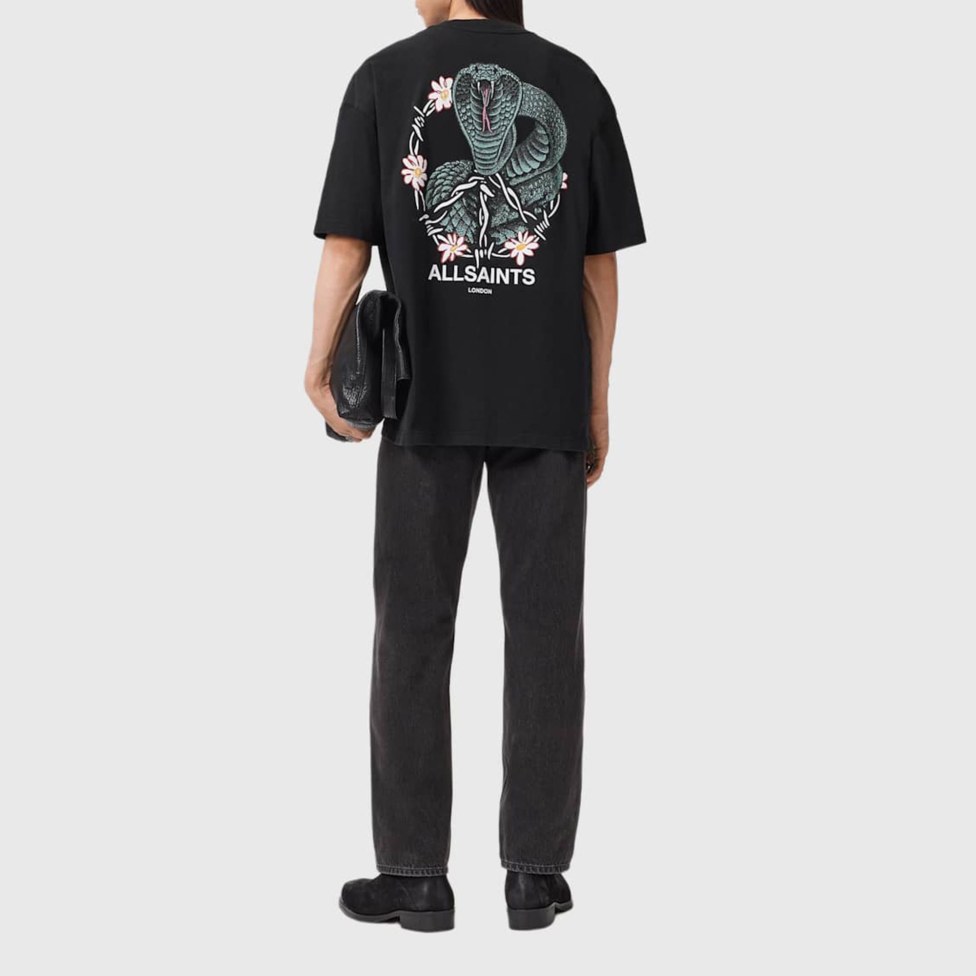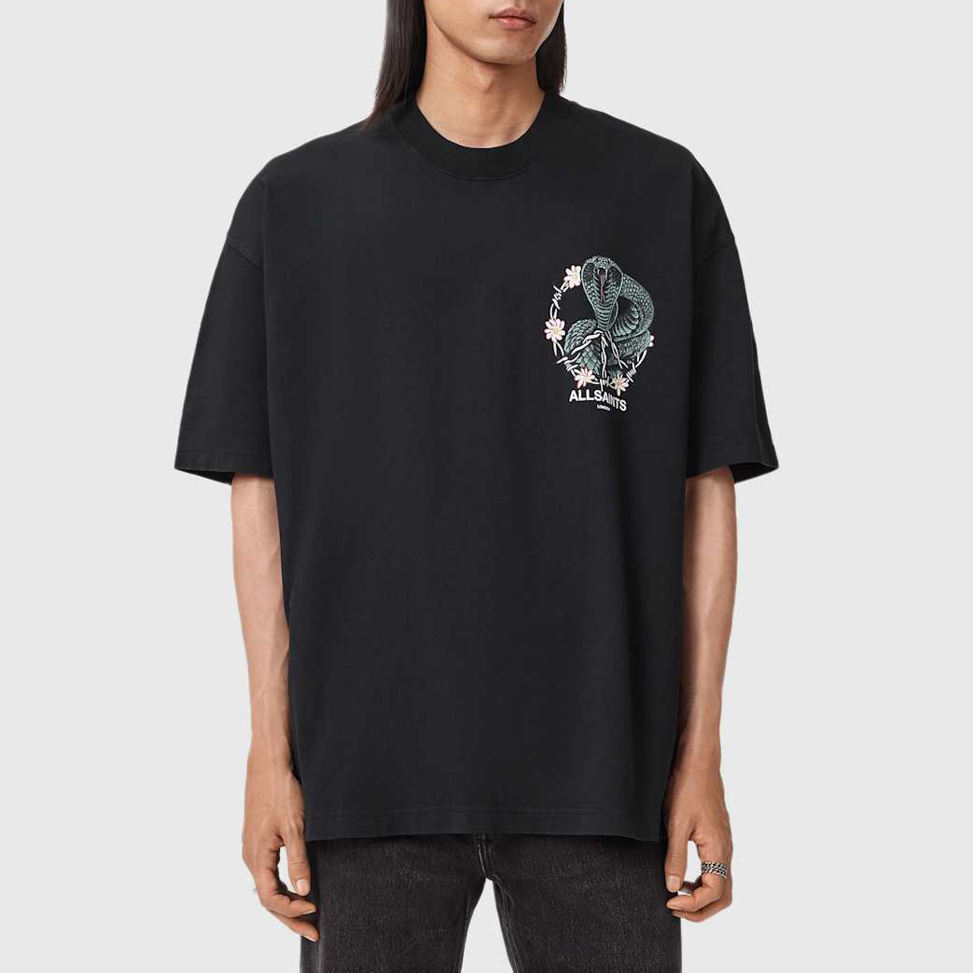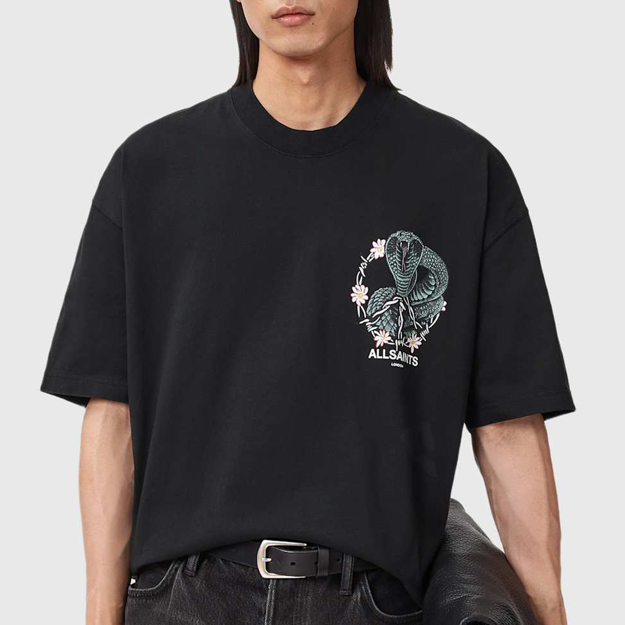 - Heavyweight fabric, regular wash finish, ribbed neckband, twin needle stitching, screen-printed hand-painted snake graphic, logo branding details