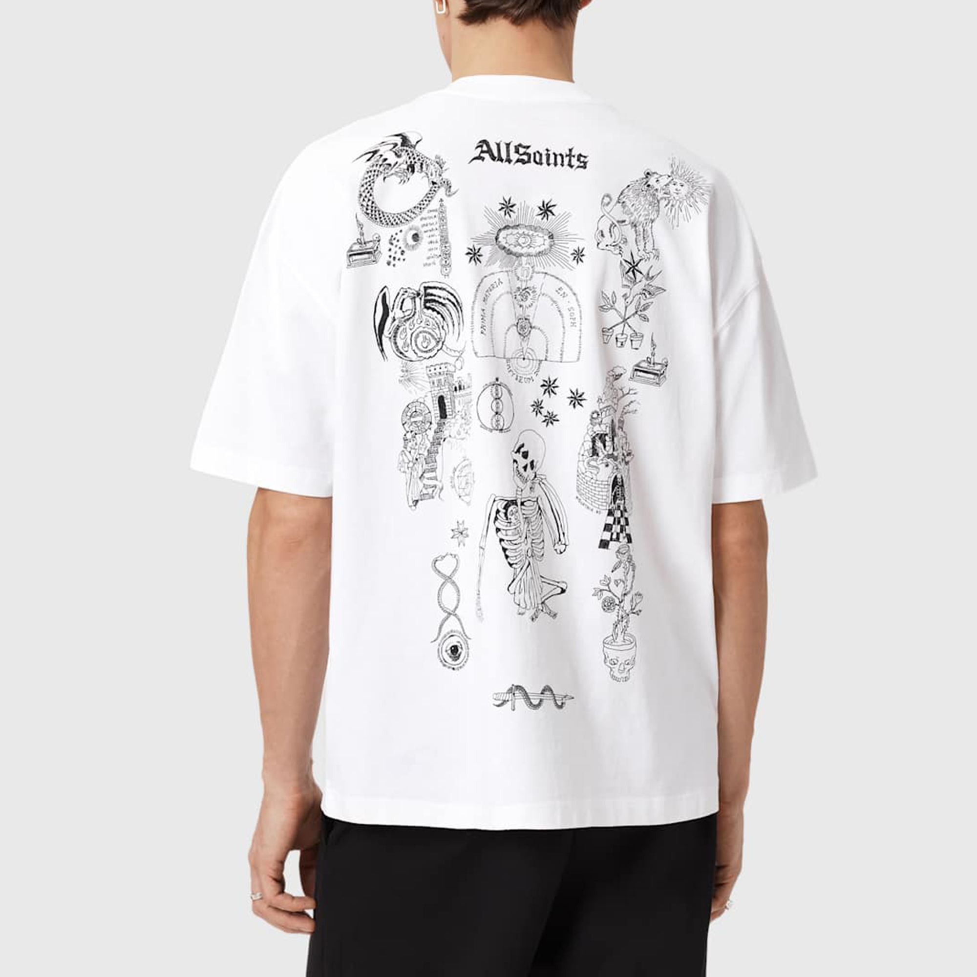 - Hand drawn doodles of esoteric imagery scattered across oversized crew block with logo detail, regular wash