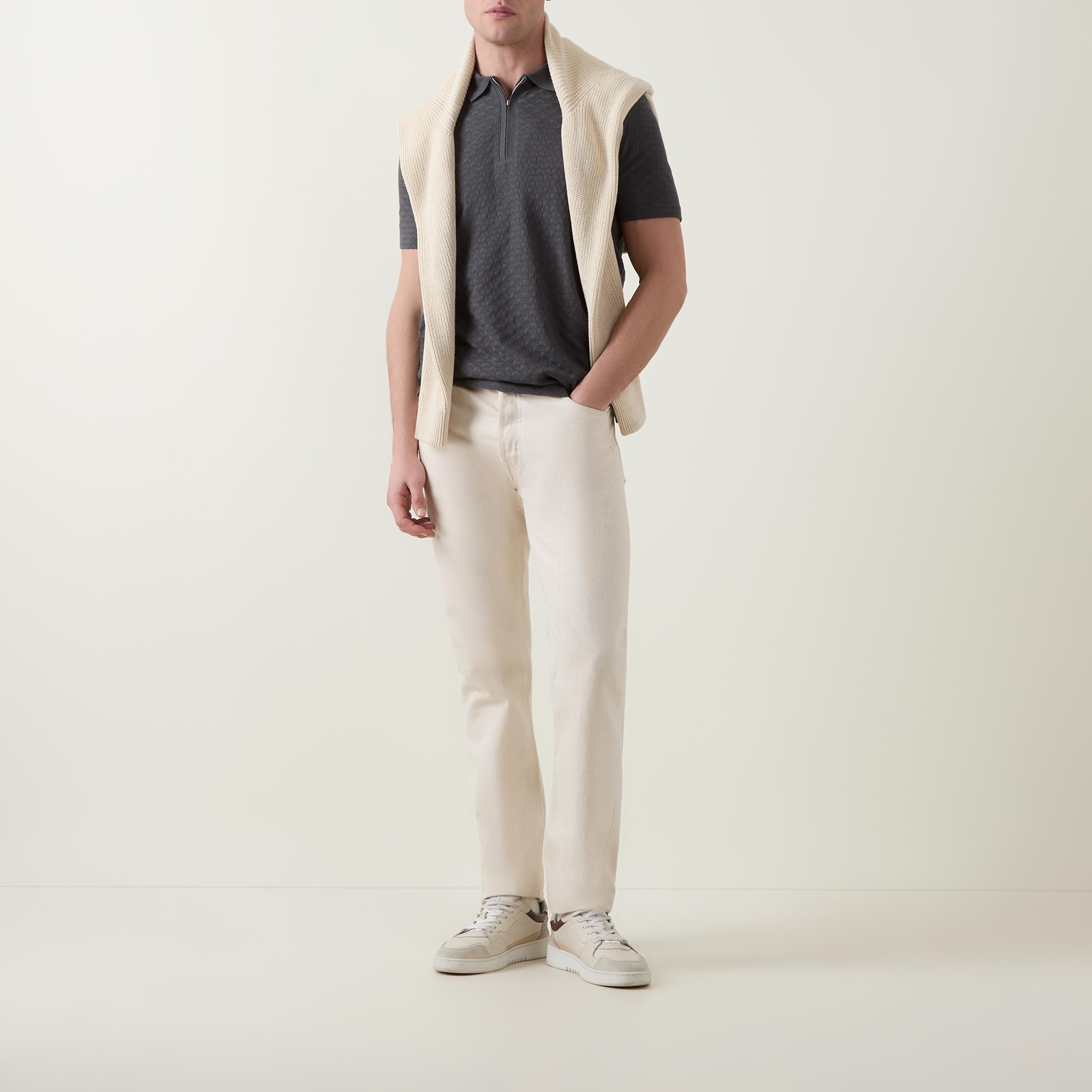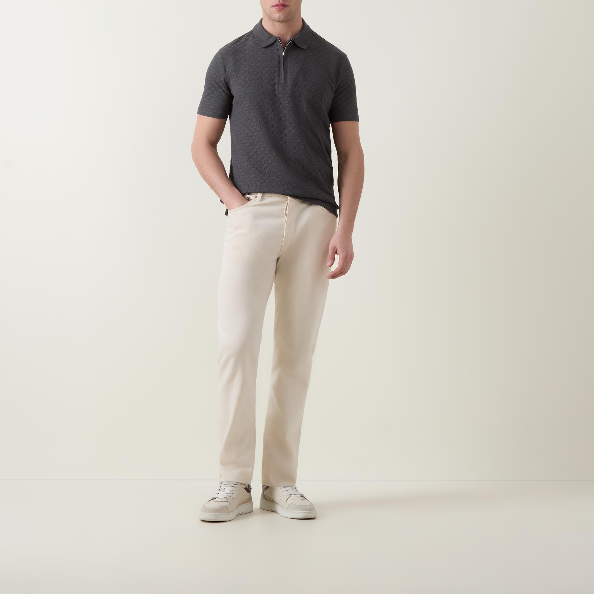 - Polo collar with quarter-zip fastening, textured jacquard fabrication, logo tag to side, straight hem