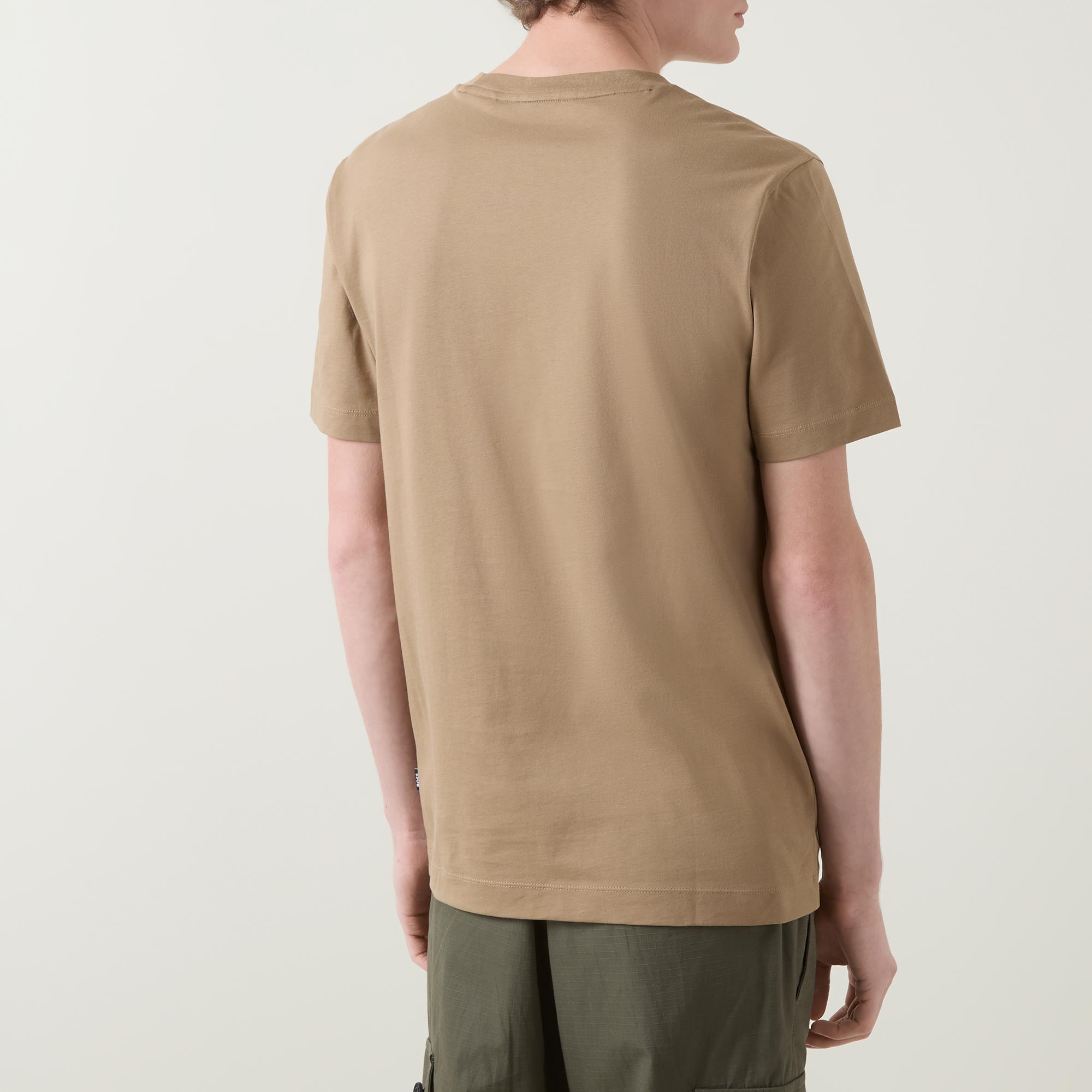 - Short sleeves, crew neckline, dropped shoulders, tonal logo detail, tonal stitching, straight hemline, smooth fabric