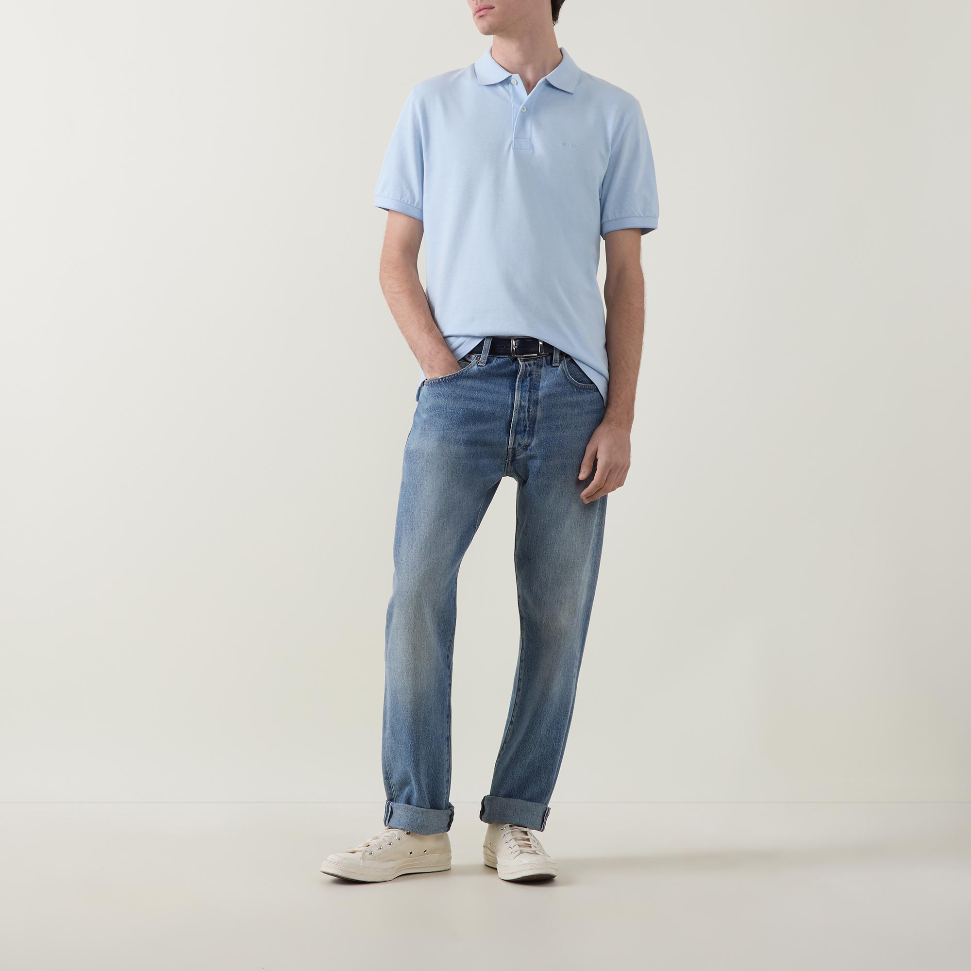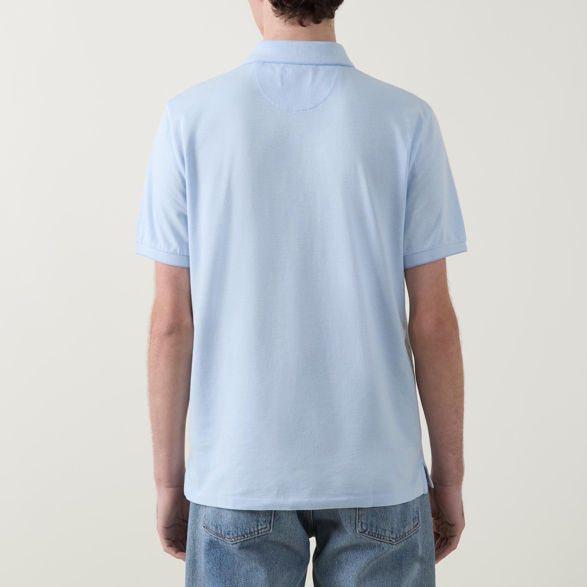 - Polo collar, two button placket, short sleeves, straight hem, side split detailing, tonal logo embroidery on the chest, tonal tipped detailing