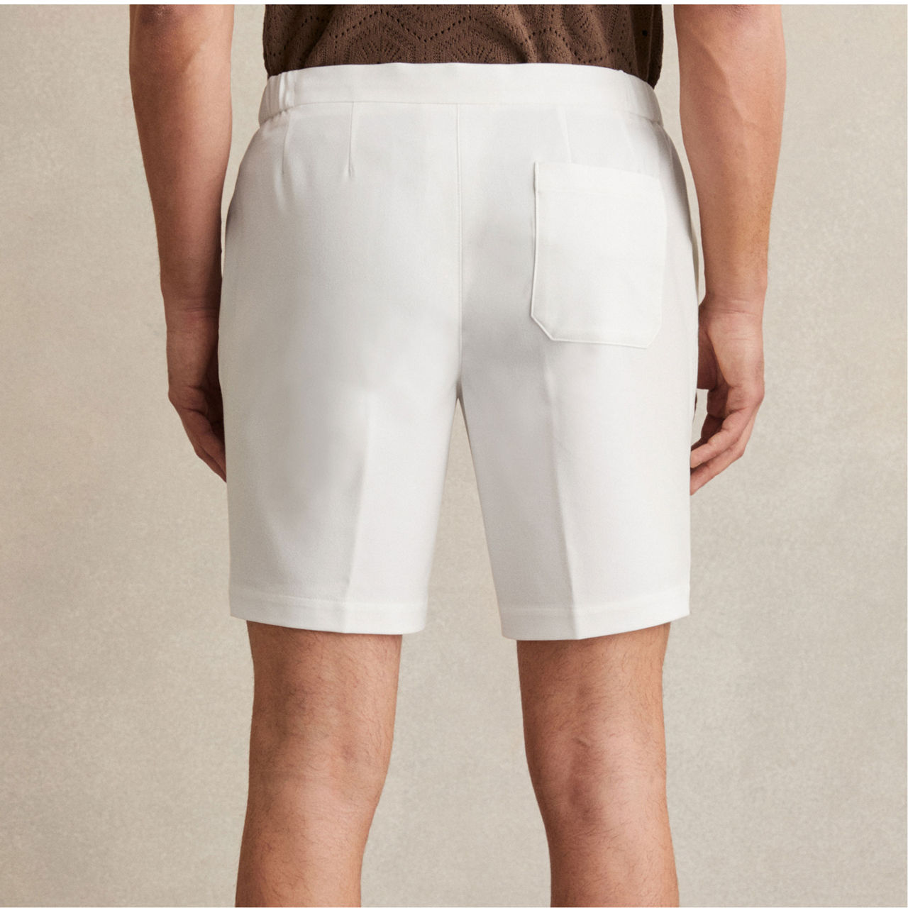 - Elasticated waistband with interior drawstring adjustable fit, pressed creases, side slip pockets, back patch pocket, hook and bar with fly zip fastening