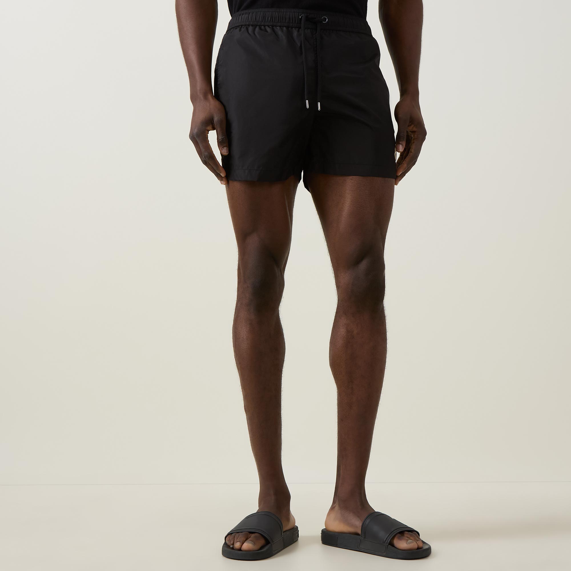 - Elasticated drawstring waistband, two side in-seam pockets, signature logo badge detail, quick-drying nylon fabric, full mesh lining