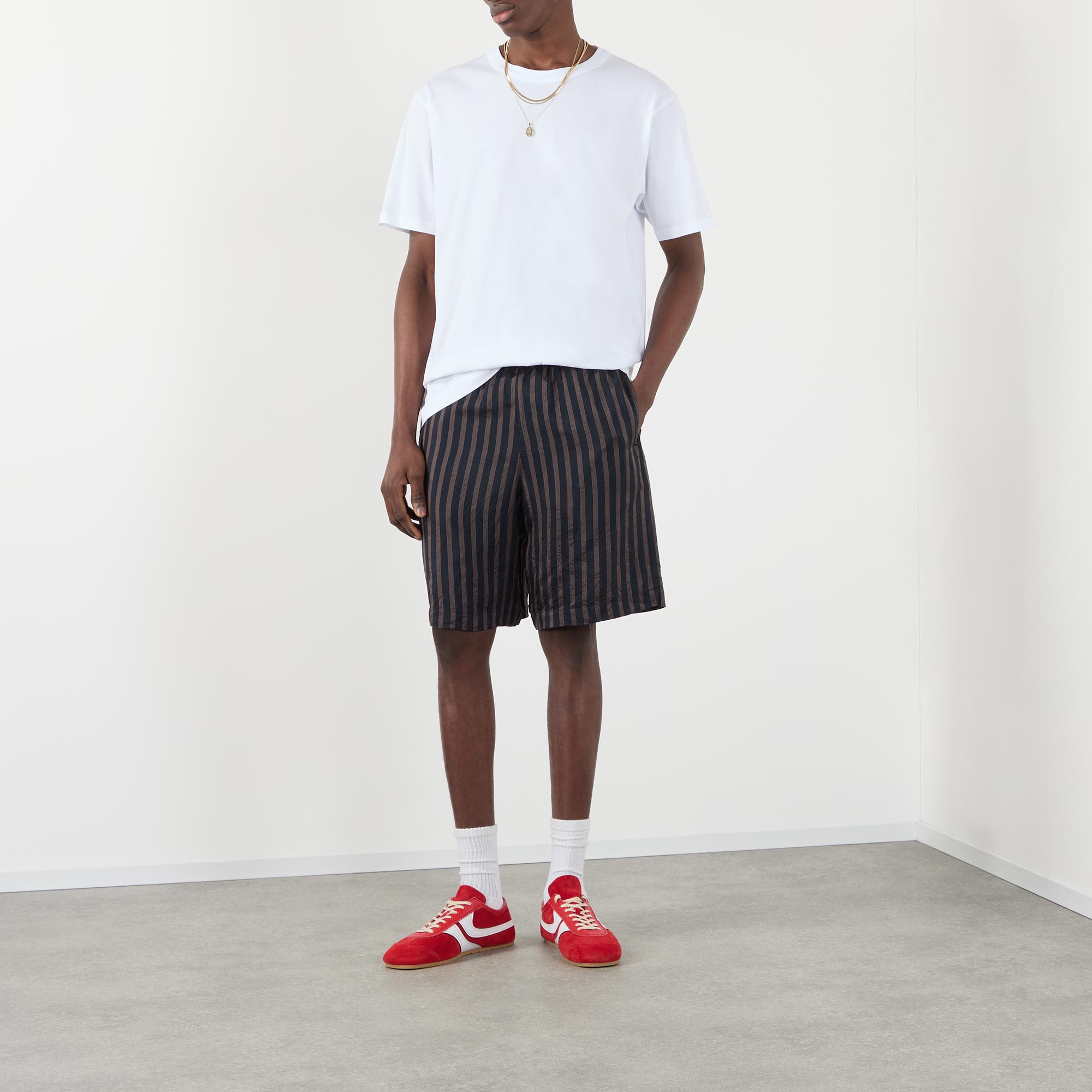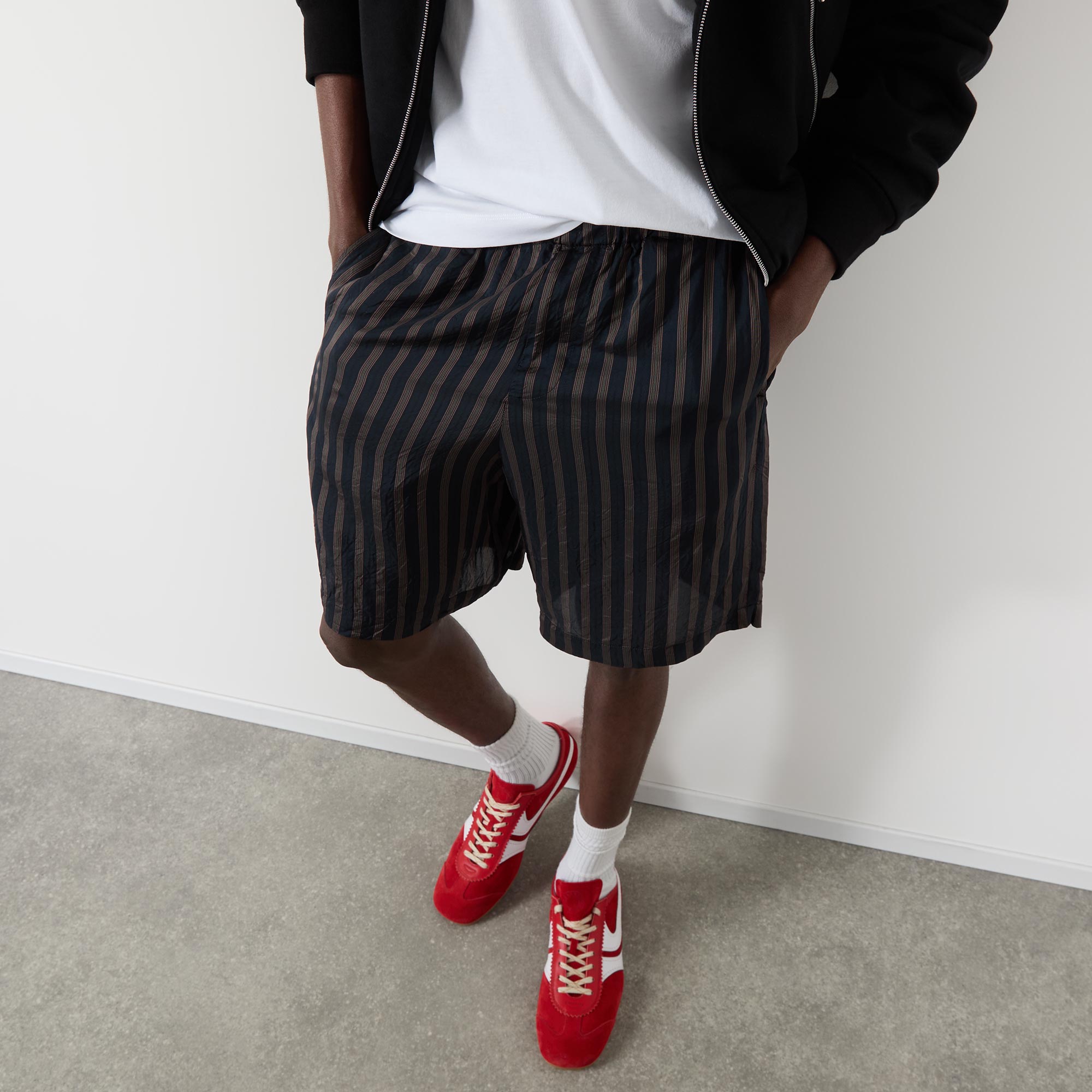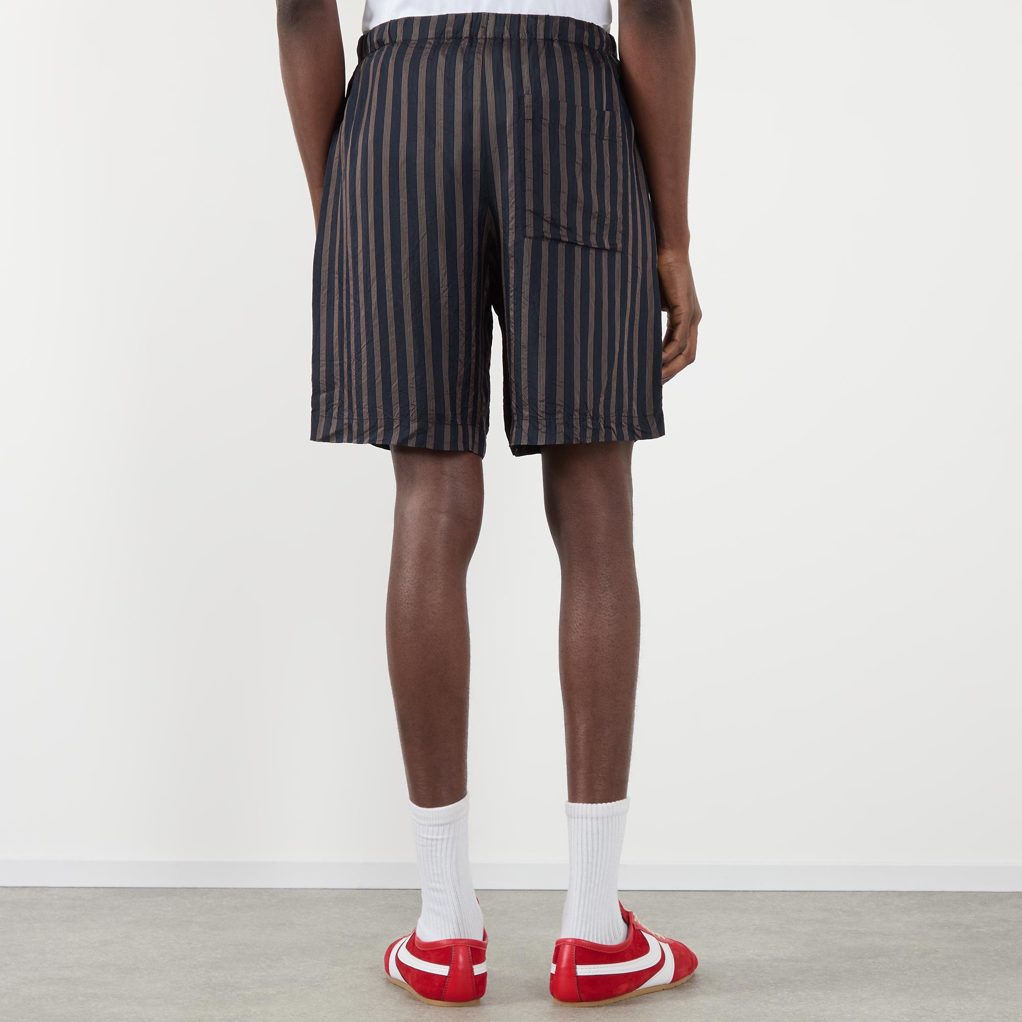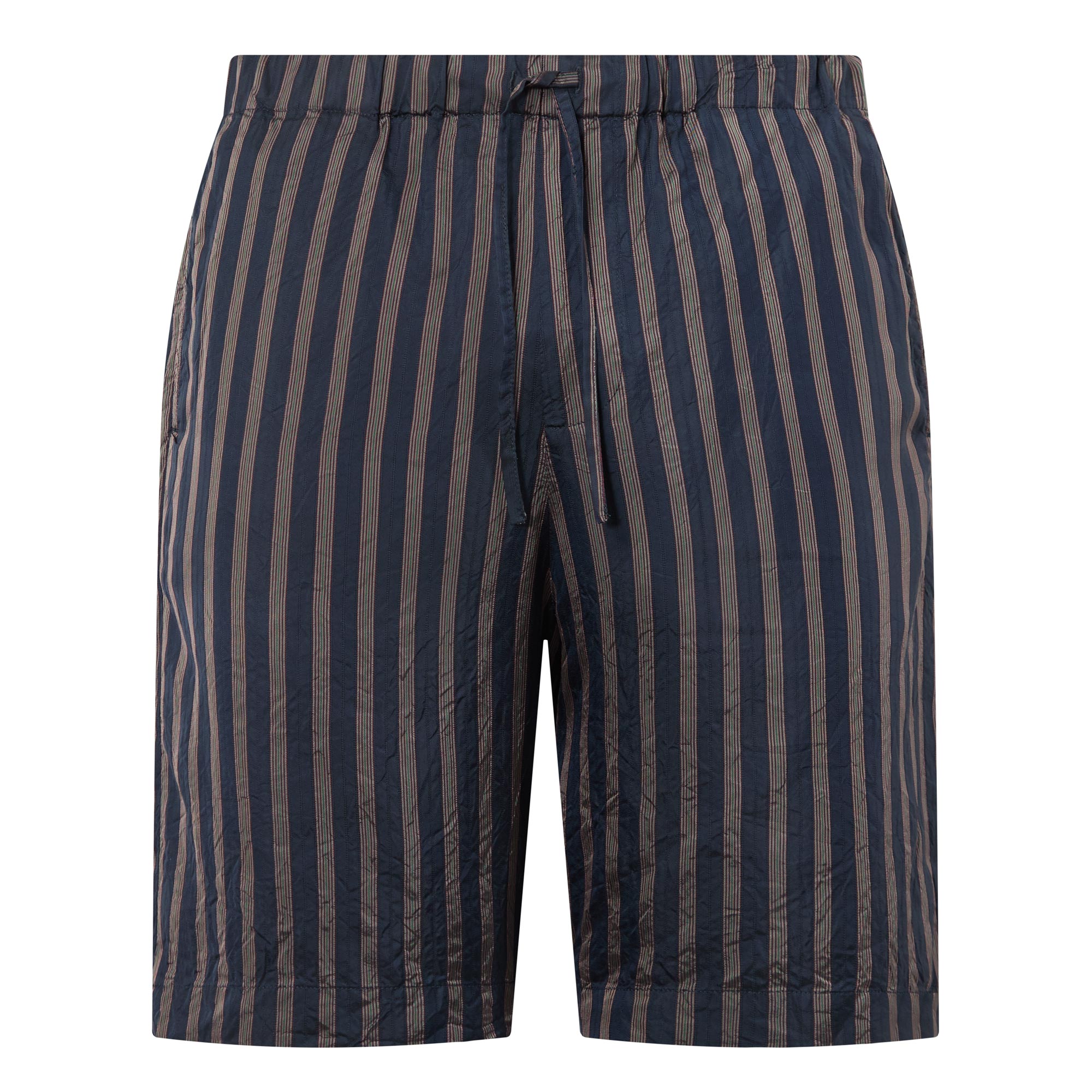 • Mid rise, straight leg, above-the-knee length, elasticated waistband, drawstring fastening, two side entry pockets, one rear patch pocket, clean hems, striped pattern, textured finish