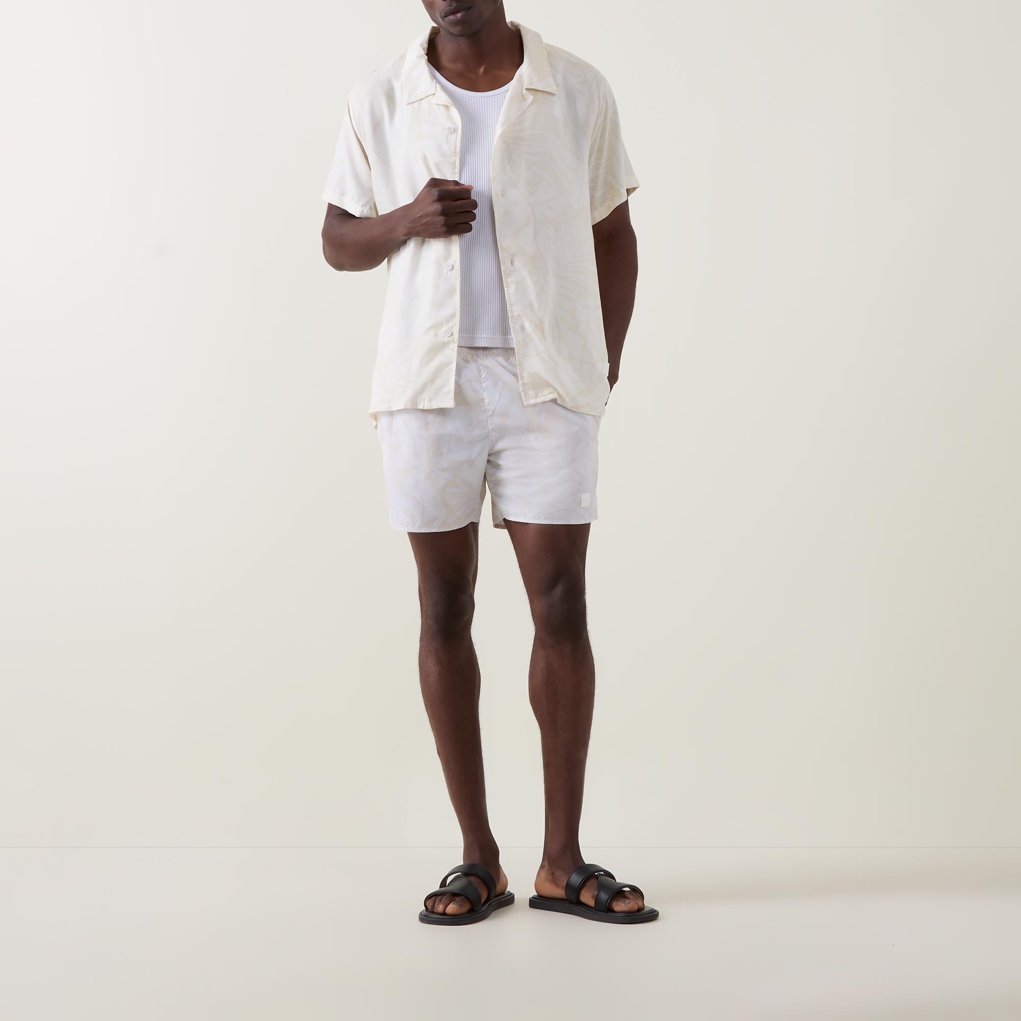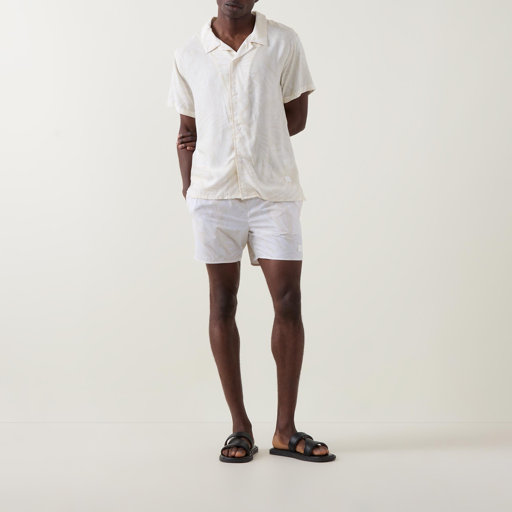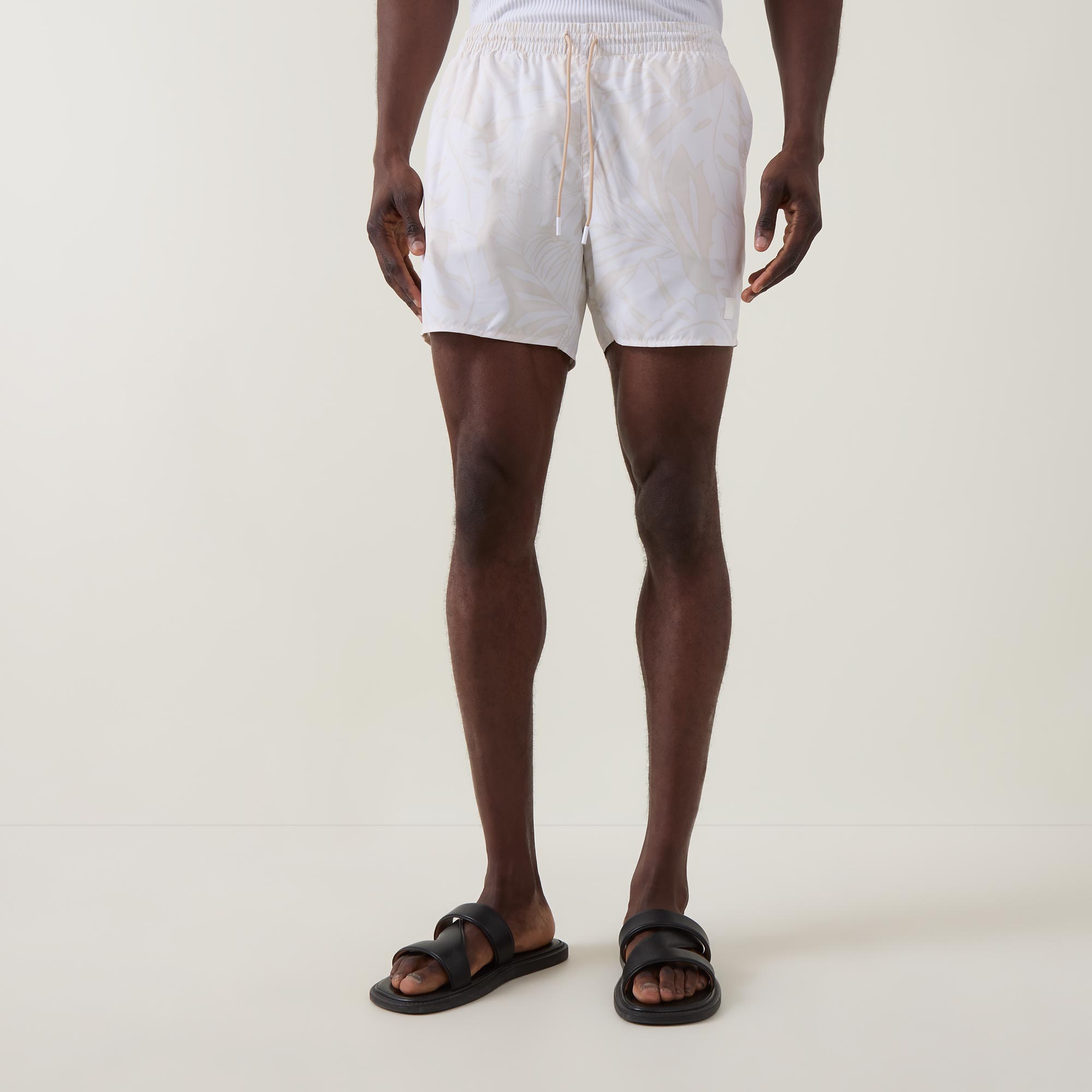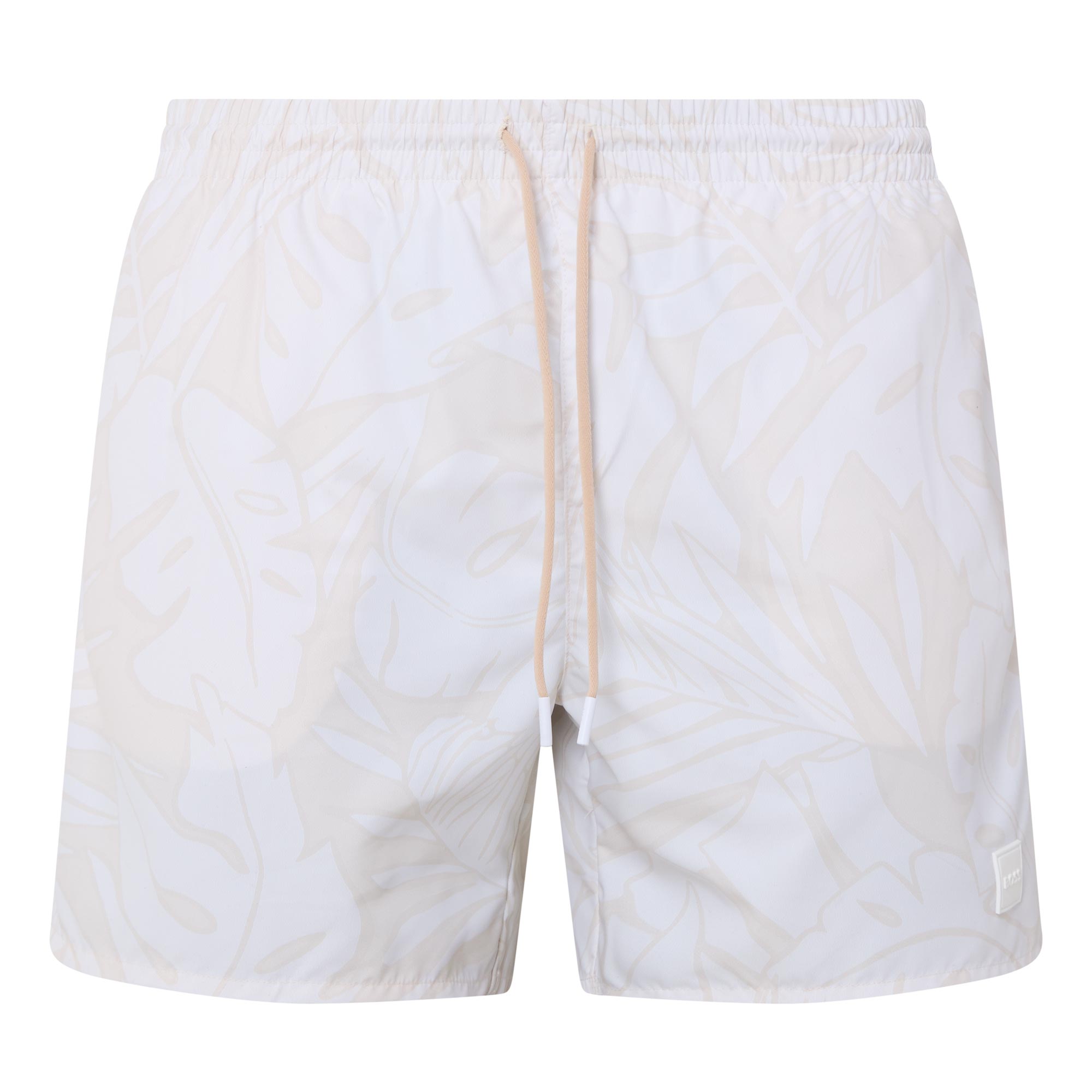 - Elasticated drawstring waistband, front logo patch, two side in-seam pockets, one rear patch pocket with logo detail, beach print, mid-rise, straight-cut leg, smooth finish