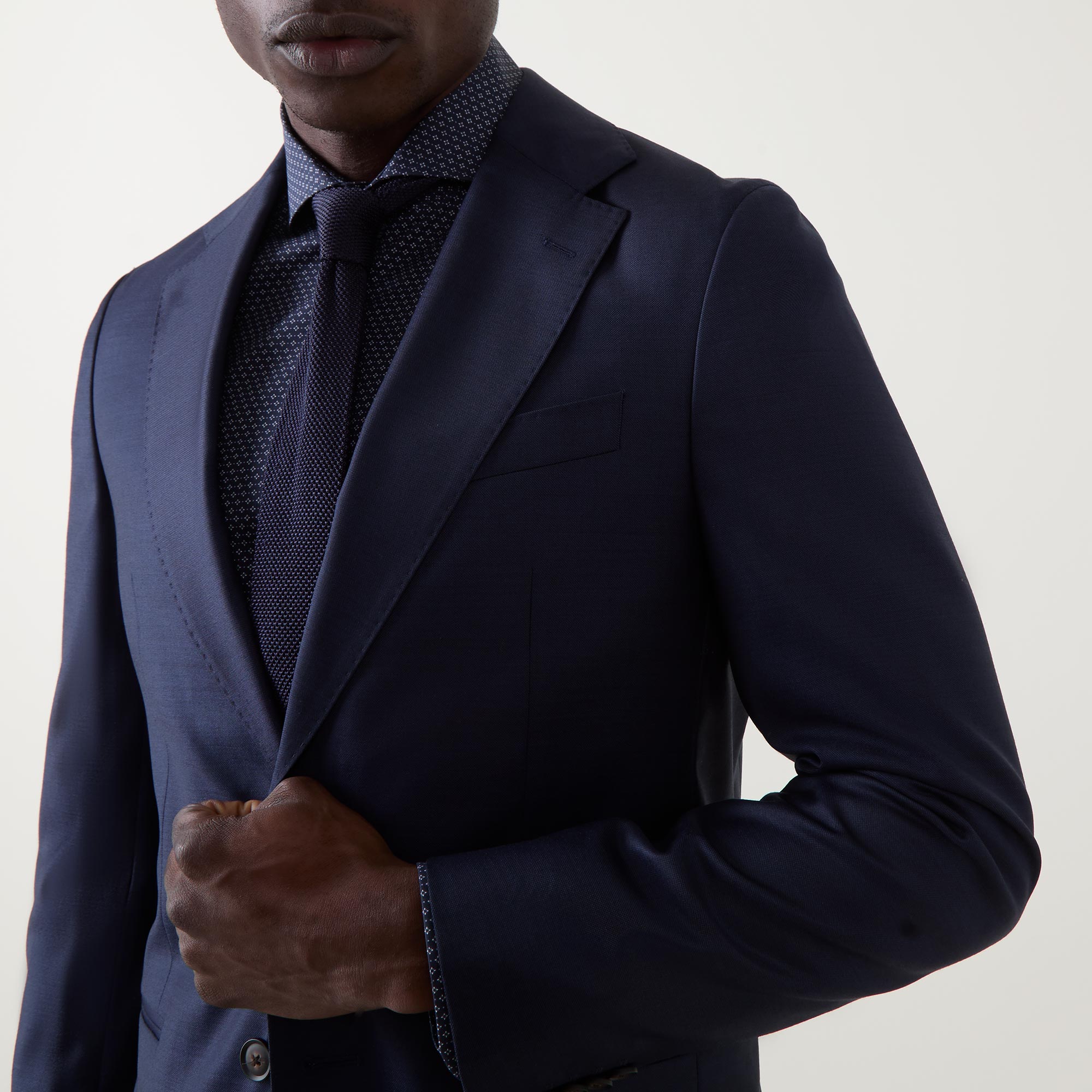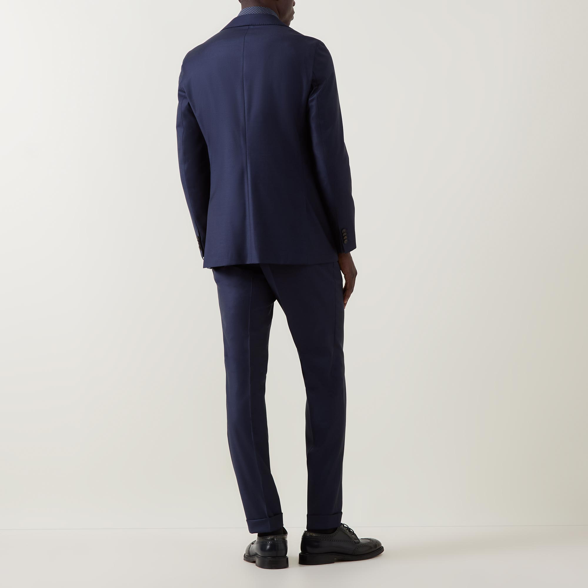 - Suit trousers: Flat front, belt loops, side entry pockets, rear welt pockets, pressed creases, logo detail