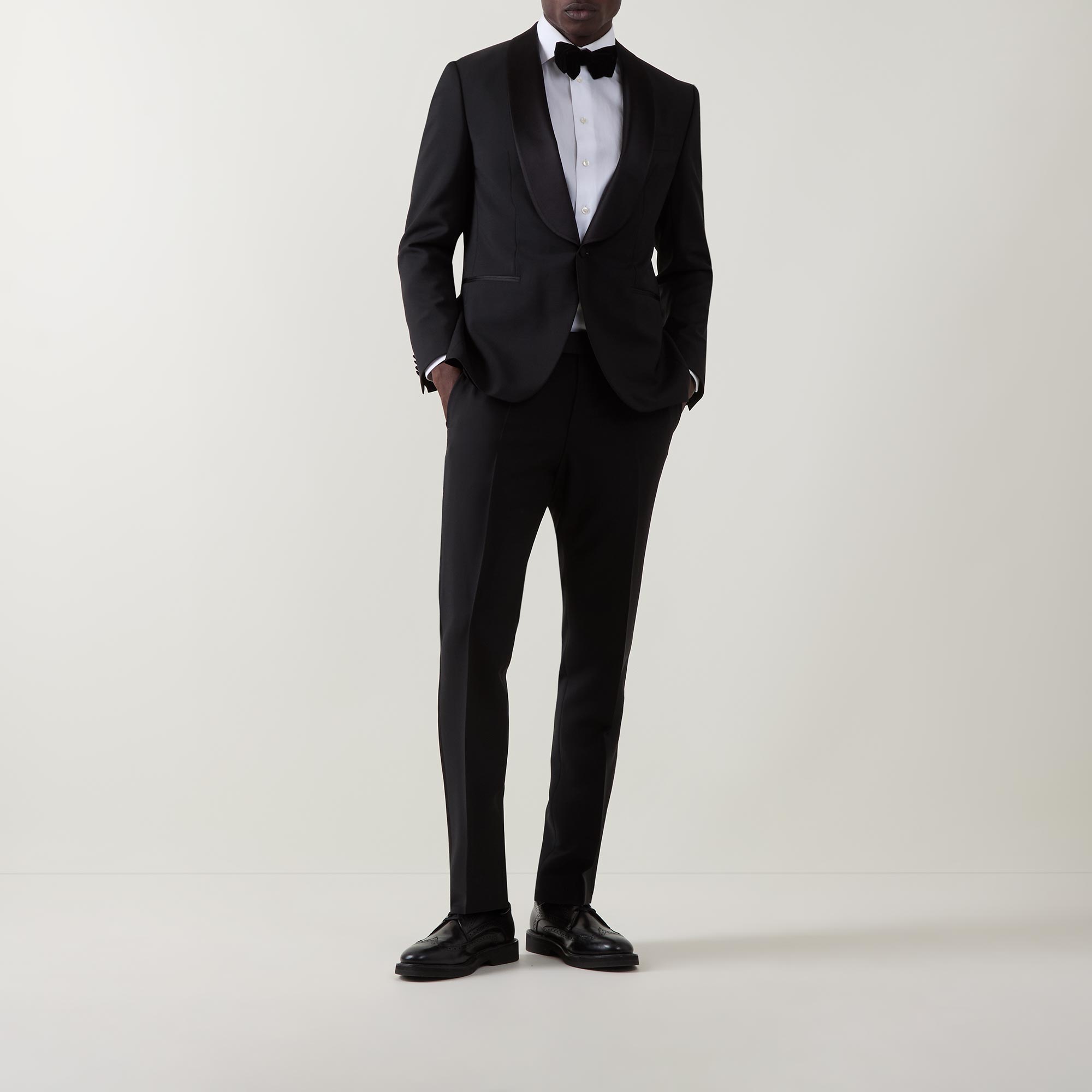 • Two-piece: Jacket: Single-breasted front, shawl lapel collar, long sleeves, buttoned cuffs, front button fastening, chest welt pocket, two side jetted pockets with tonal trim detailing, rear vents. Trousers: Mid rise, slim leg, belt loops, concealed zip-fly and hook-and-bar fastening, clean hems pressed creases
