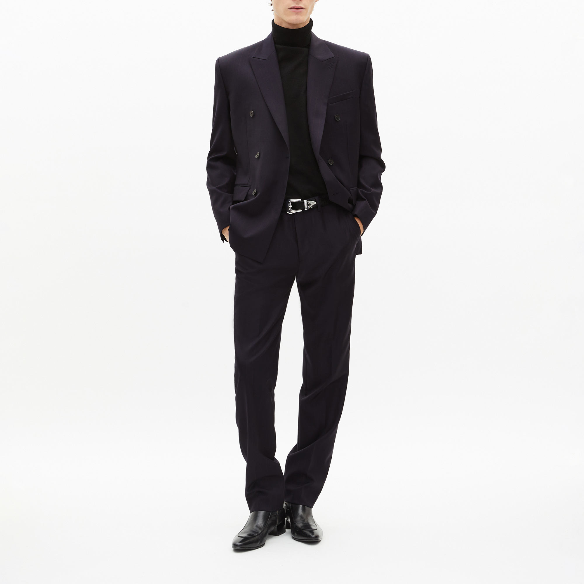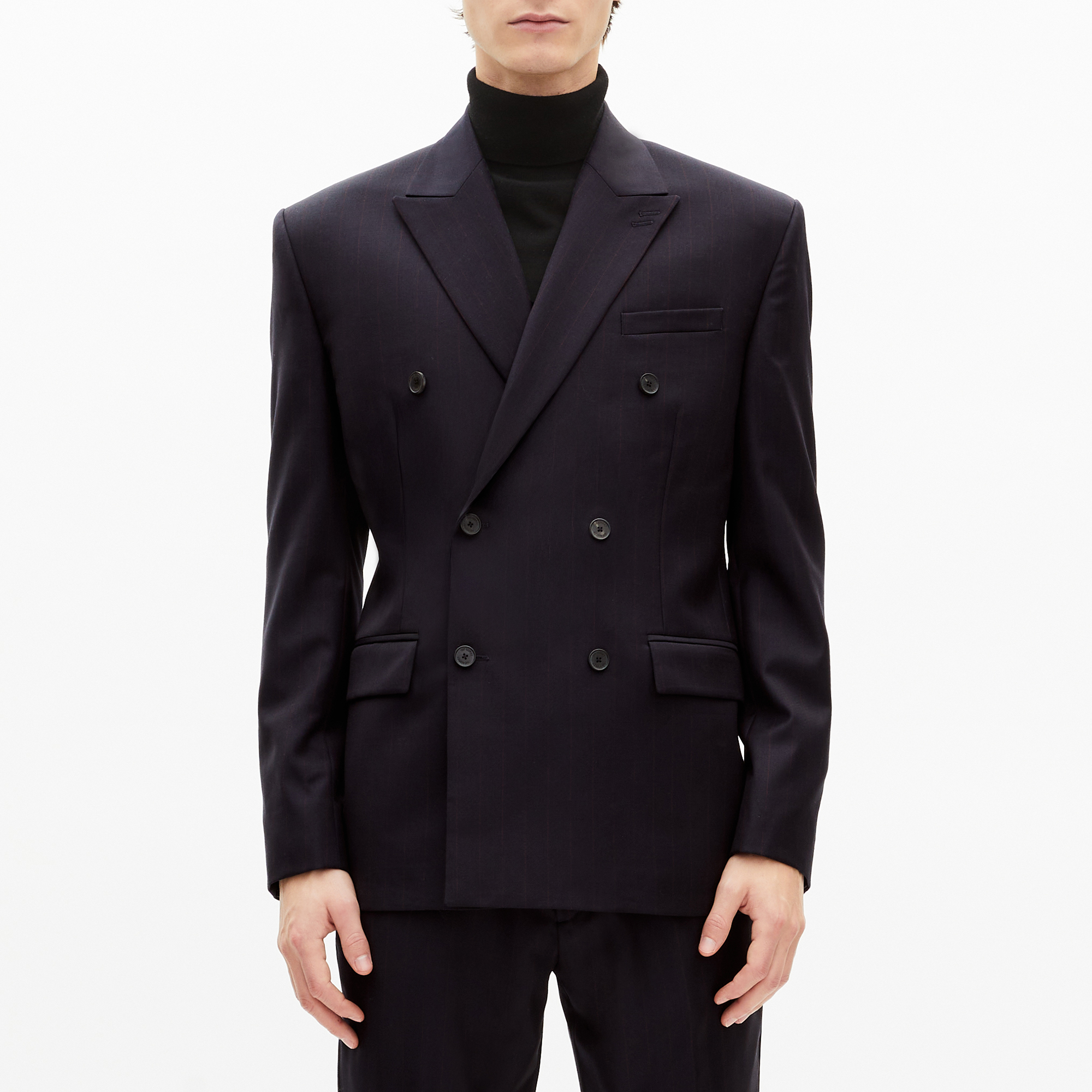 - Straight cut, notched collar, double-breasted, long sleeves, flap pockets, horn buttons, heirloom cuff buttons, pinstripes