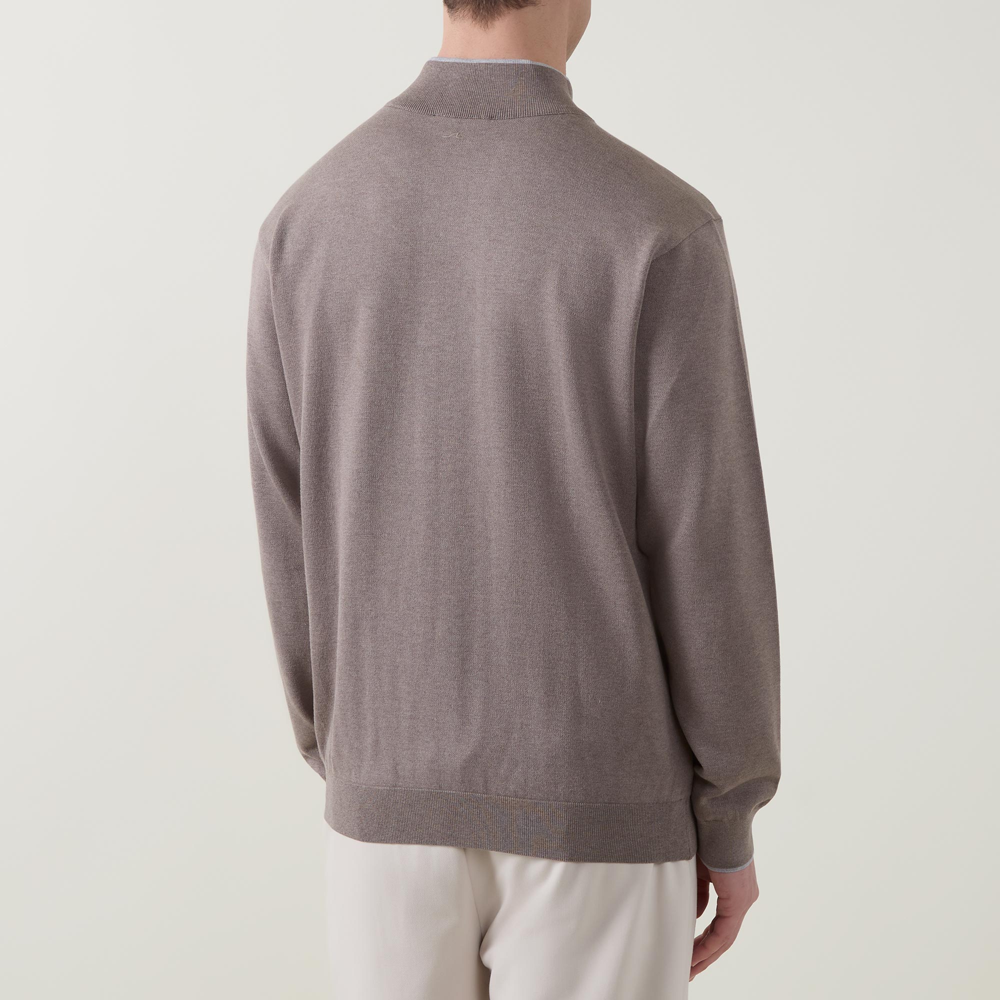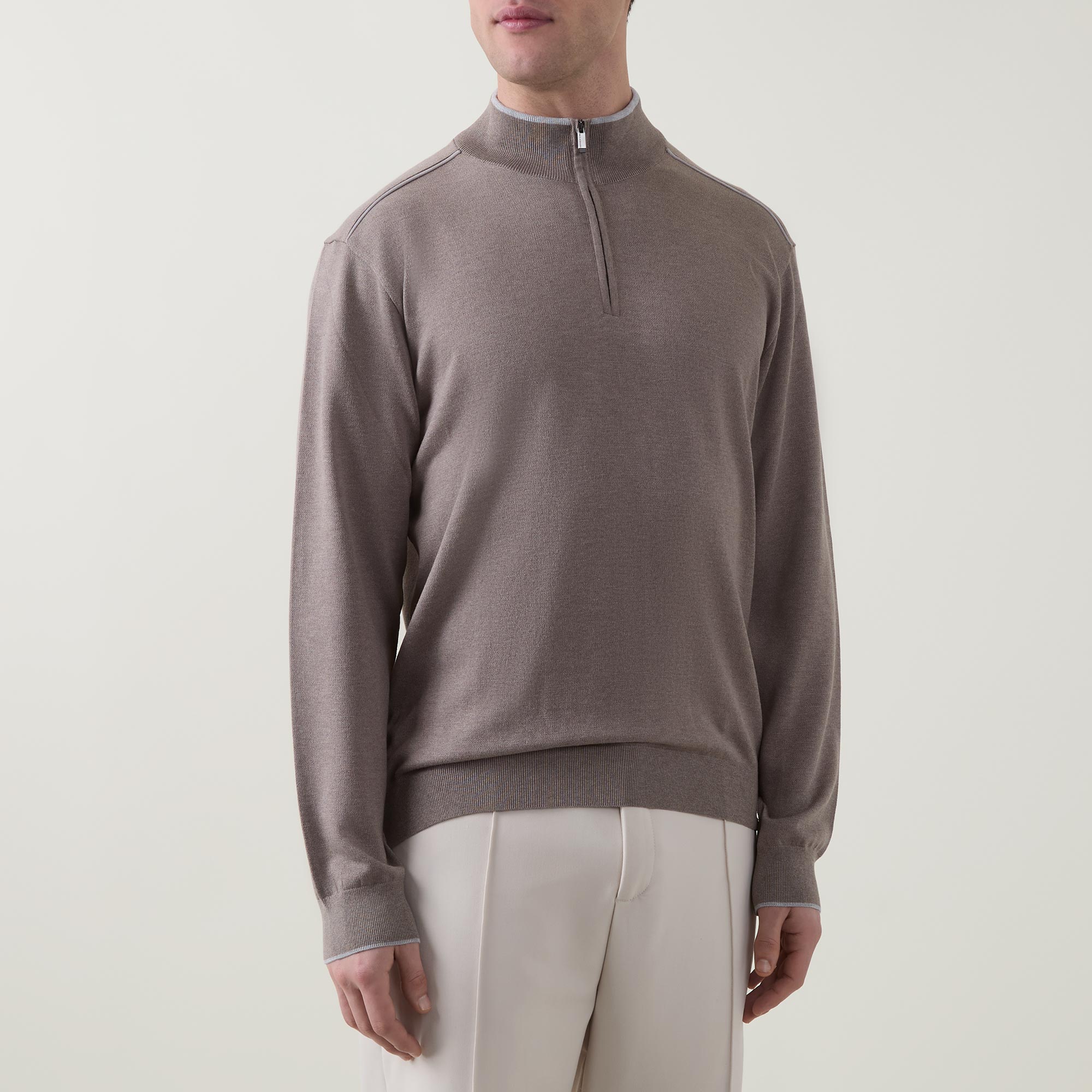 - Stand-up collar, long sleeves, contrast piping, half zip-fastening placket, stretch cuffs, logo patch on hem, smooth fabric