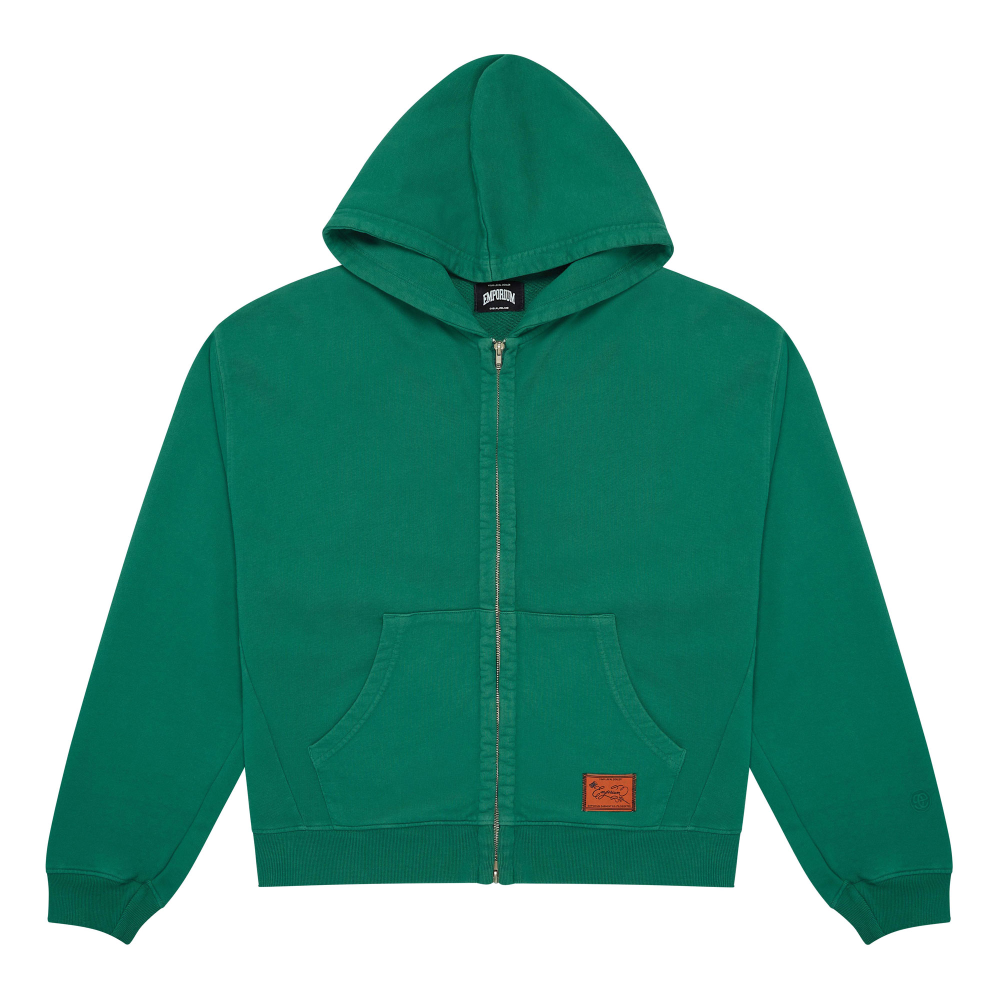 • Hood, long sleeves, YKK double zip, split kangaroo pocket, straight hem, ribbed trims, hidden internal screenprint, logo badge