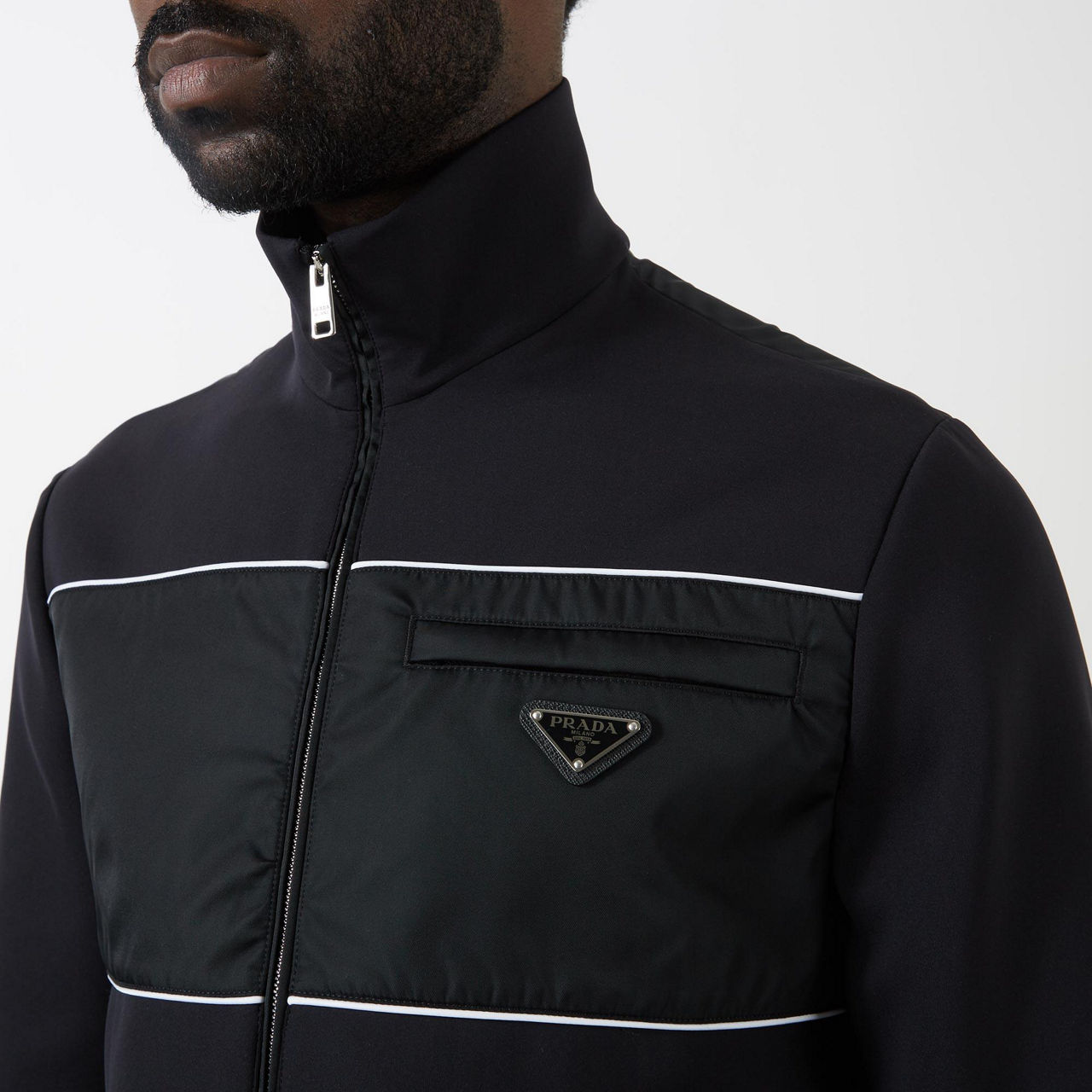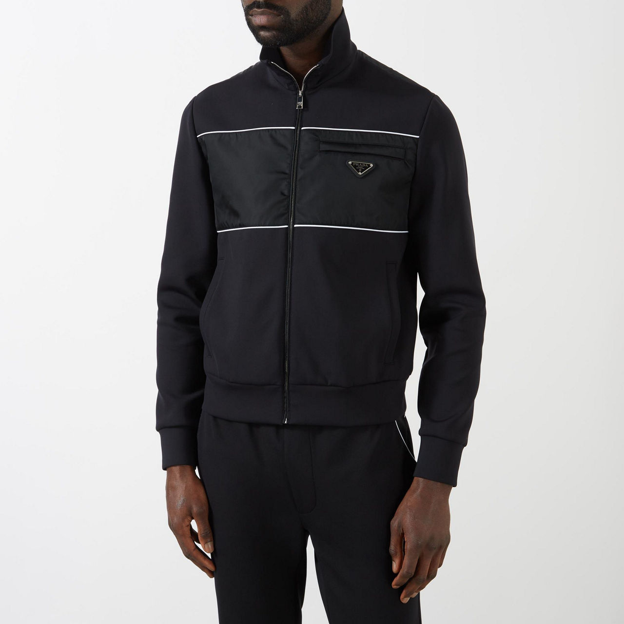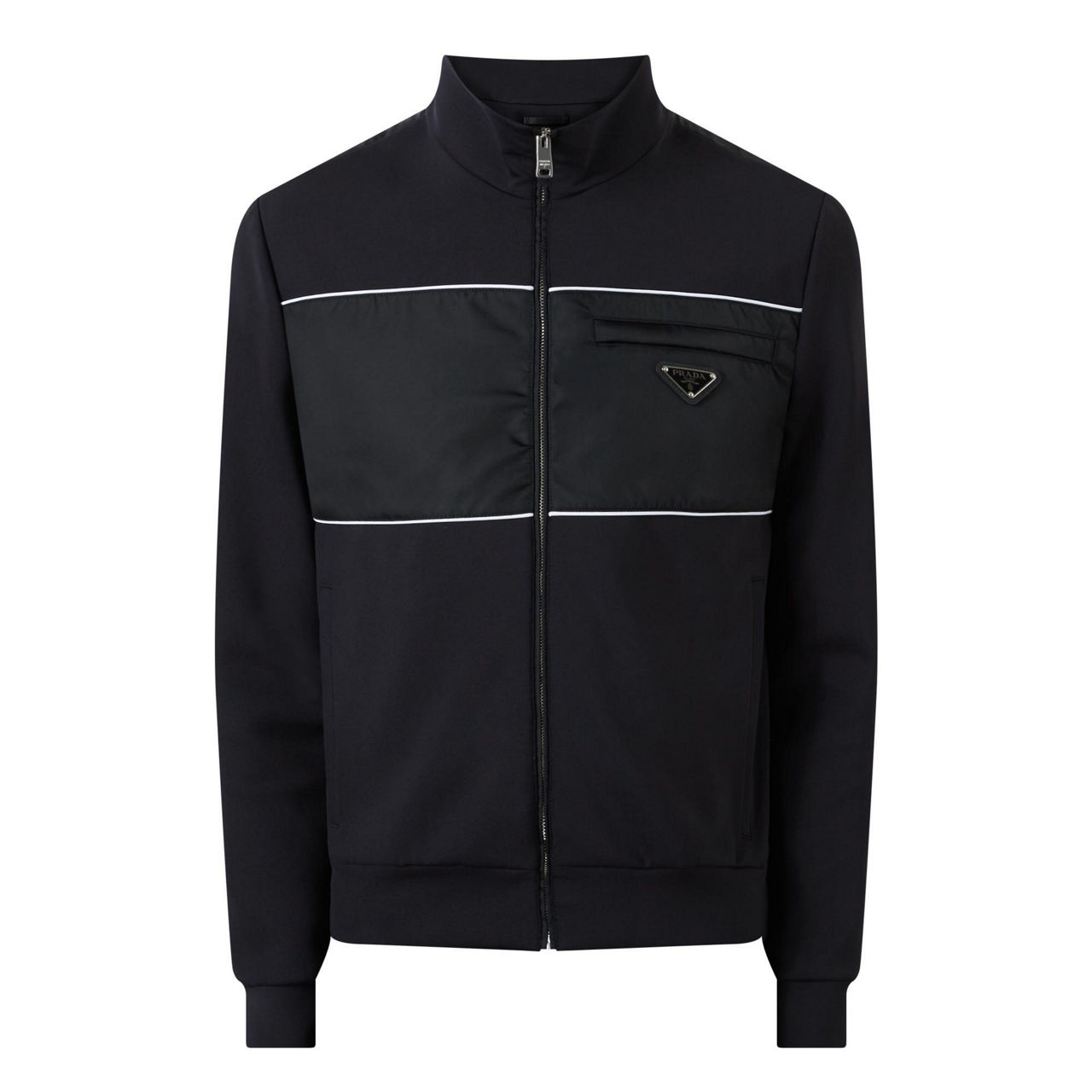- Long sleeves, stand-up collar, zip-through fastening, slit pockets, contrast piping, chest pocket, triangle logo plaque detail, elasticated hemline, stretch cuffs, smooth fabric