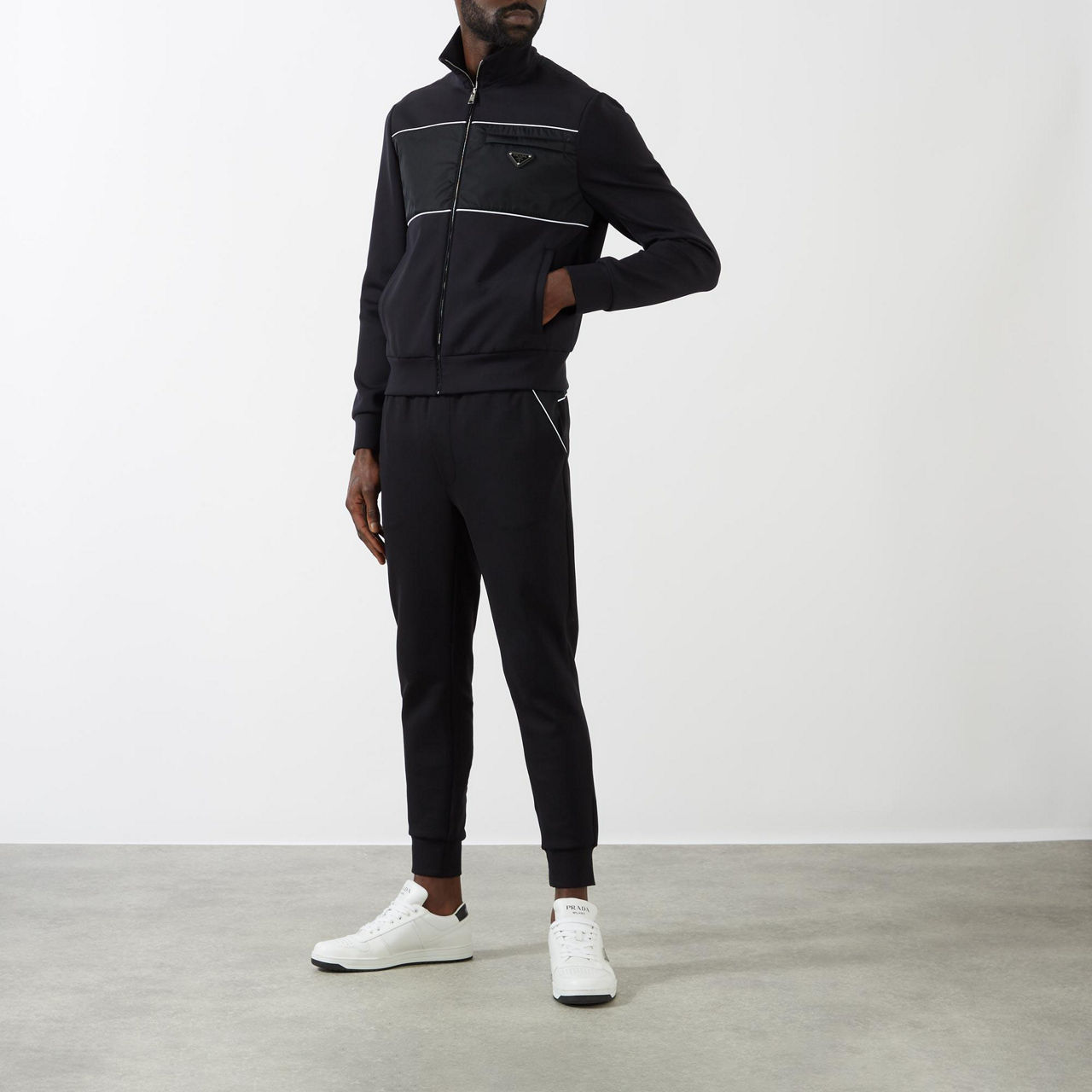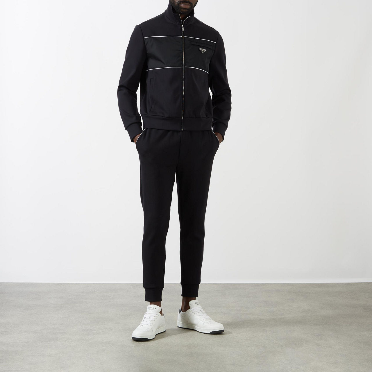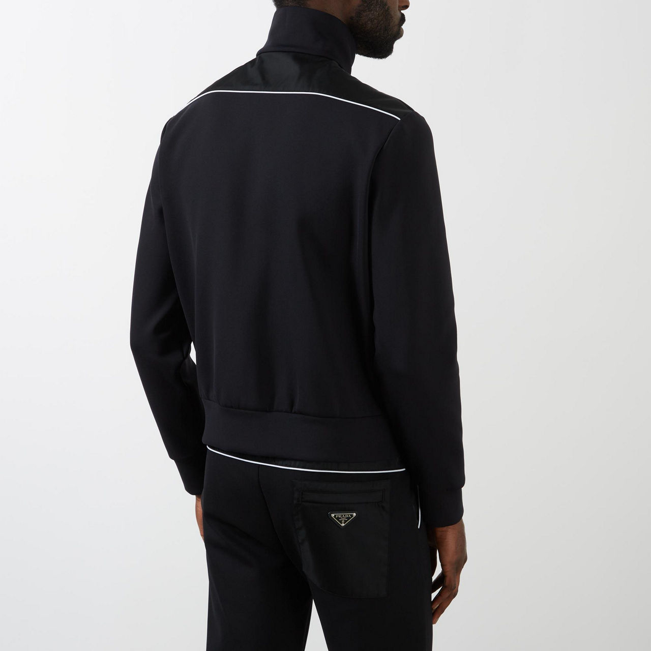 - Long sleeves, stand-up collar, zip-through fastening, slit pockets, contrast piping, chest pocket, triangle logo plaque detail, elasticated hemline, stretch cuffs, smooth fabric