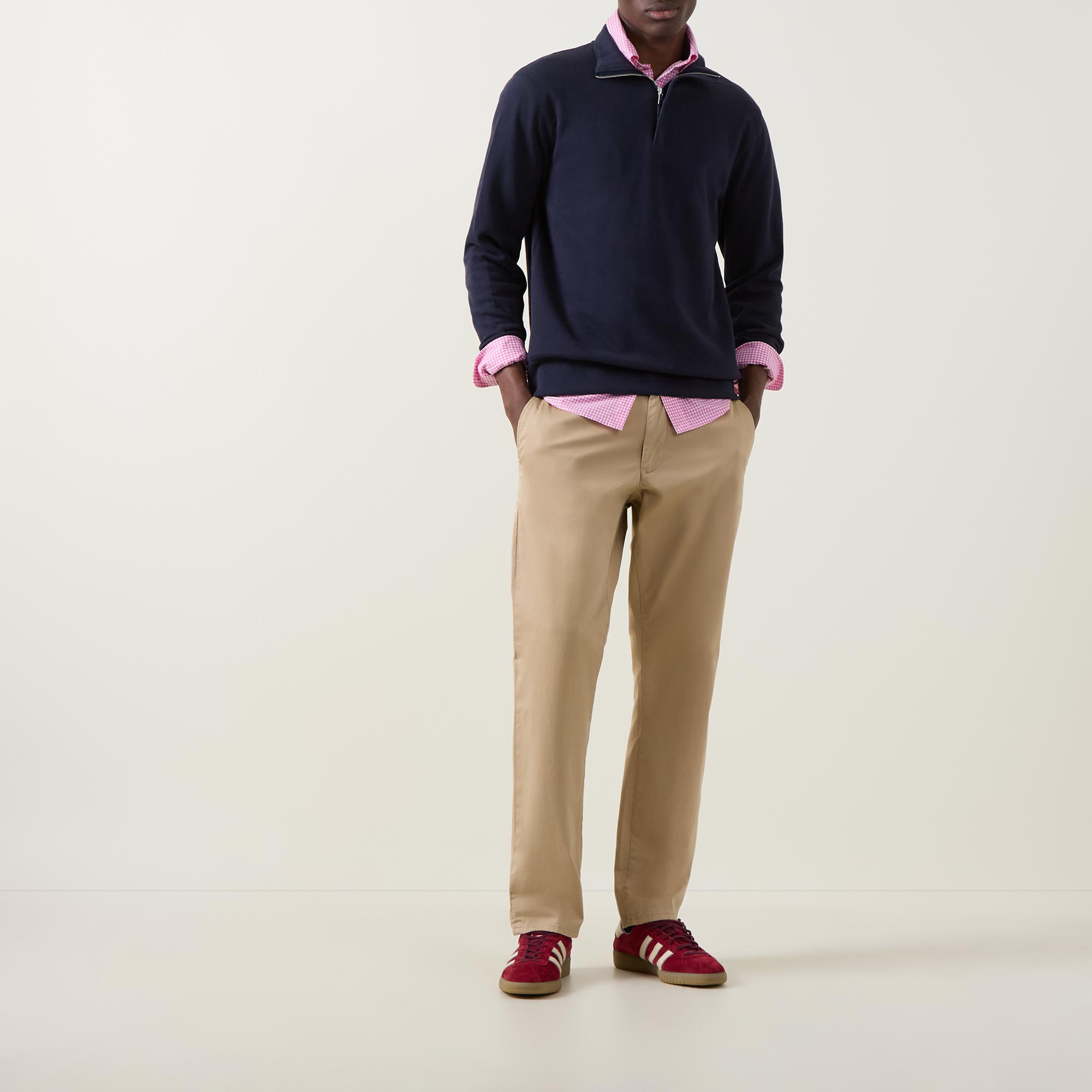 - Half-zip fastening, long sleeves, concealed zip, ribbed trims, straight hemline