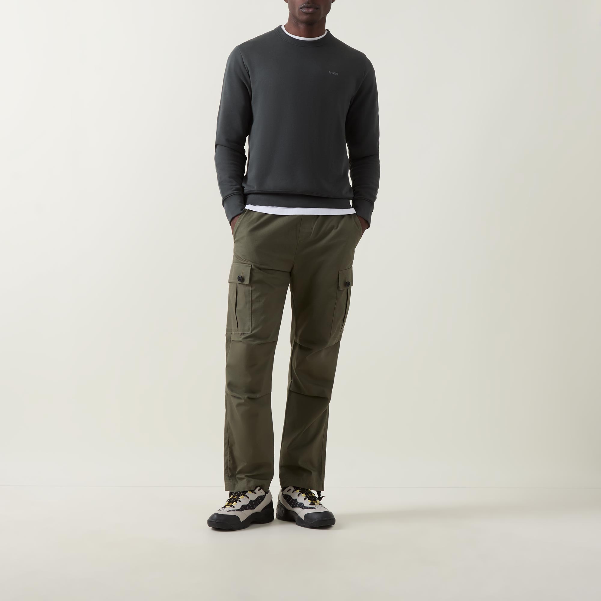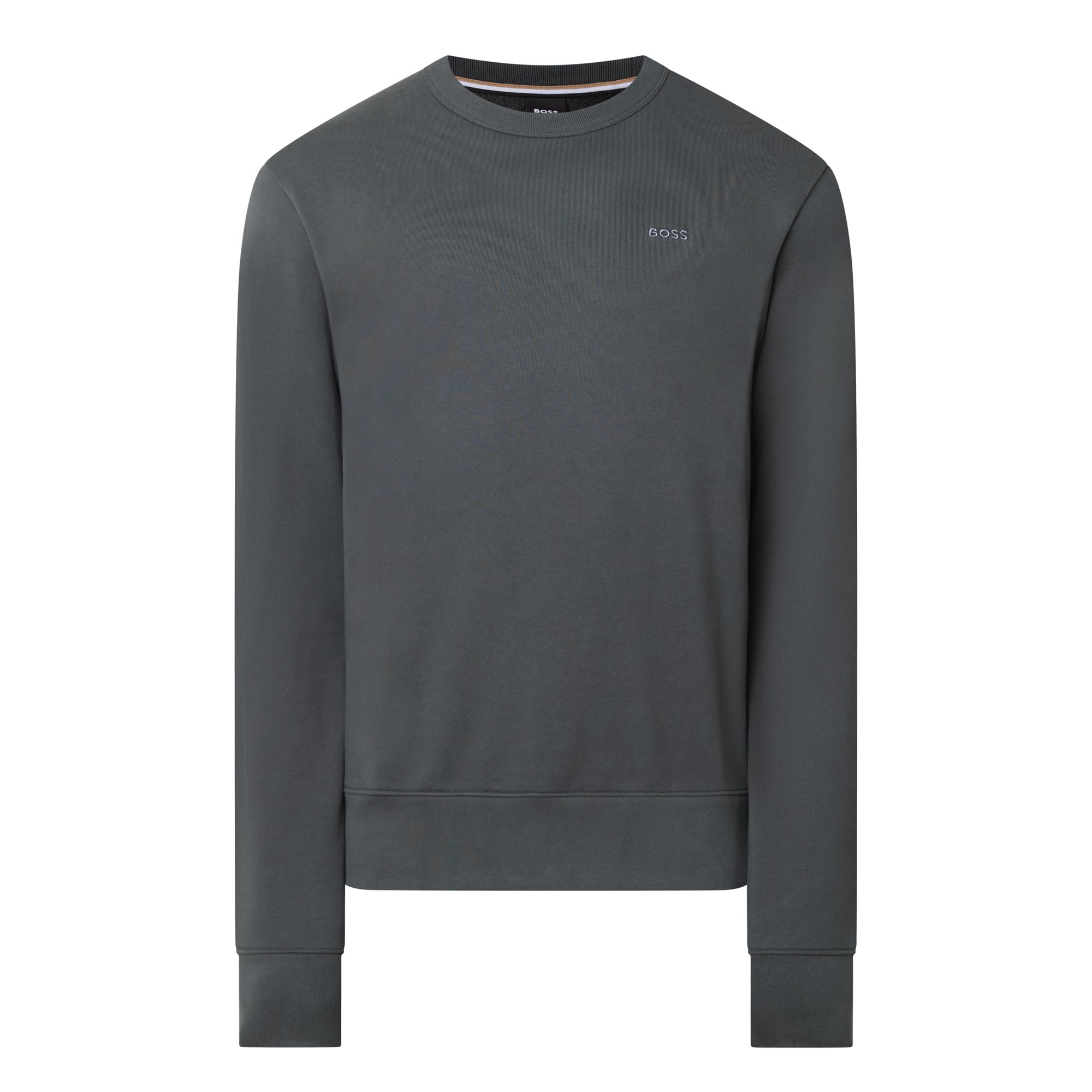- Crew neckline, long sleeves, ribbed trims, logo detail, straight hemline