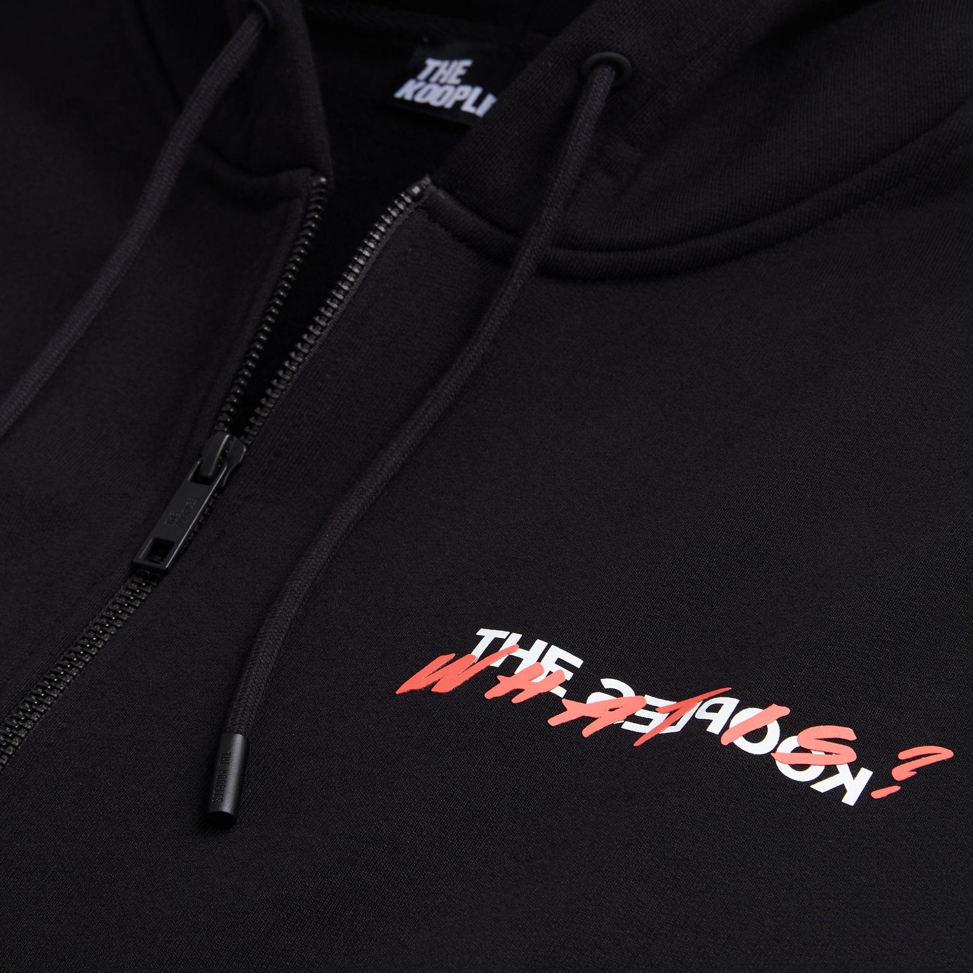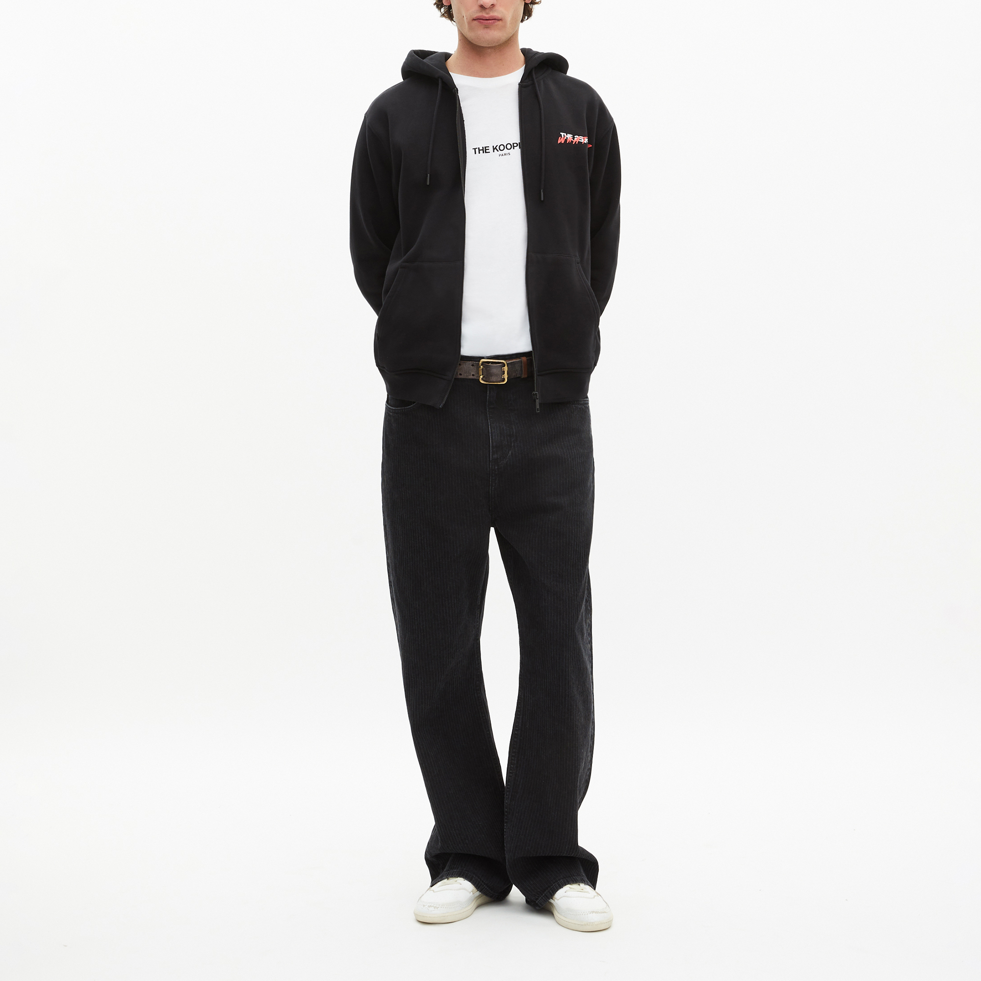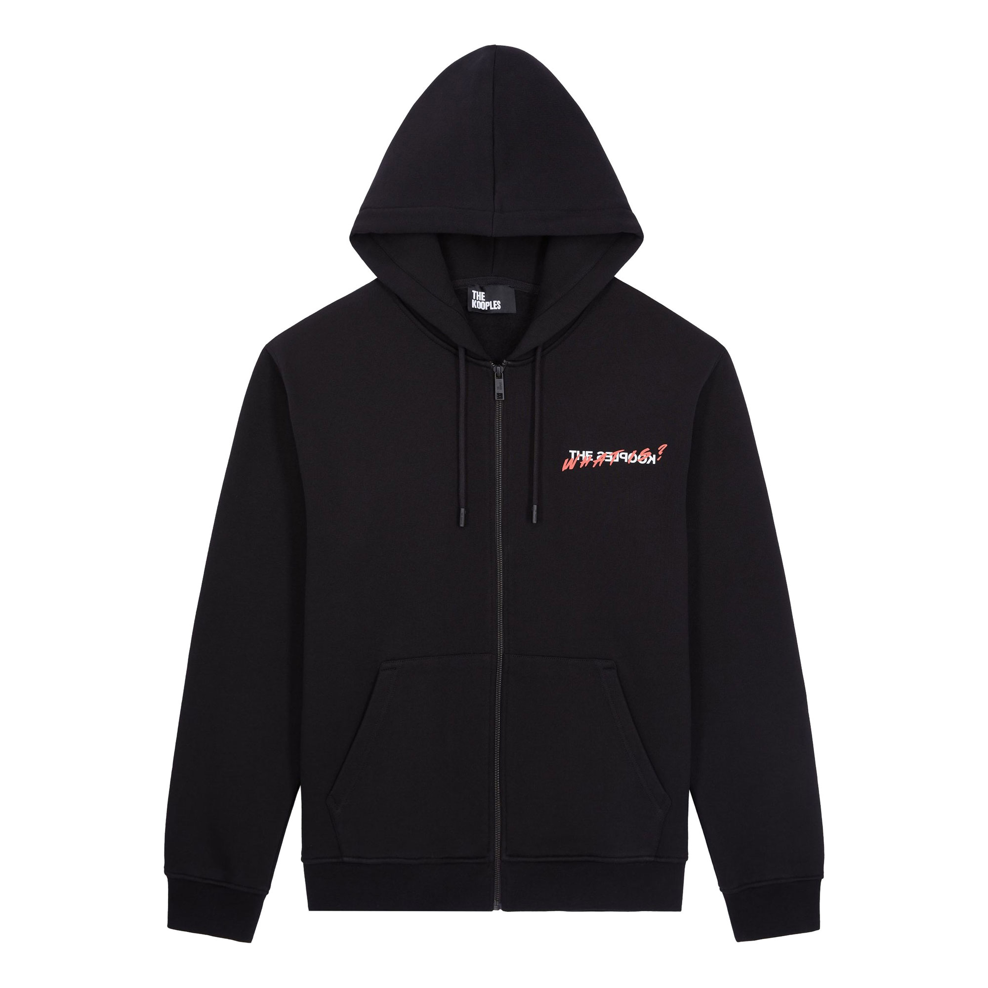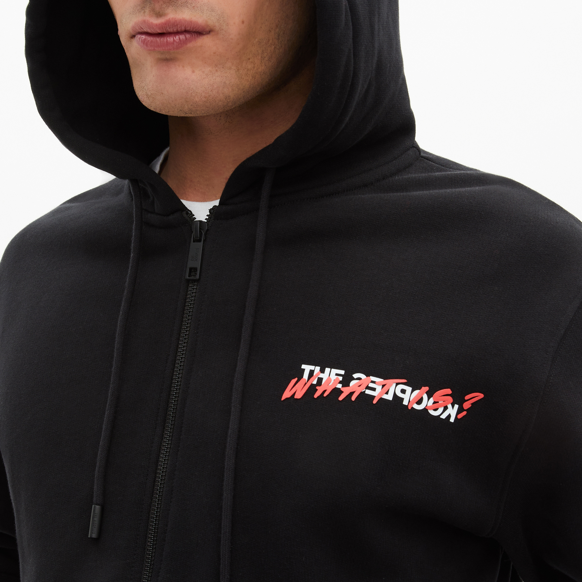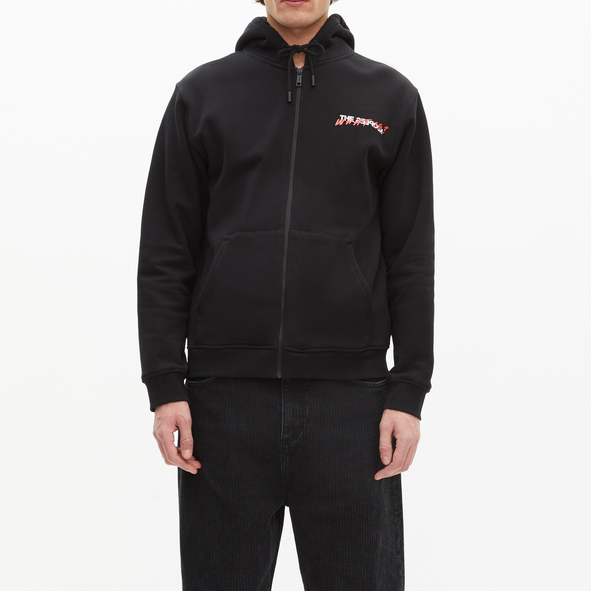 • Hood with drawstring, long sleeves, zipped closure, kangaroo pocket, ribbed edges, red and white serigraphy on the front, white serigraphy on the back