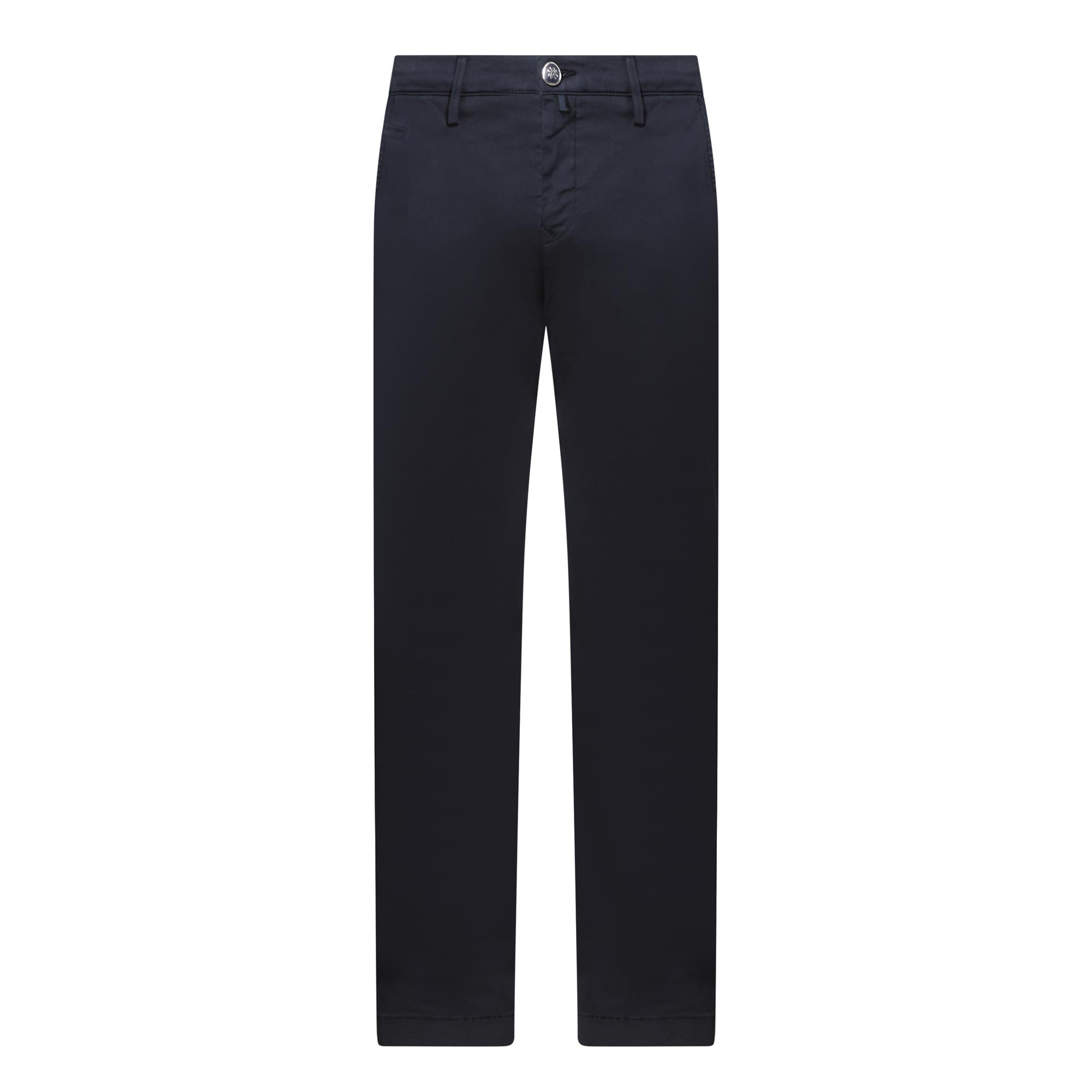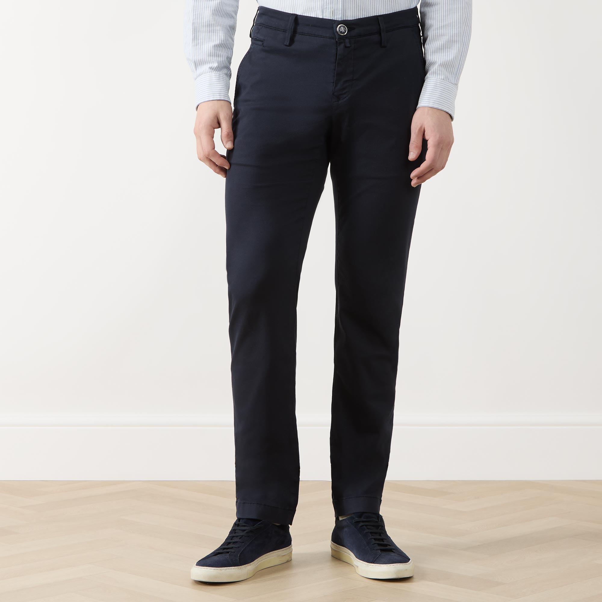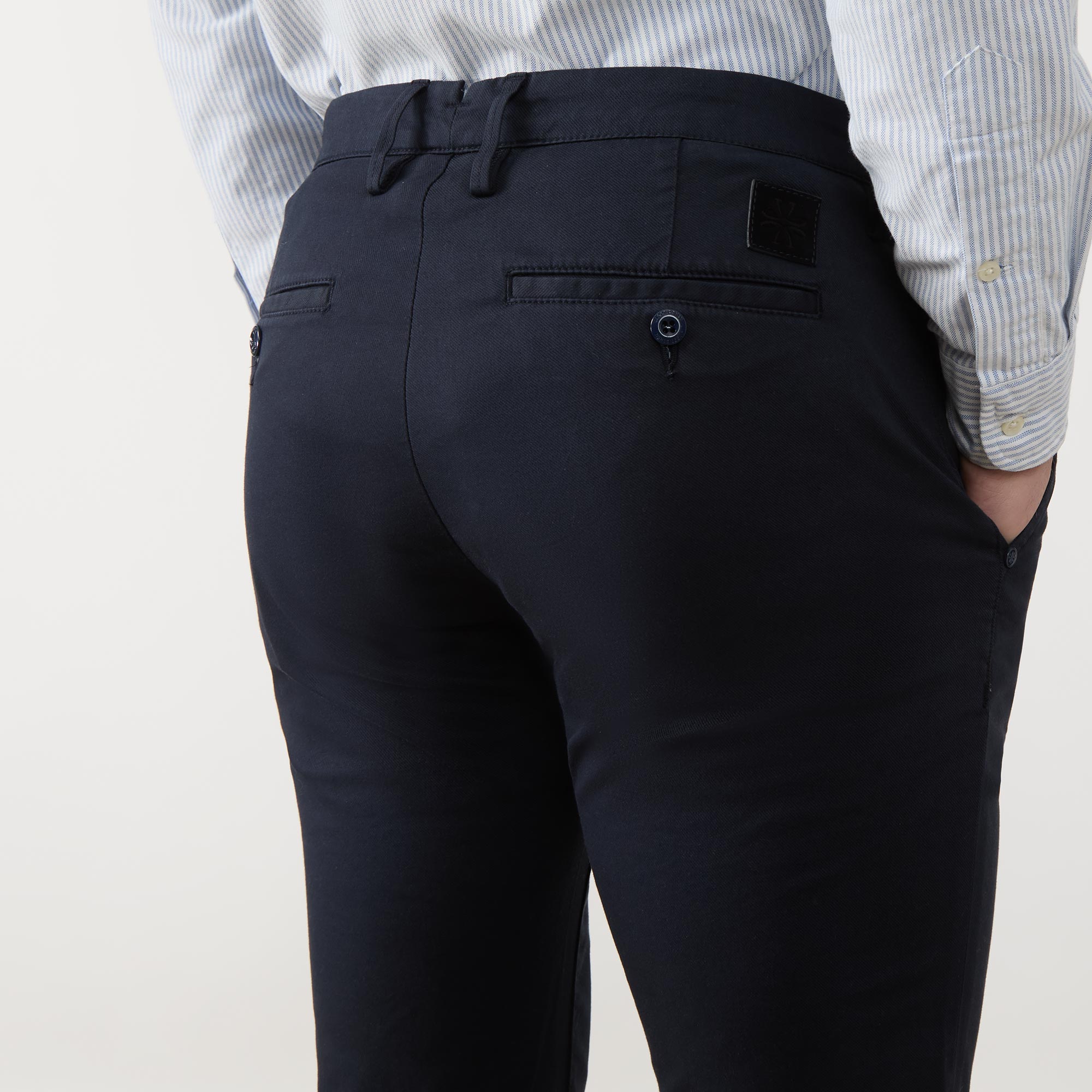 - Zip-fly and button fastening, belt loops, two side in-seam pockets, two rear welt pockets with button fastenings, clean hems, tonal stitching, rear logo patch, mid-rise, slim-cut leg, smooth fabric