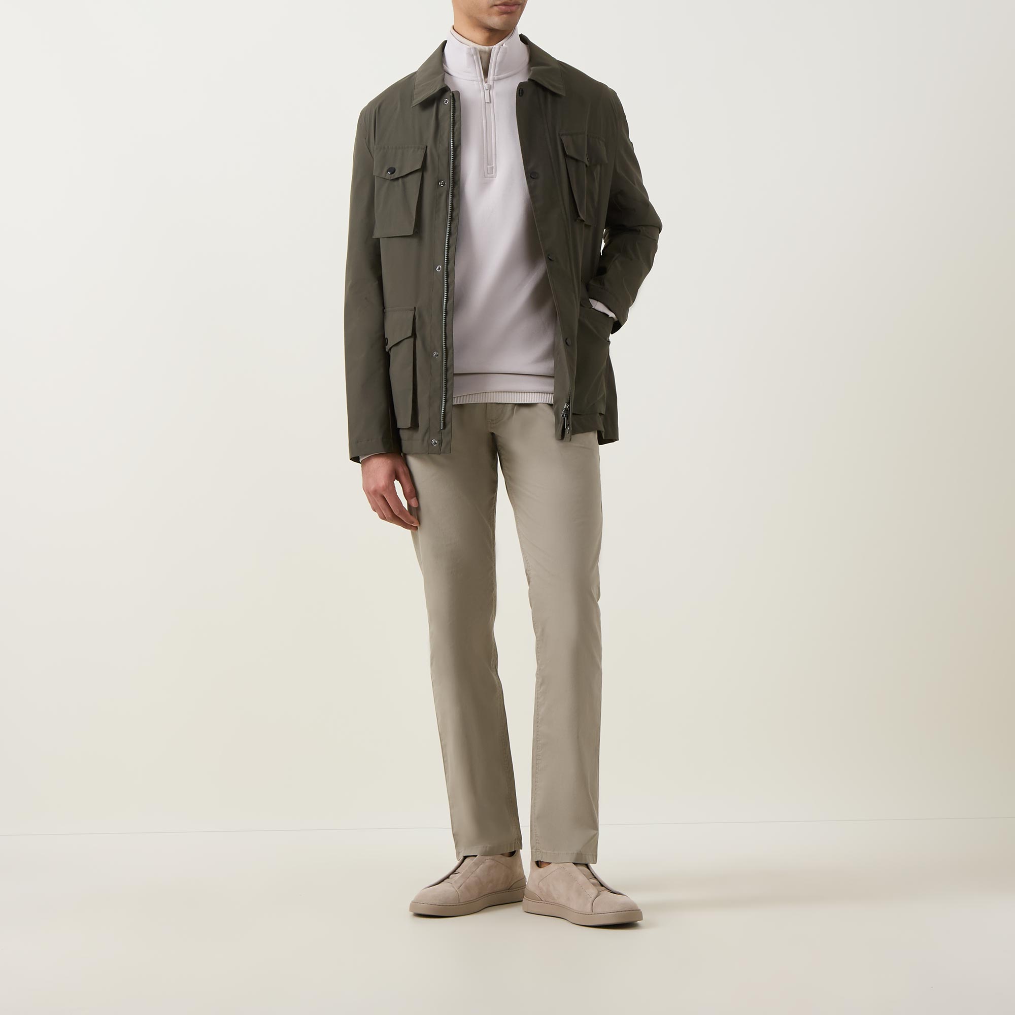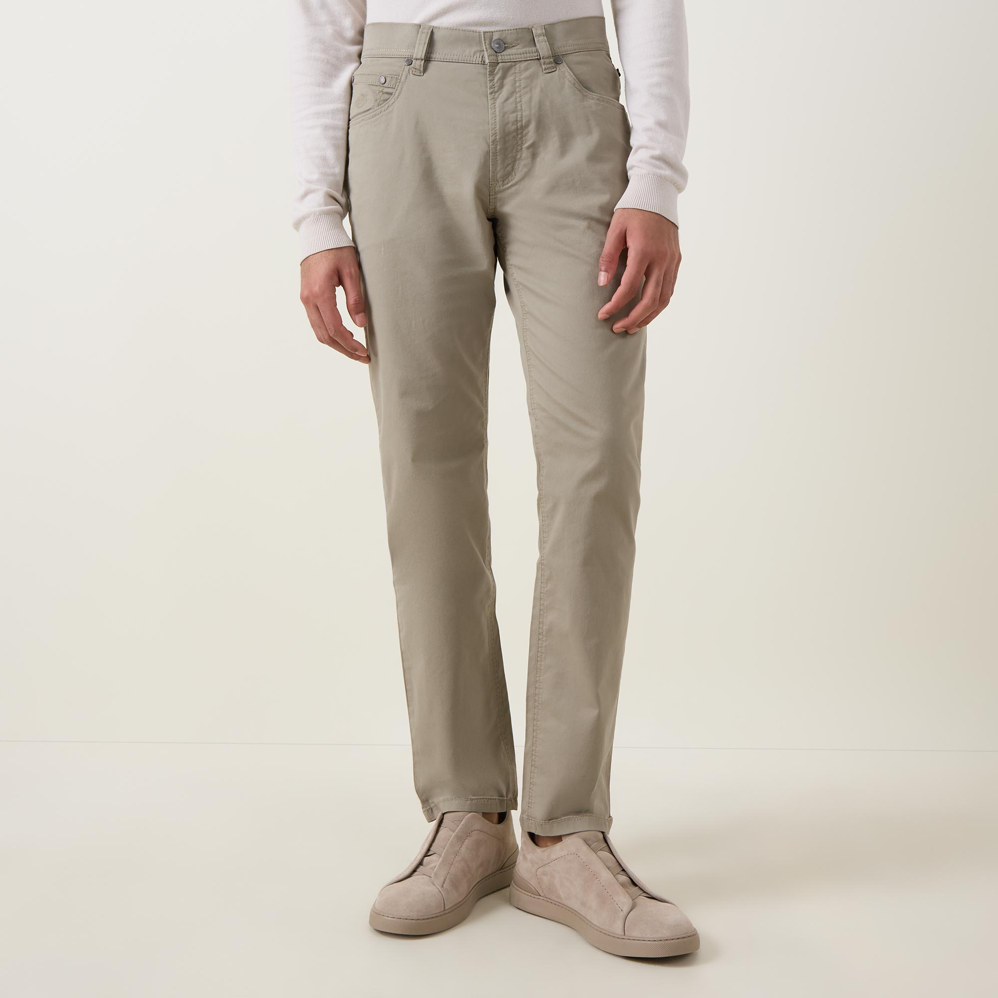 - Button and fly zip fastening, belt loops, side entry pockets, rear patch pockets, straight-cut legs, logo badge