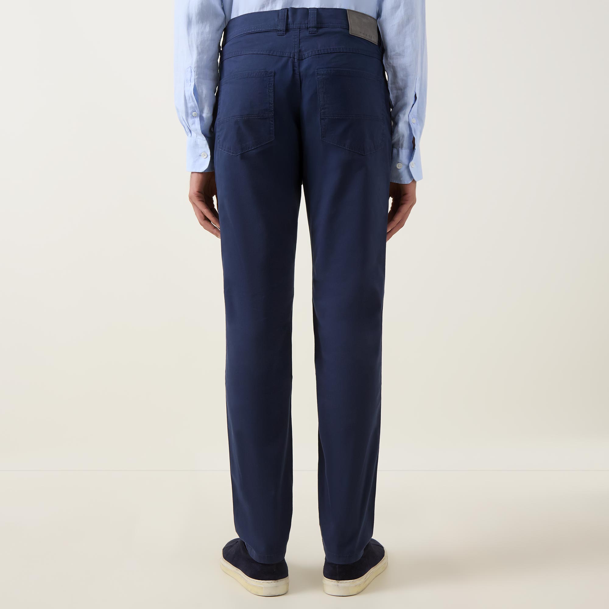 - Button and fly zip fastening, belt loops, side entry pockets, rear patch pockets, straight-cut legs, logo badge