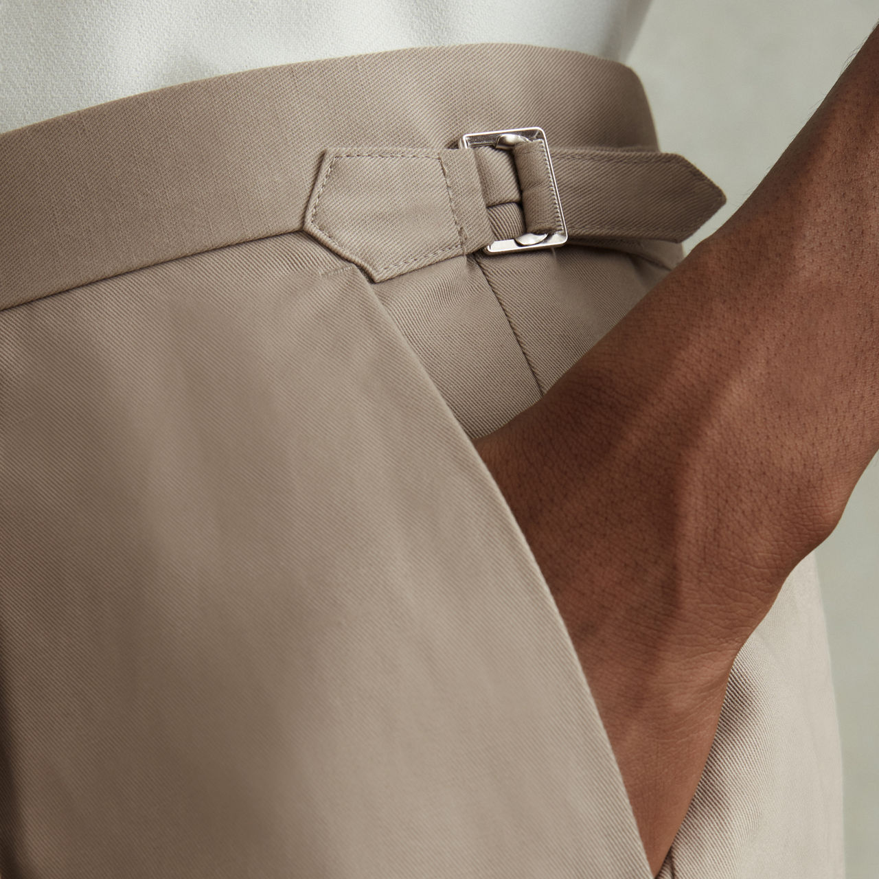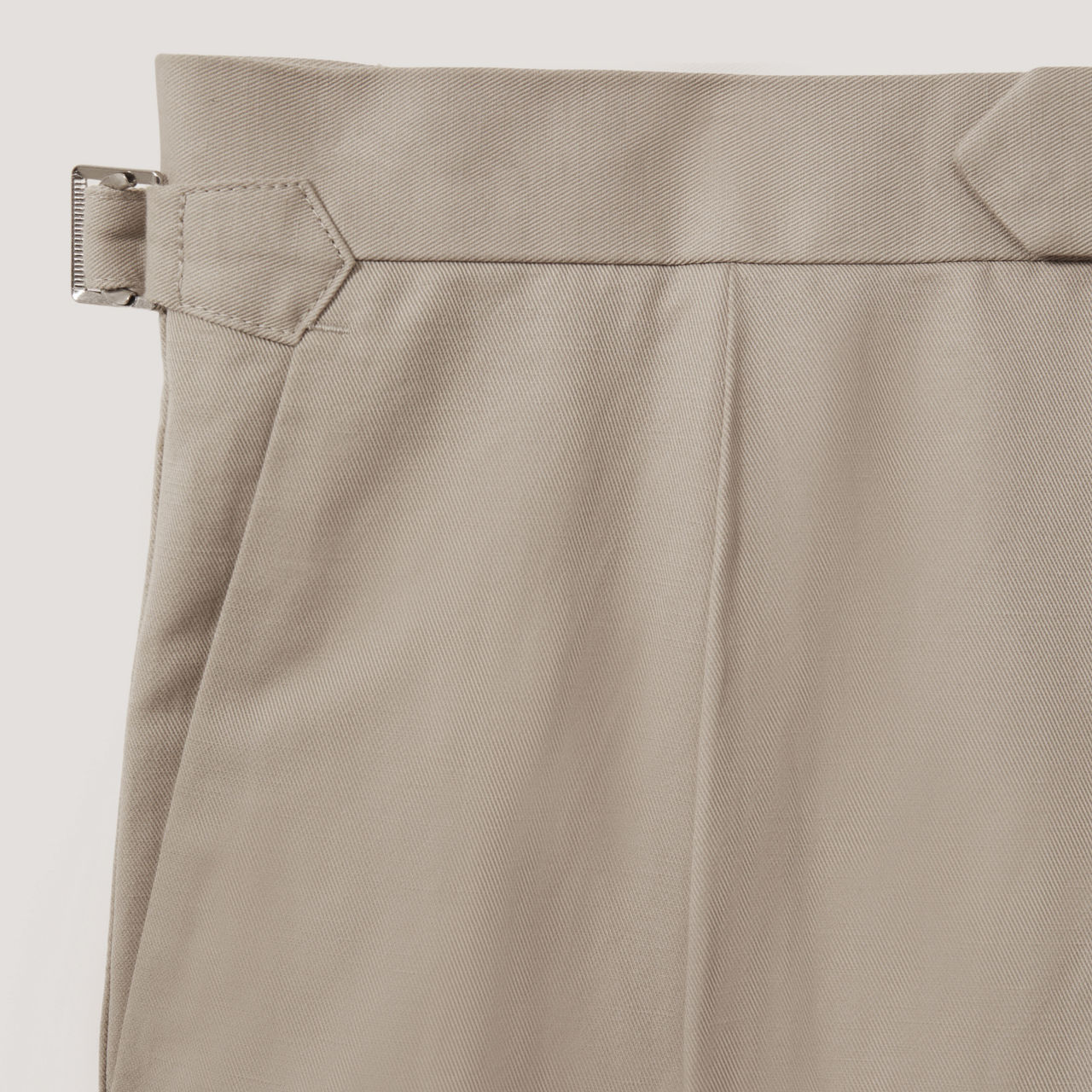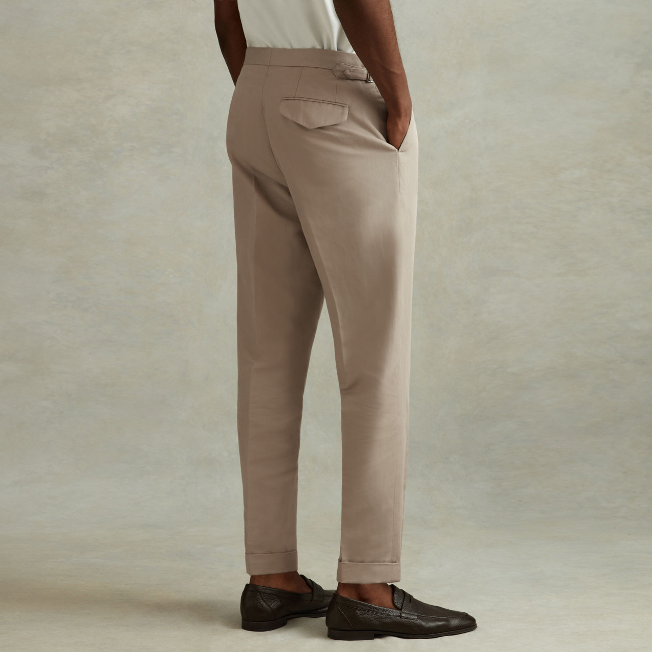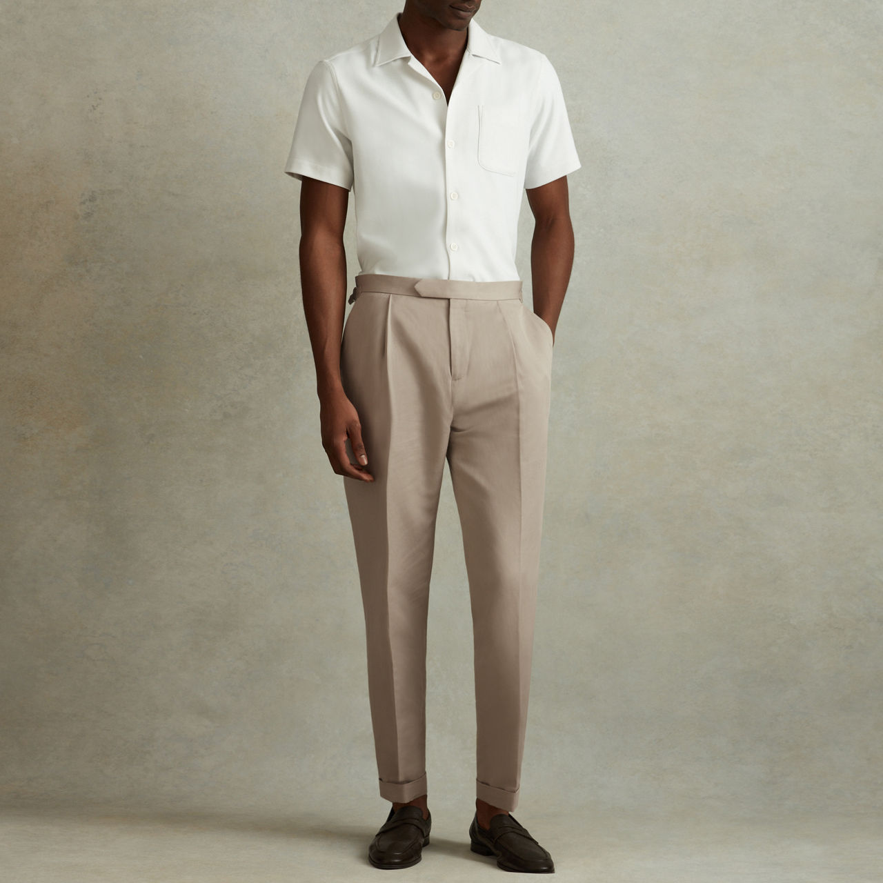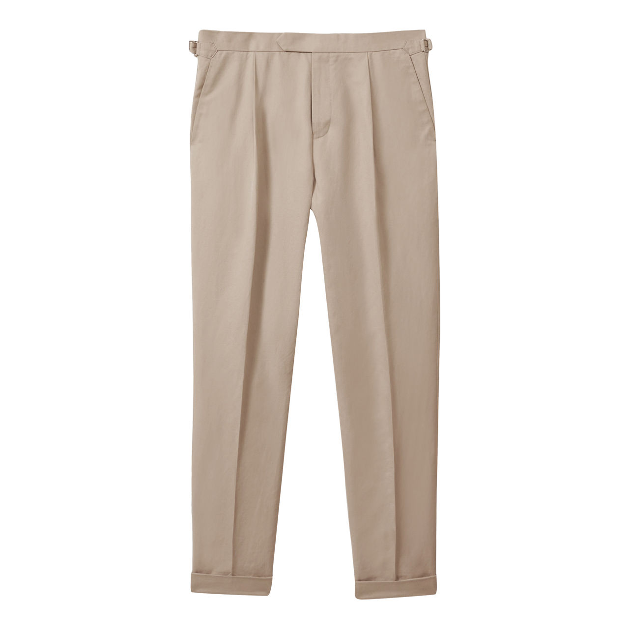 - Side waist adjusters, front pleats, tapered silhouette, turned-up hems, side pockets