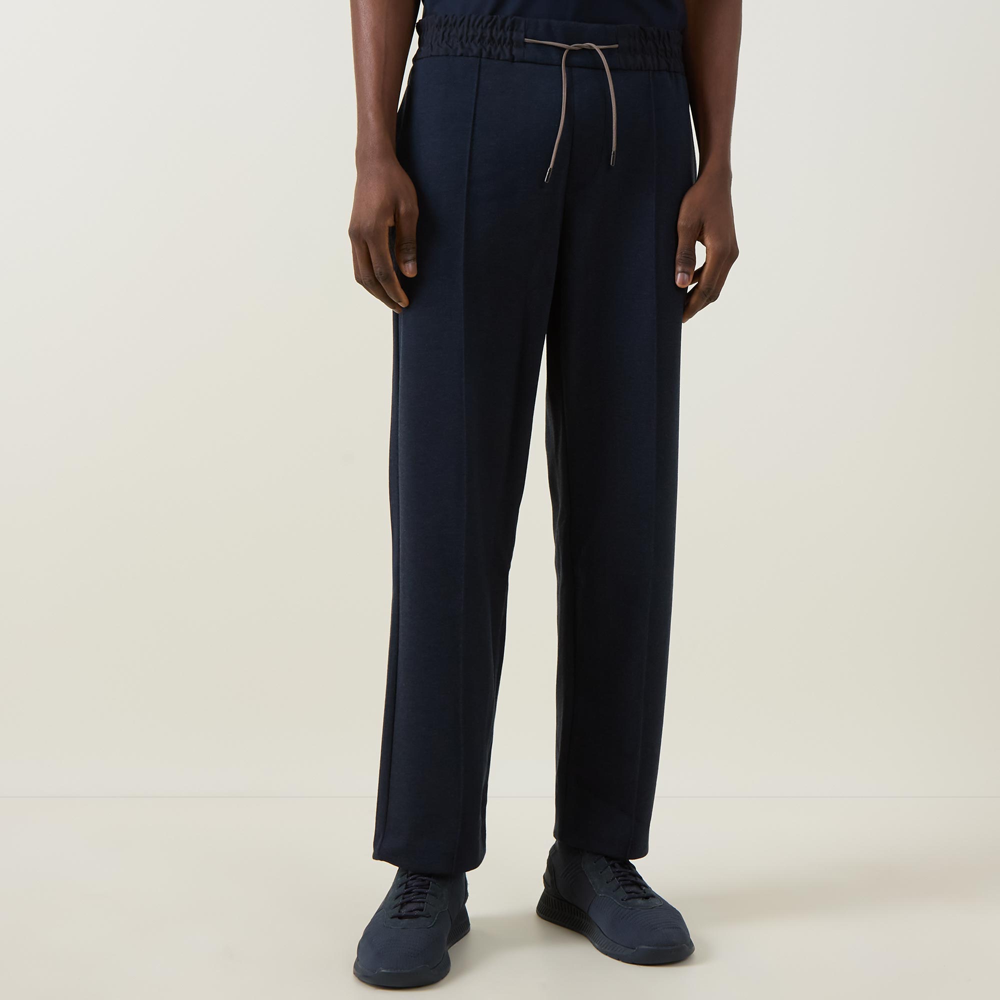 - Elasticated waist, drawstring fastening, logo detail, pressed creases on front and back, side pockets, back pocket