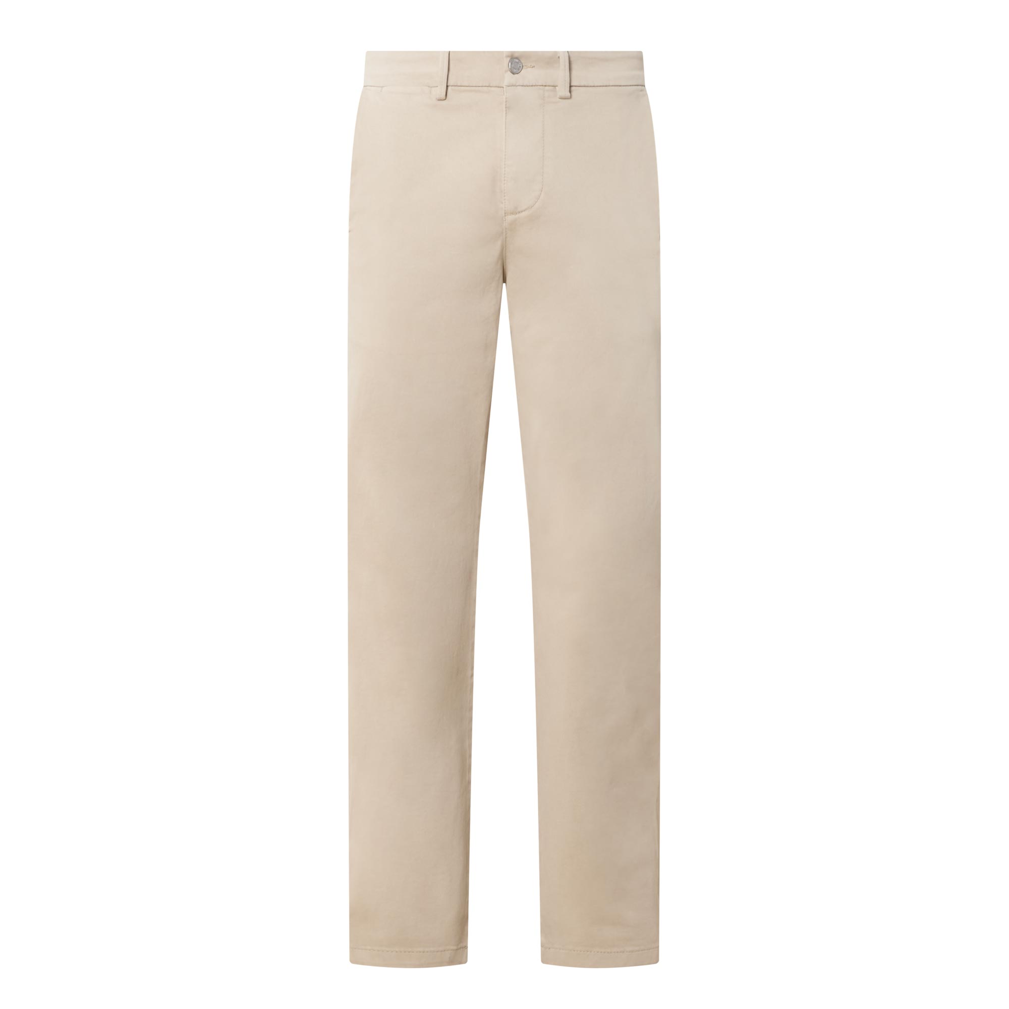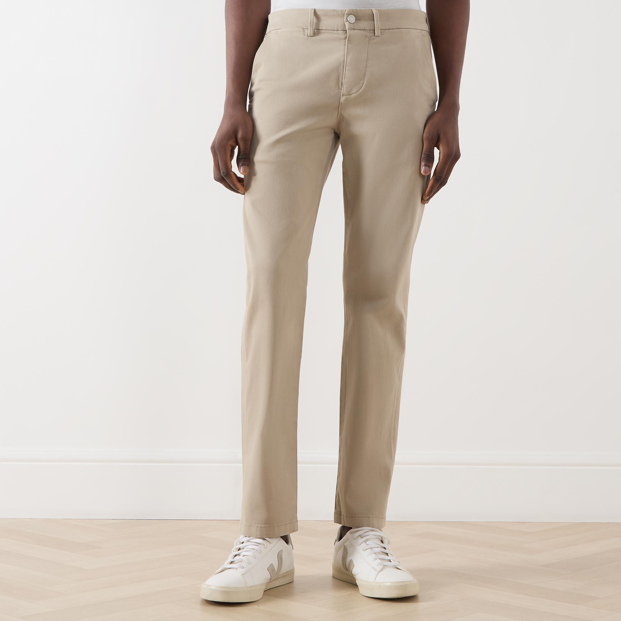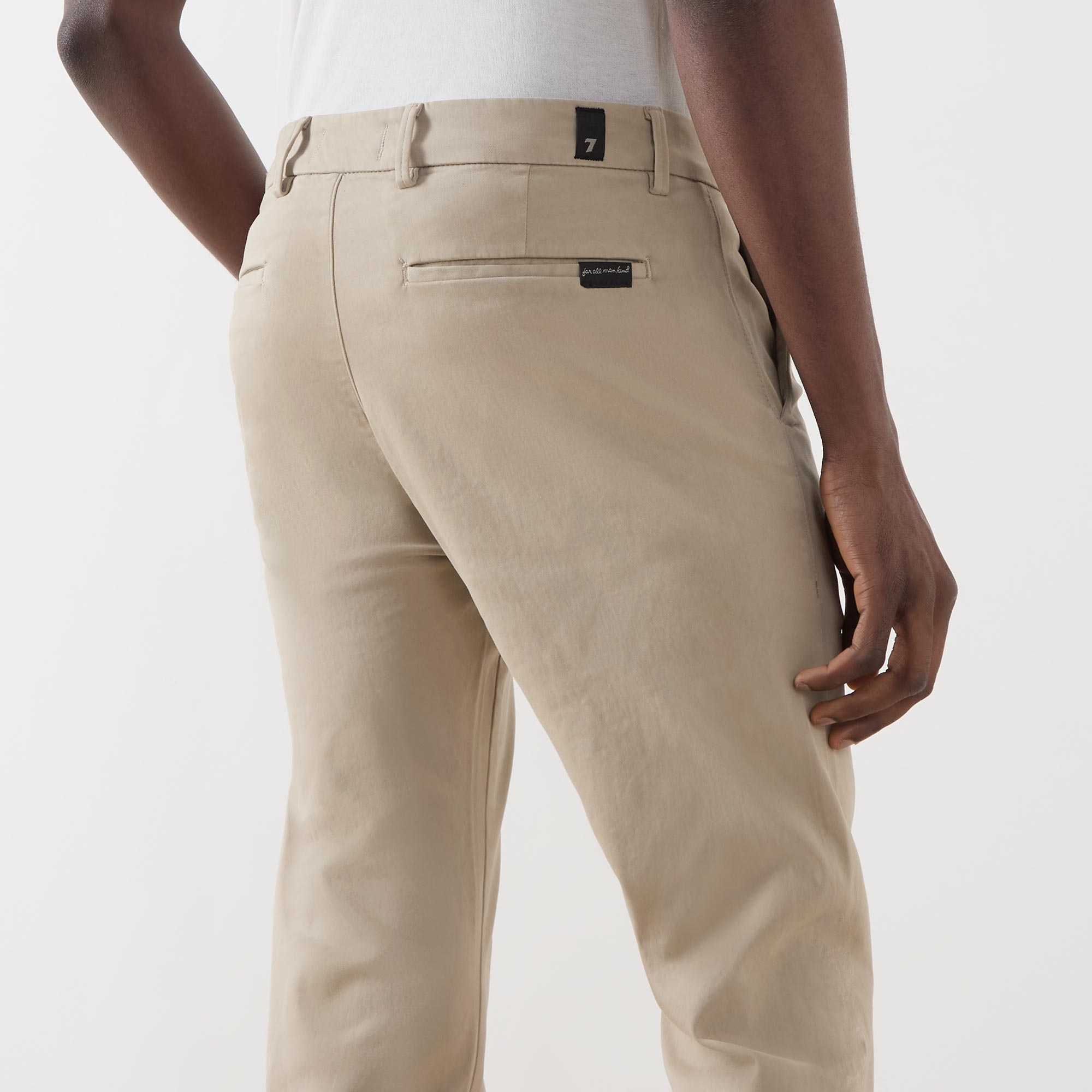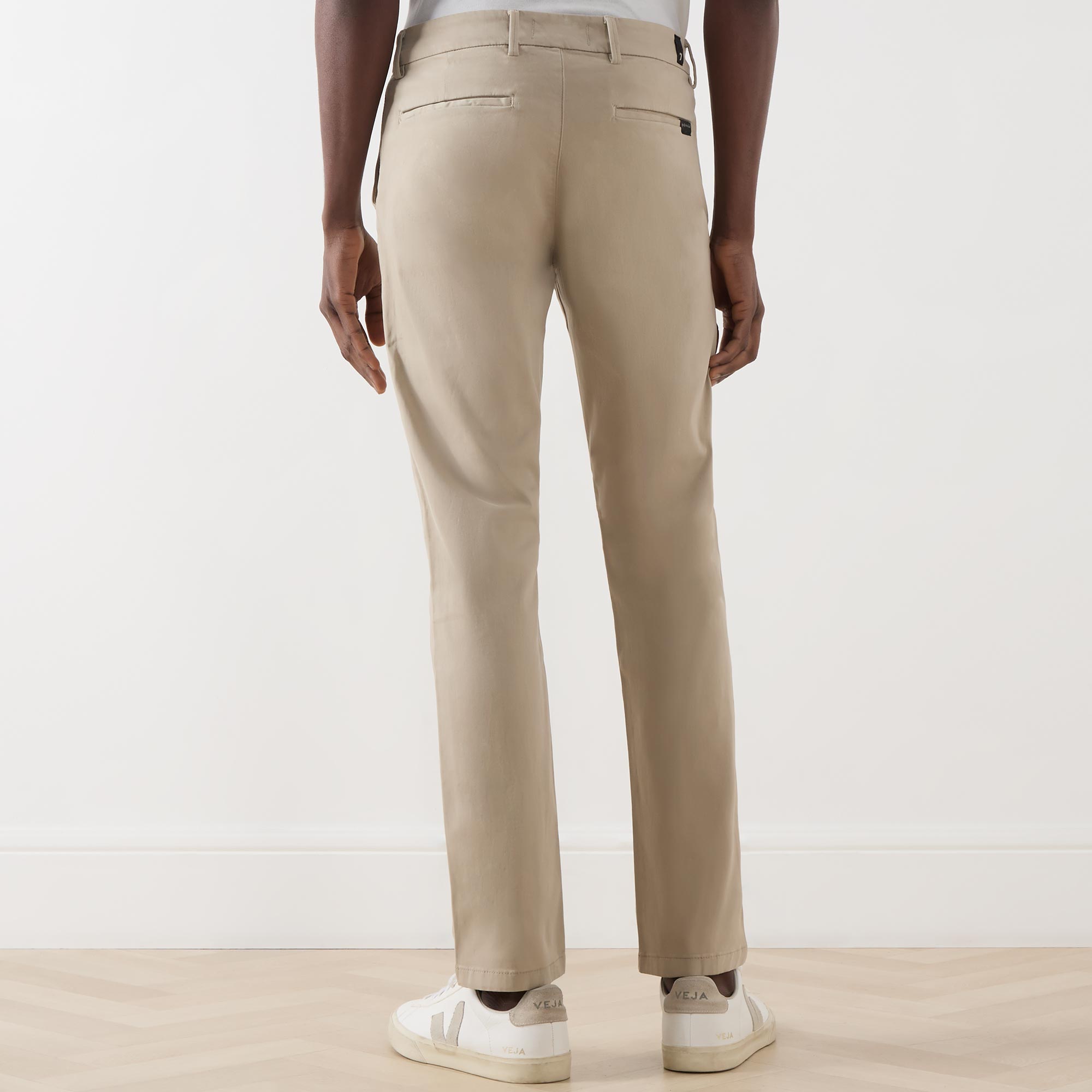 - Mid rise, slim leg, belt loops, concealed fly and button fastening, two side entry pockets, two rear jetted pockets, clean hems, tonal stitching, logo branding, smooth finish