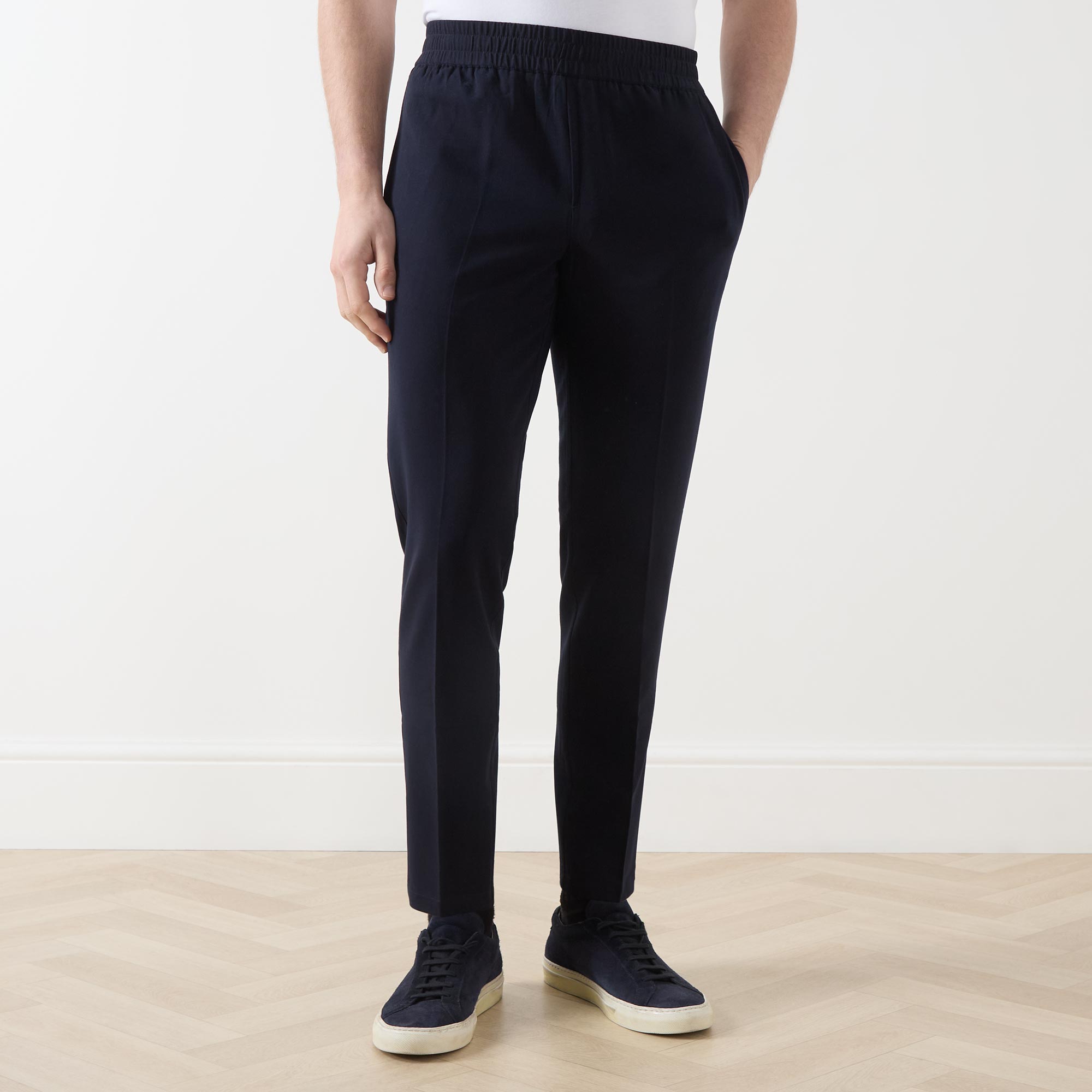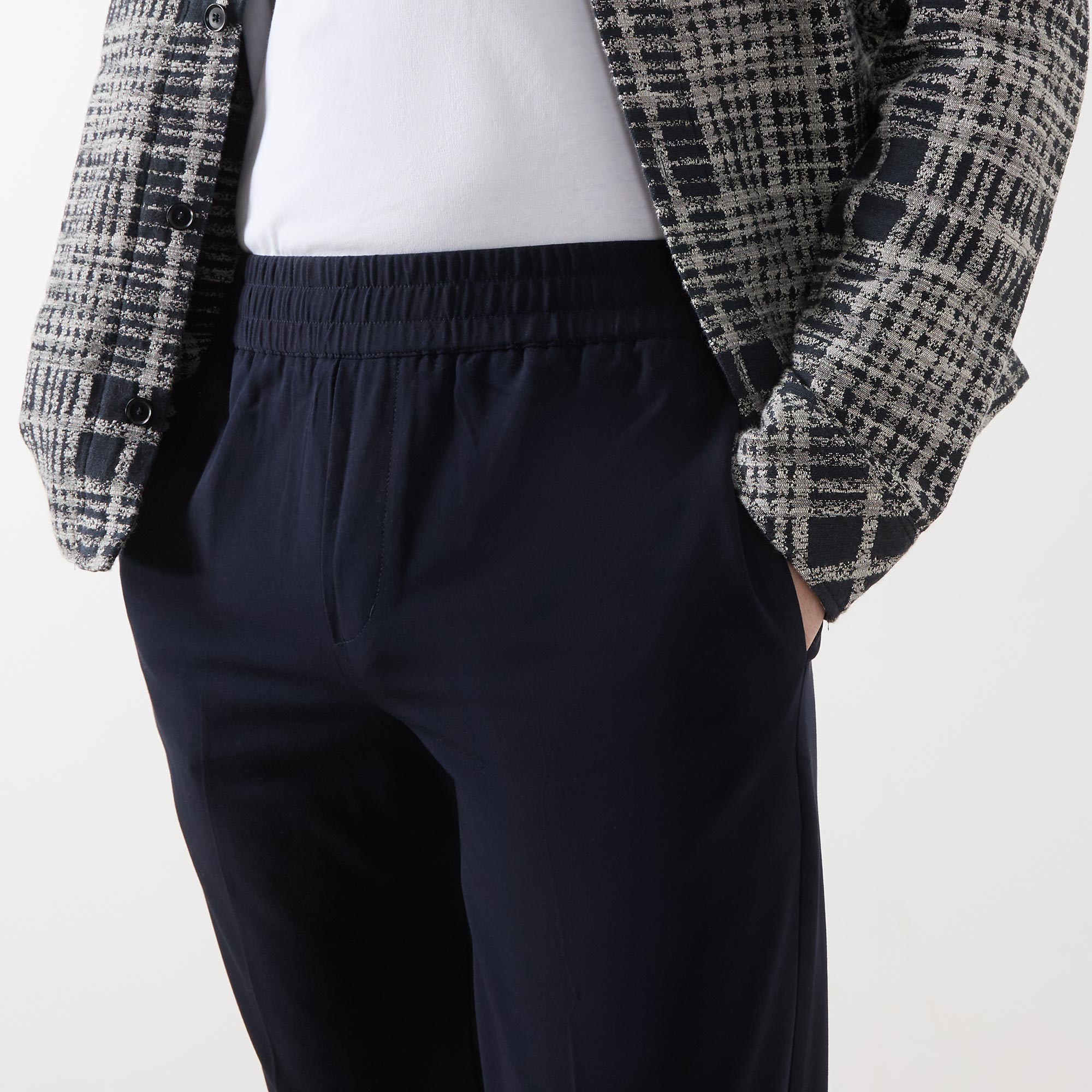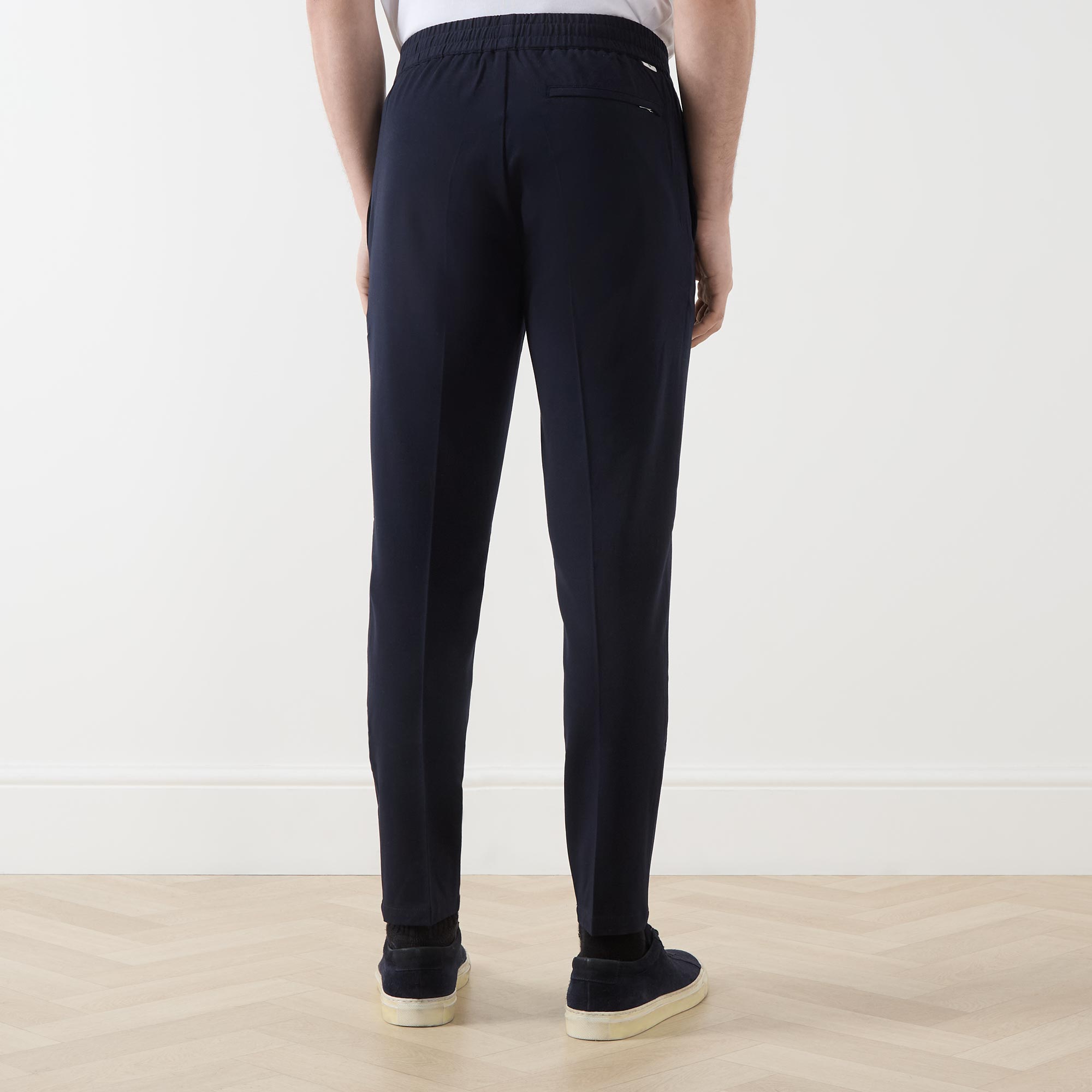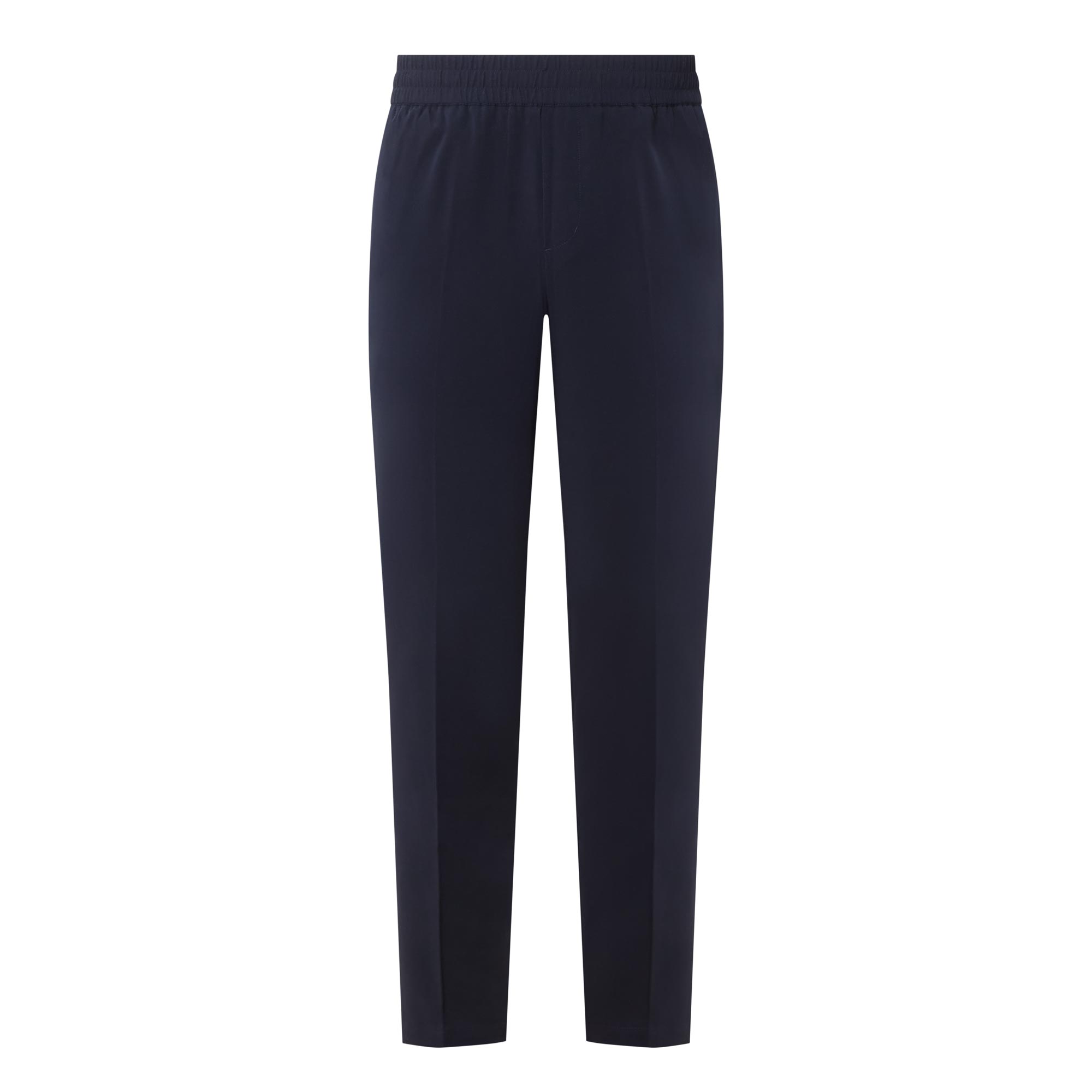 - Mid-rise, tapered leg, elasticated waistband, two side slit pockets, two rear welt pockets, clean hems, pressed creases, logo detail