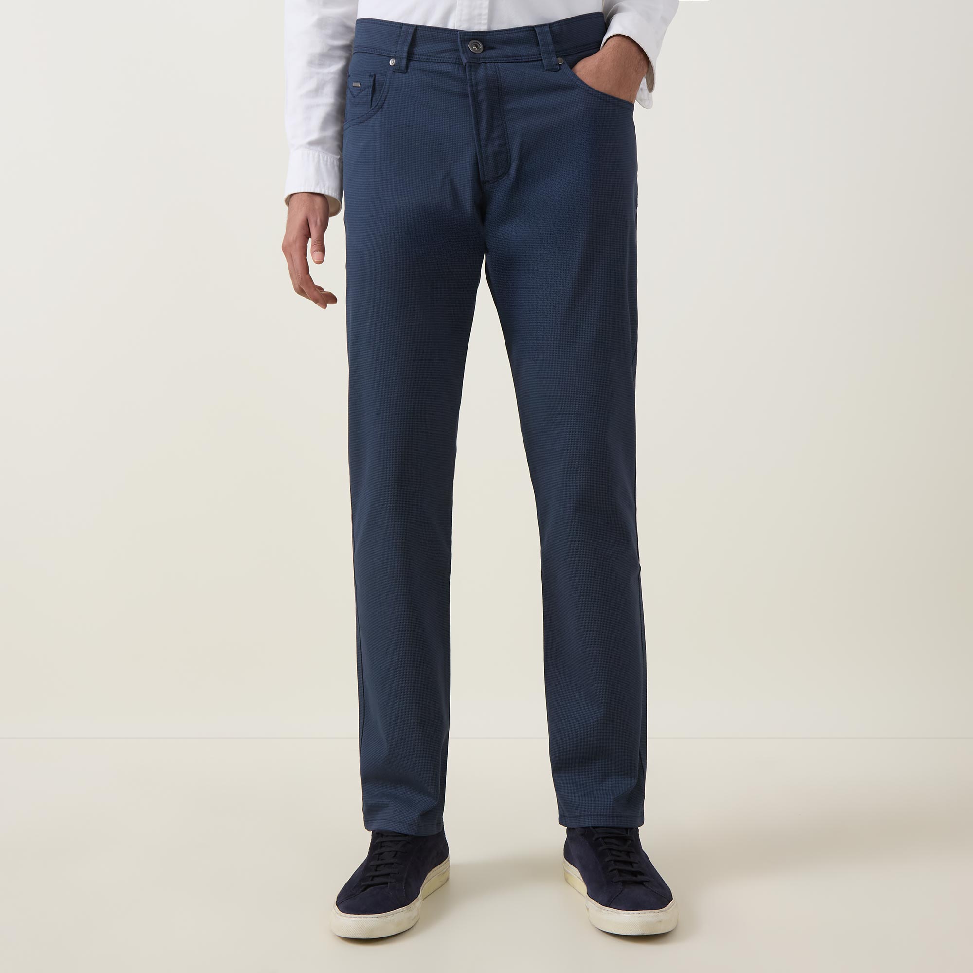 - Button and fly zip fastening, belt loops, five-pocket style, straight-cut legs, logo badge