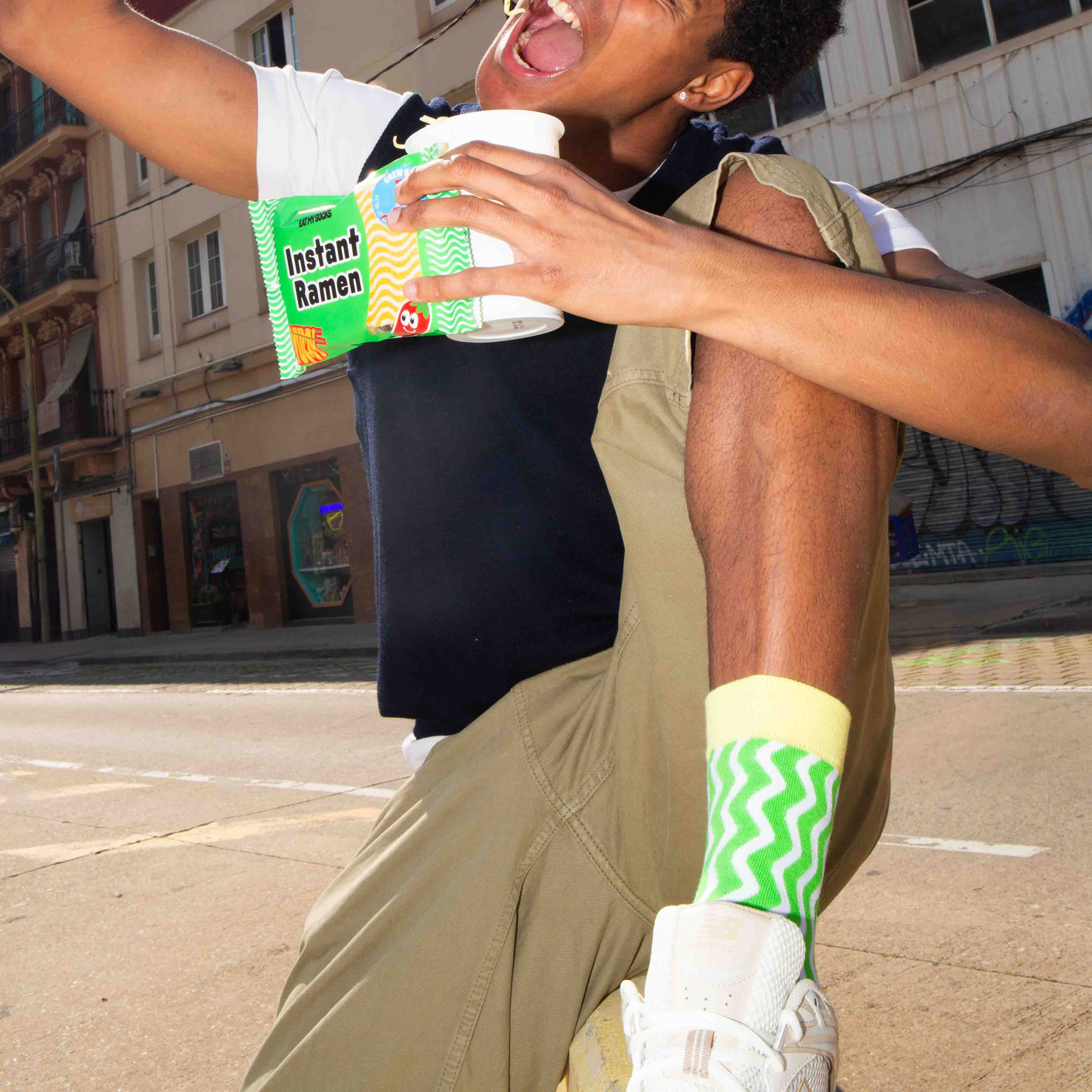 - Chili ramen design, ribbed trims, striped detailing, crew style, one pair