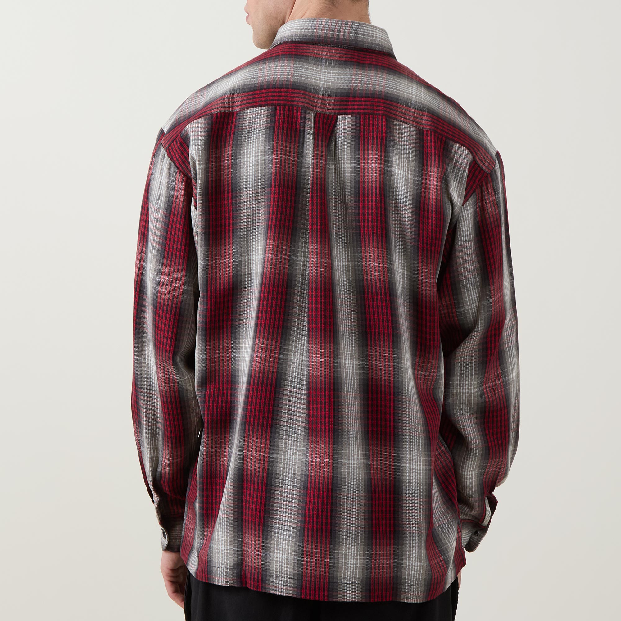 - Point collar, long sleeves, buttoned cuffs, front button fastening, one chest patch pocket, curved hem, rear box pleat, check print, logo badge