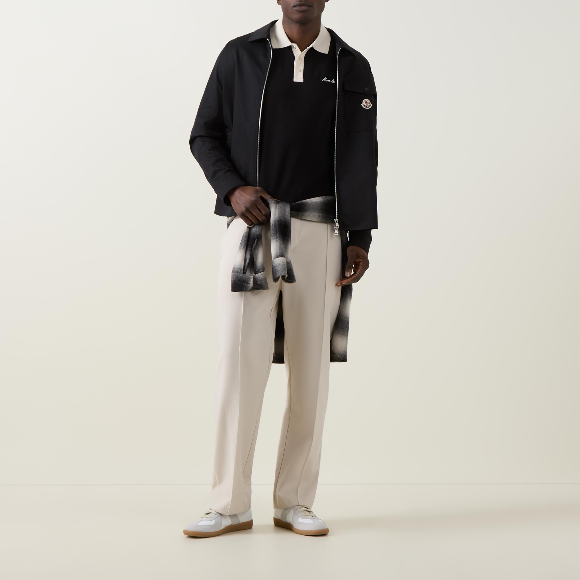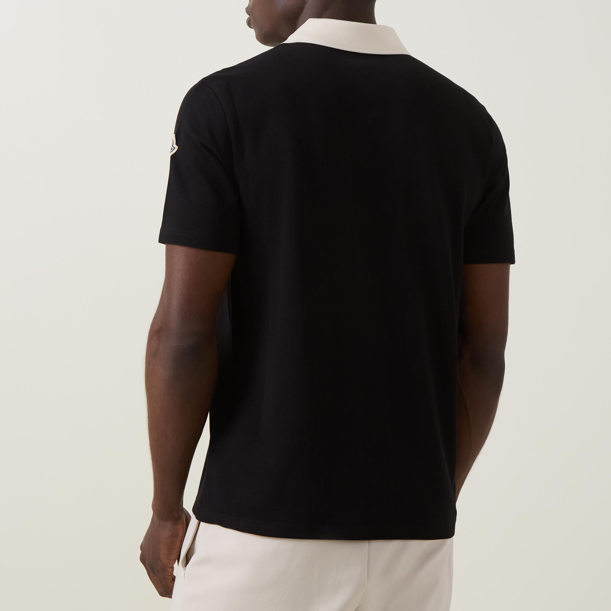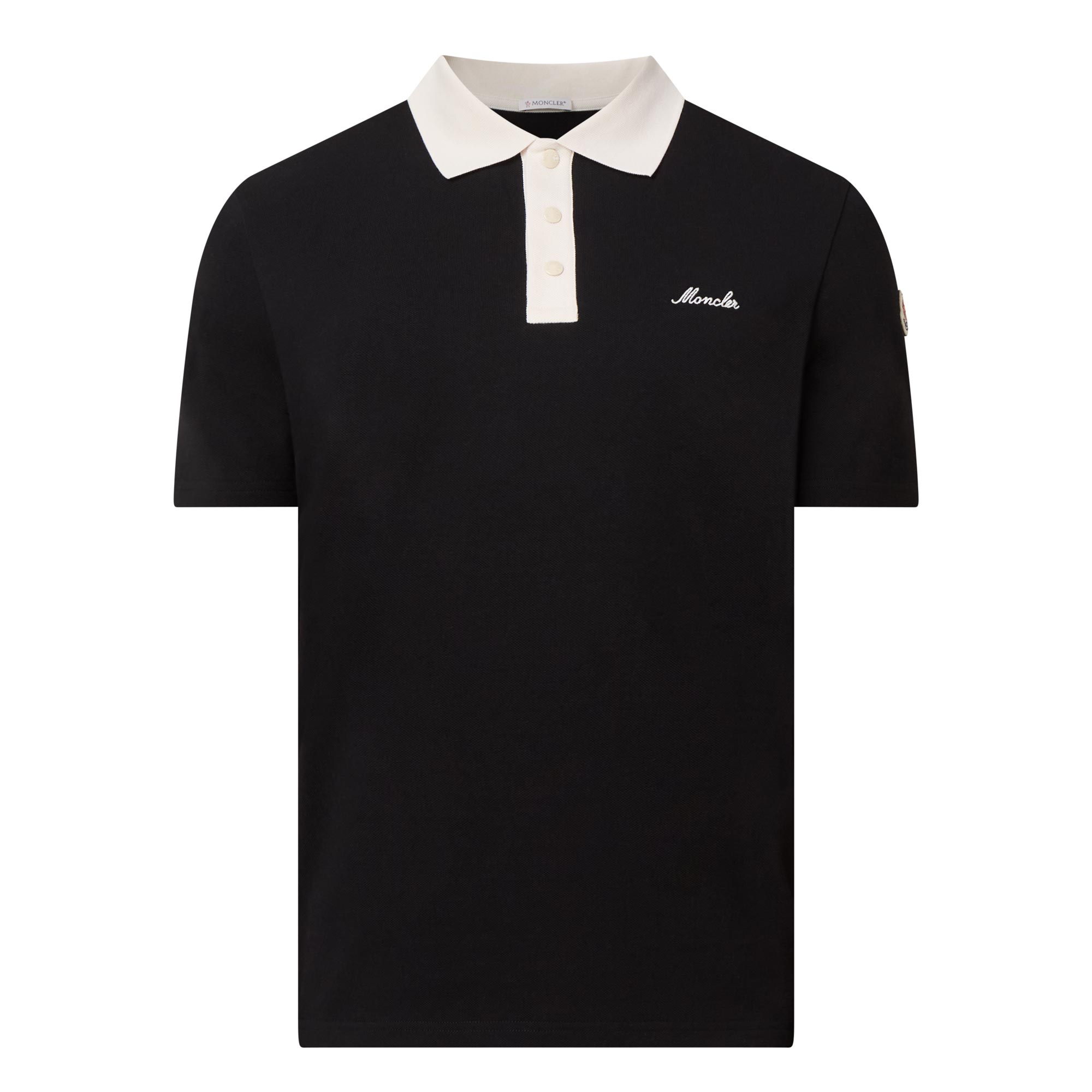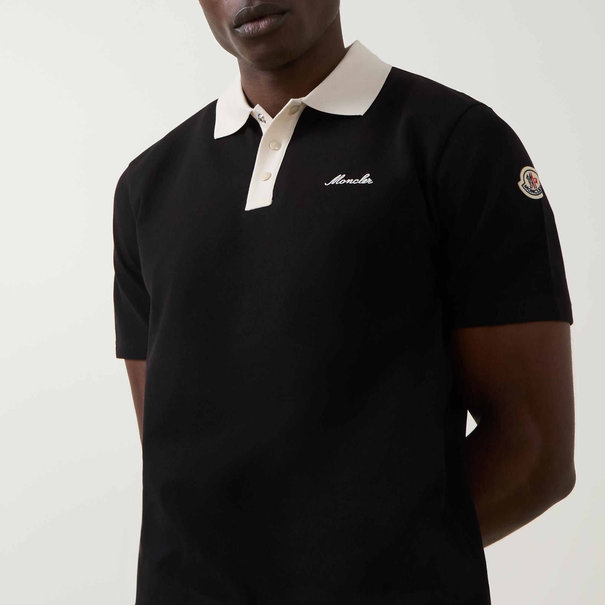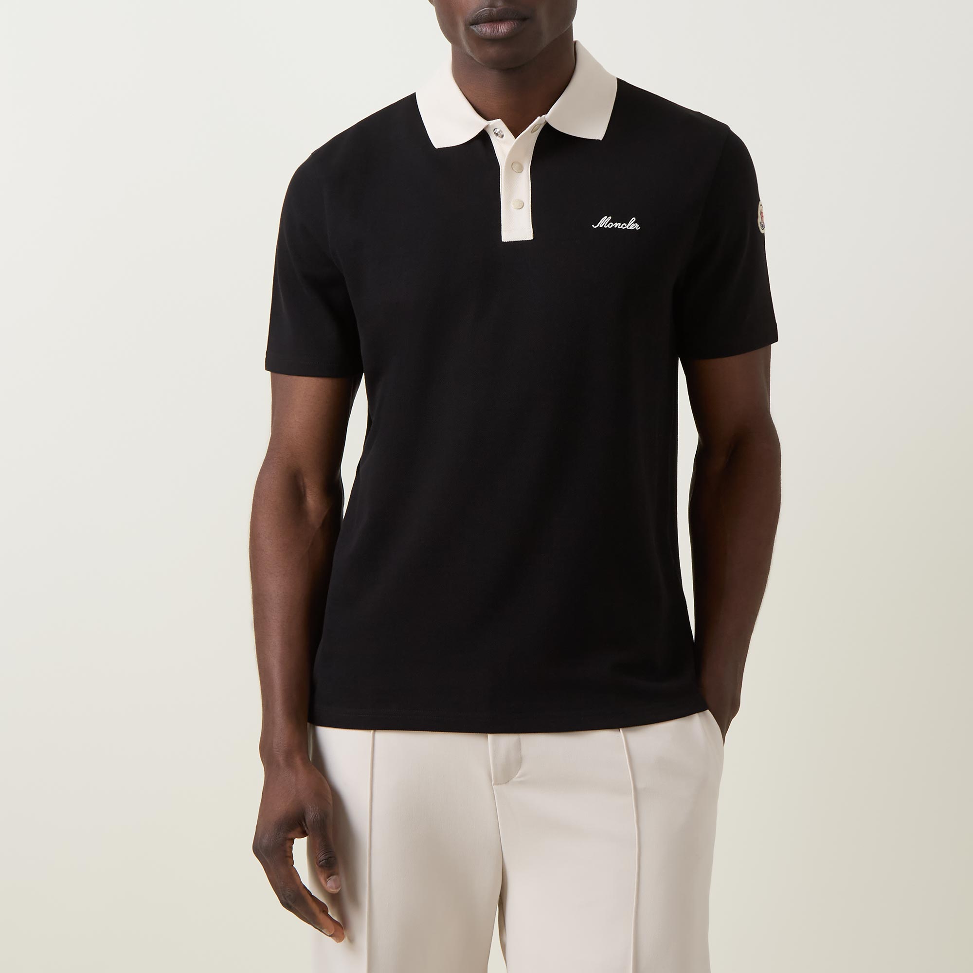 - Contrasting polo collar, short sleeves, three-button placket, logo script embroidery, signature logo badge on left sleeve, tonal stitching, straight hemline, smooth fabric
