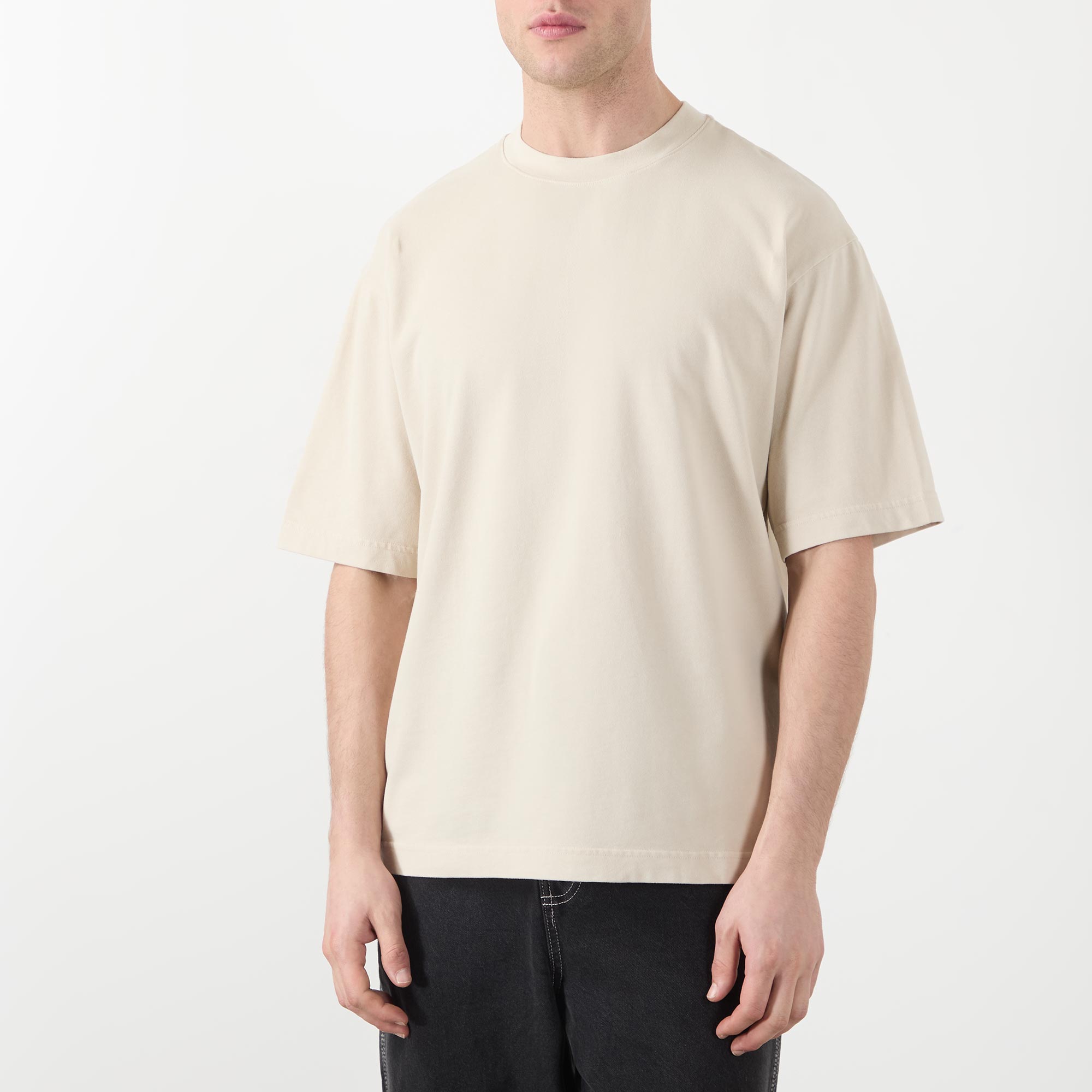 - Crew neckline, dropped shoulders, short sleeves, straight hem, rear logo detail, tonal stitching, smooth finish