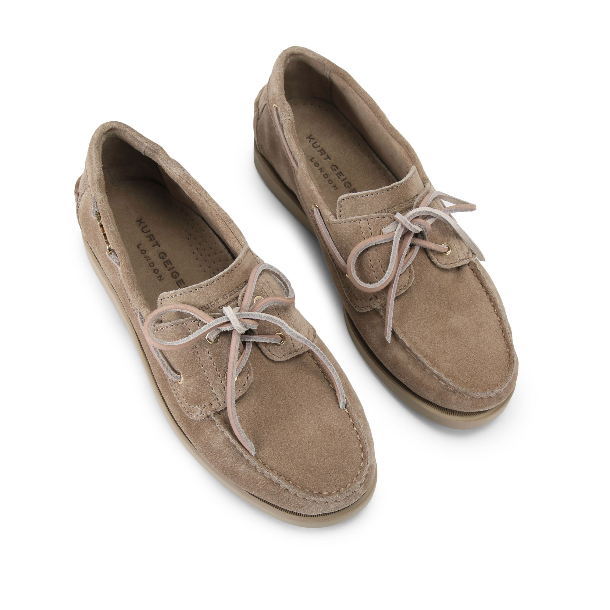 - Deck silhouette, suede leather, bow detail, gunmetal loops, branding details