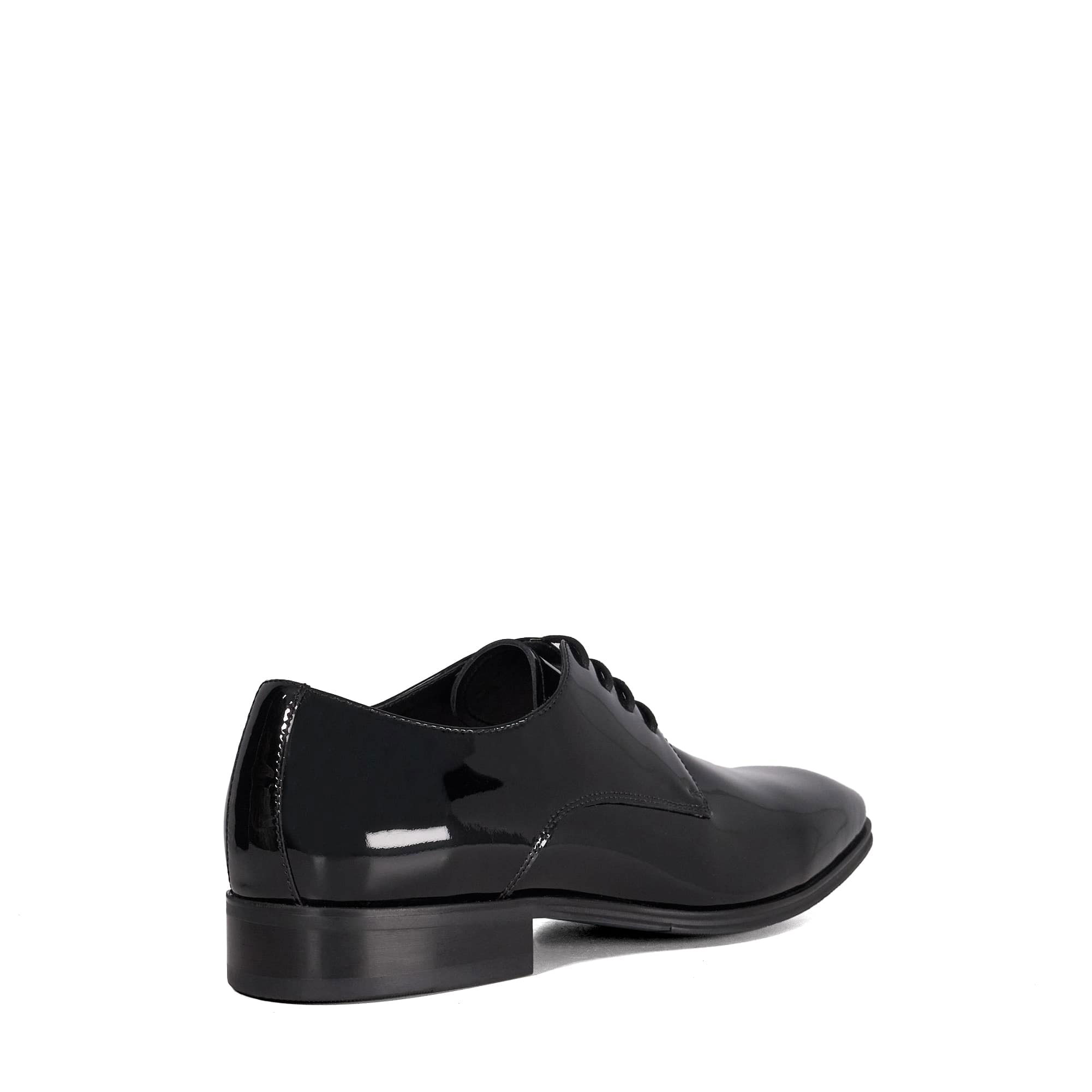 - Gibson style, smooth leather, almond toe, low stacked heel, patent finish