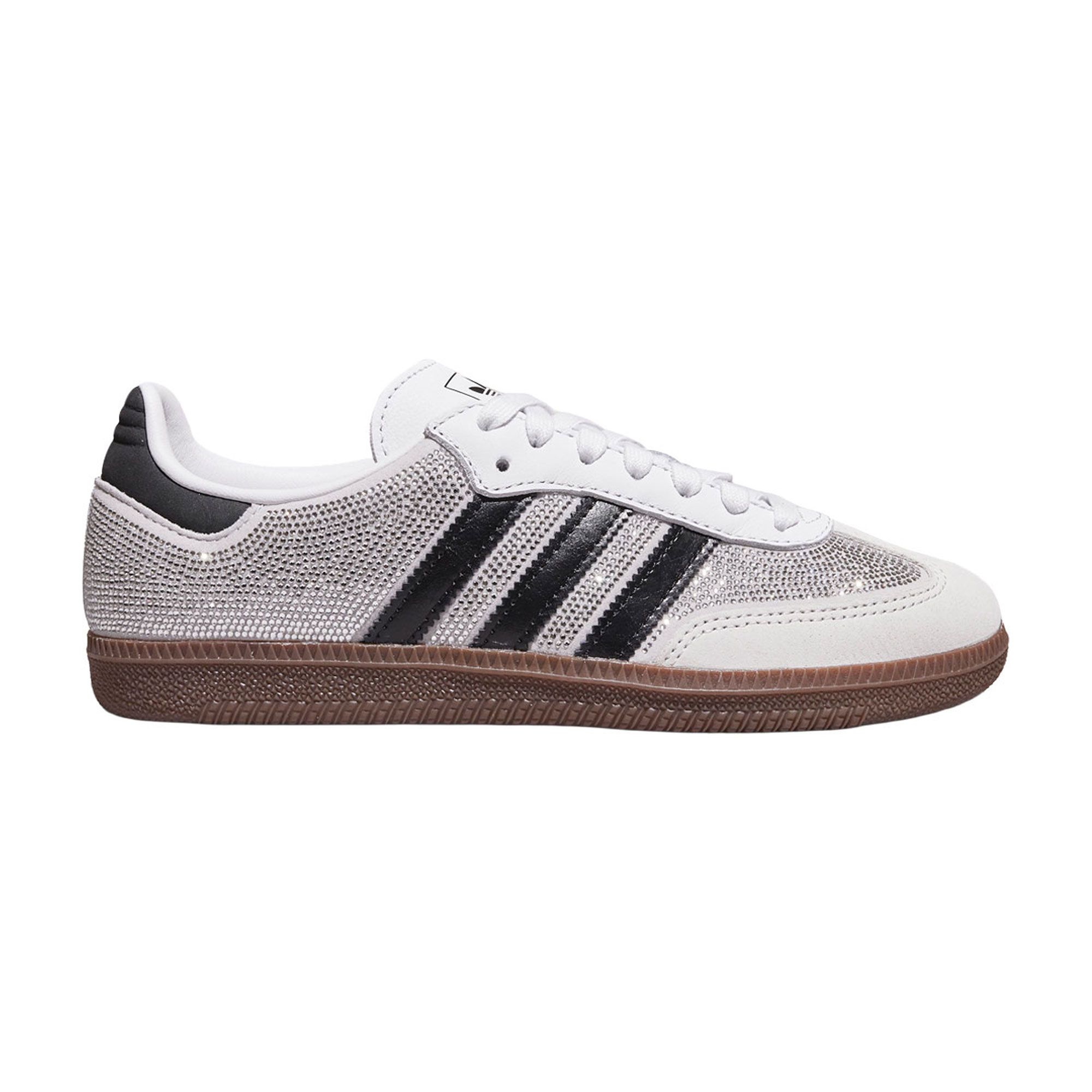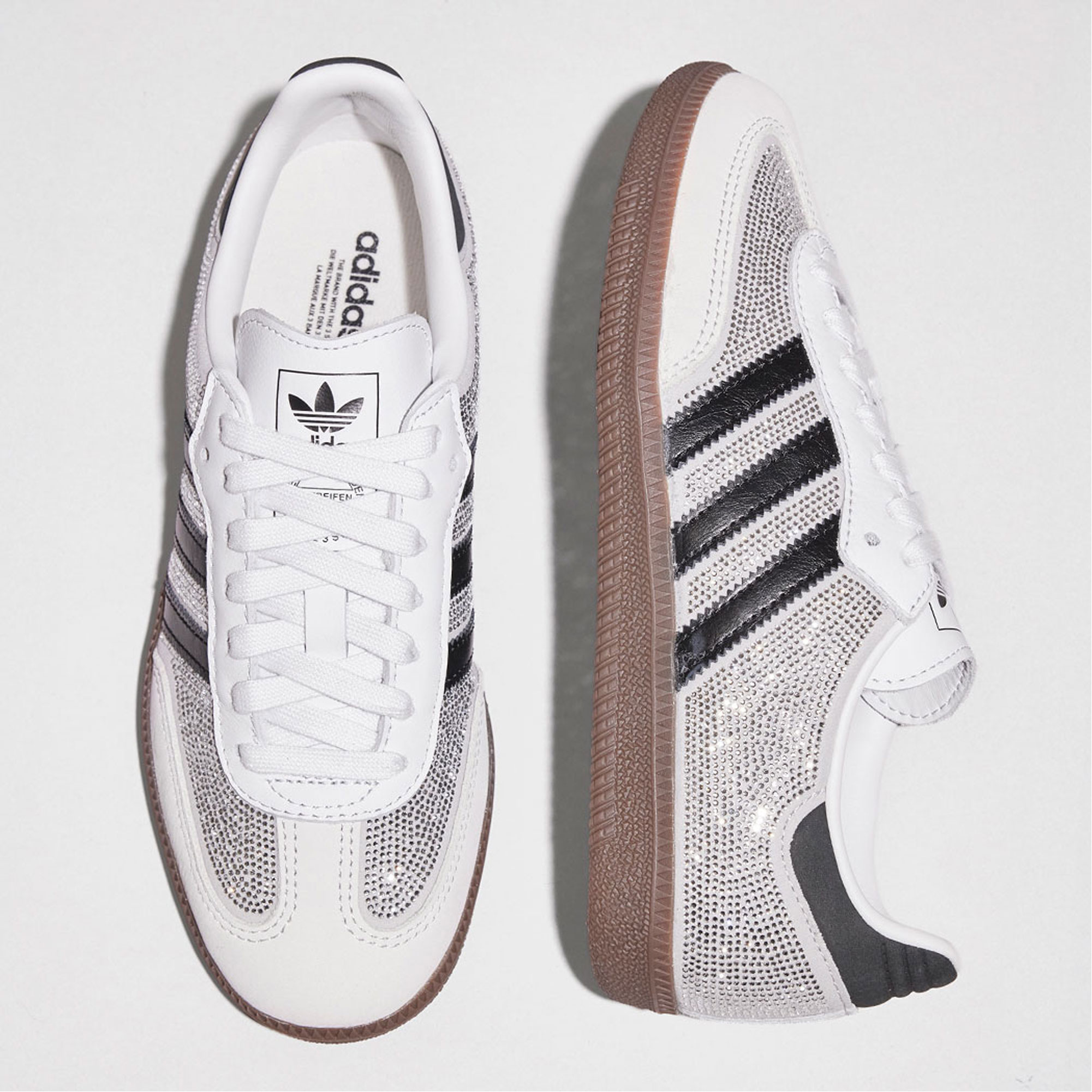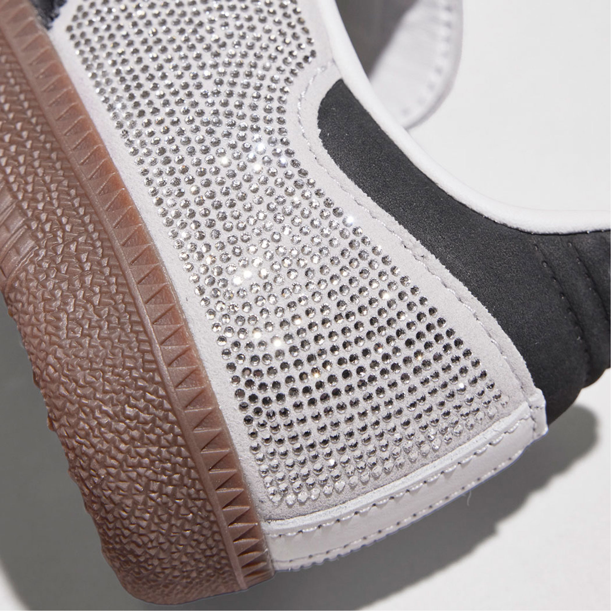 - Luxury Samba reinterpretation, crystal embellished upper, contrasting leather detailing, low-profile silhouette, gum rubber outsole, statement finish