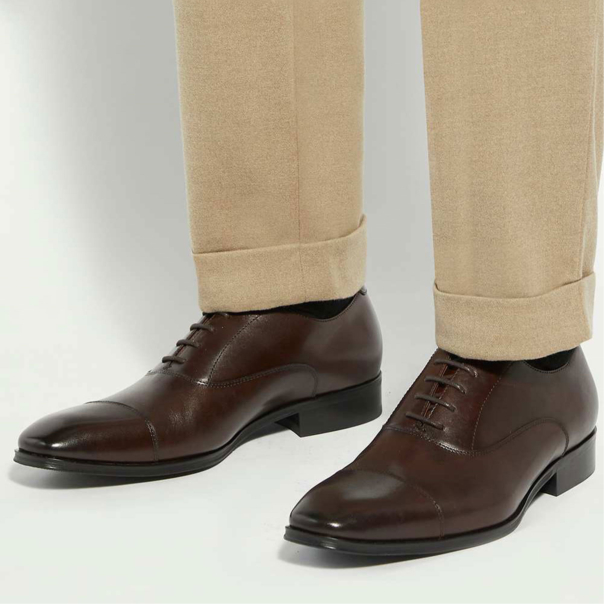 - Oxford style, lace-up fastening, slim silhouette, closed lacing, stitched toe-cap, five eyelet lacing, polished finish, contrast welt, stitched sole, low flat heel, round toe